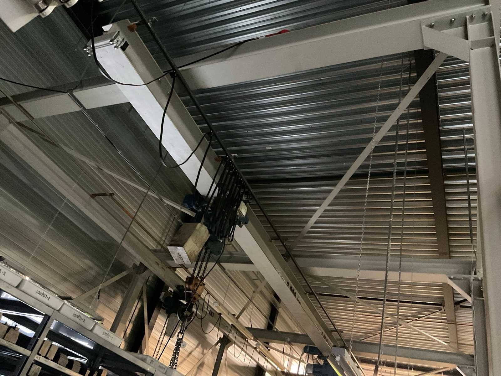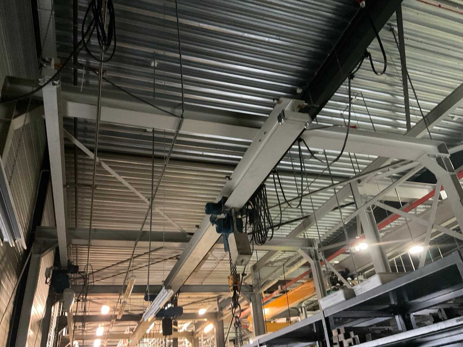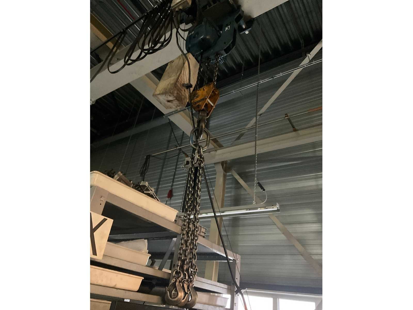 Bestaande uit portaal bestaande uit 10 kolommen voorzien van 1 elektro kettingtakel Demag cap. 3 ton met rijmotor 1 elektro kettingtakel Demag cap. 4 ton met rijmotor op middenrail 1 monorail met kettingtakel Demag cap. 2 ton met rijmotor Nee Merk: Demag Overspanning: 1600m Hijsvermogen: 4000kg Totale afmeting L: 16000mm Totale afmeting Breedte: 5800mm Totale afmeting Hoogte: 5500mm