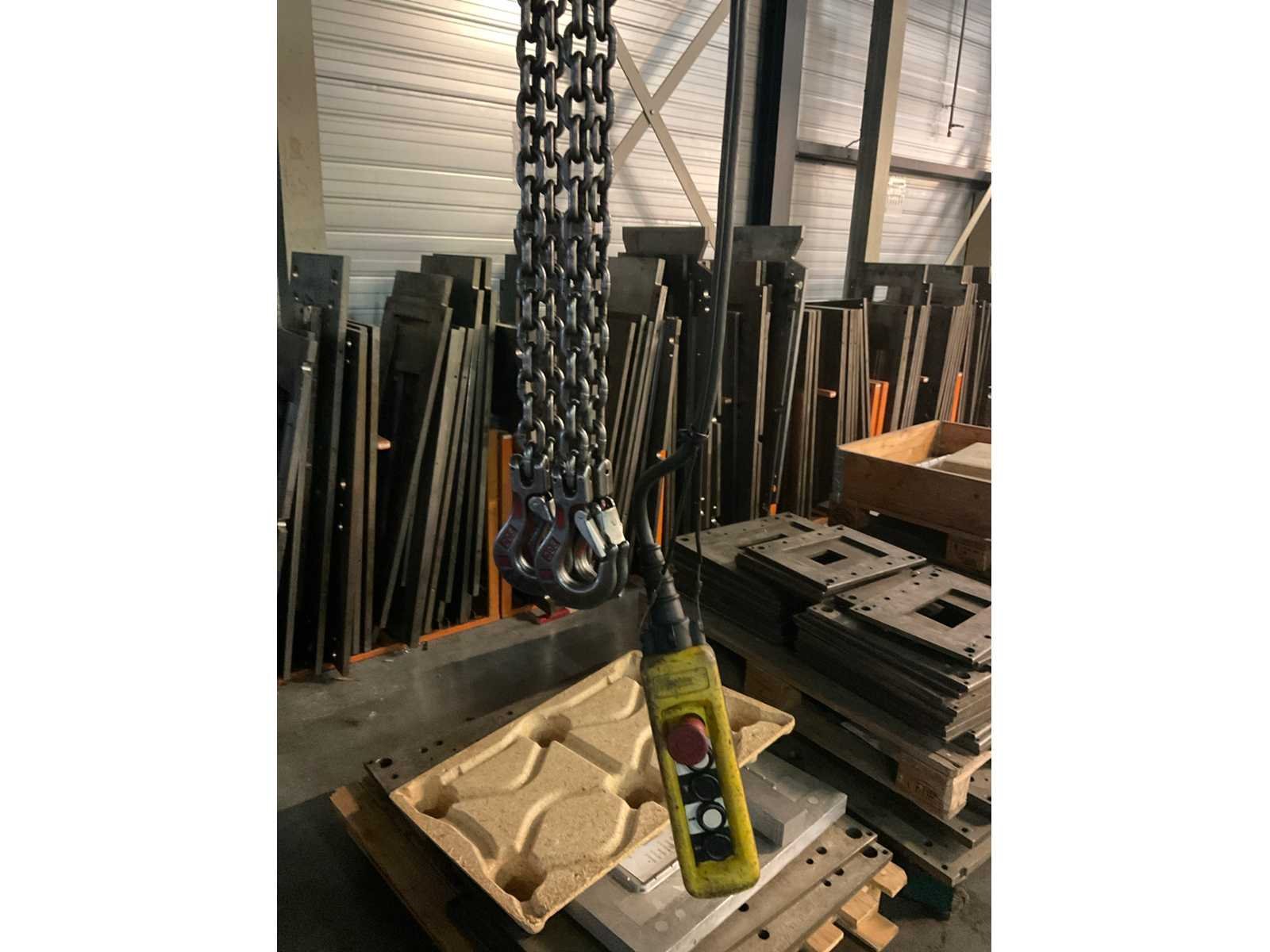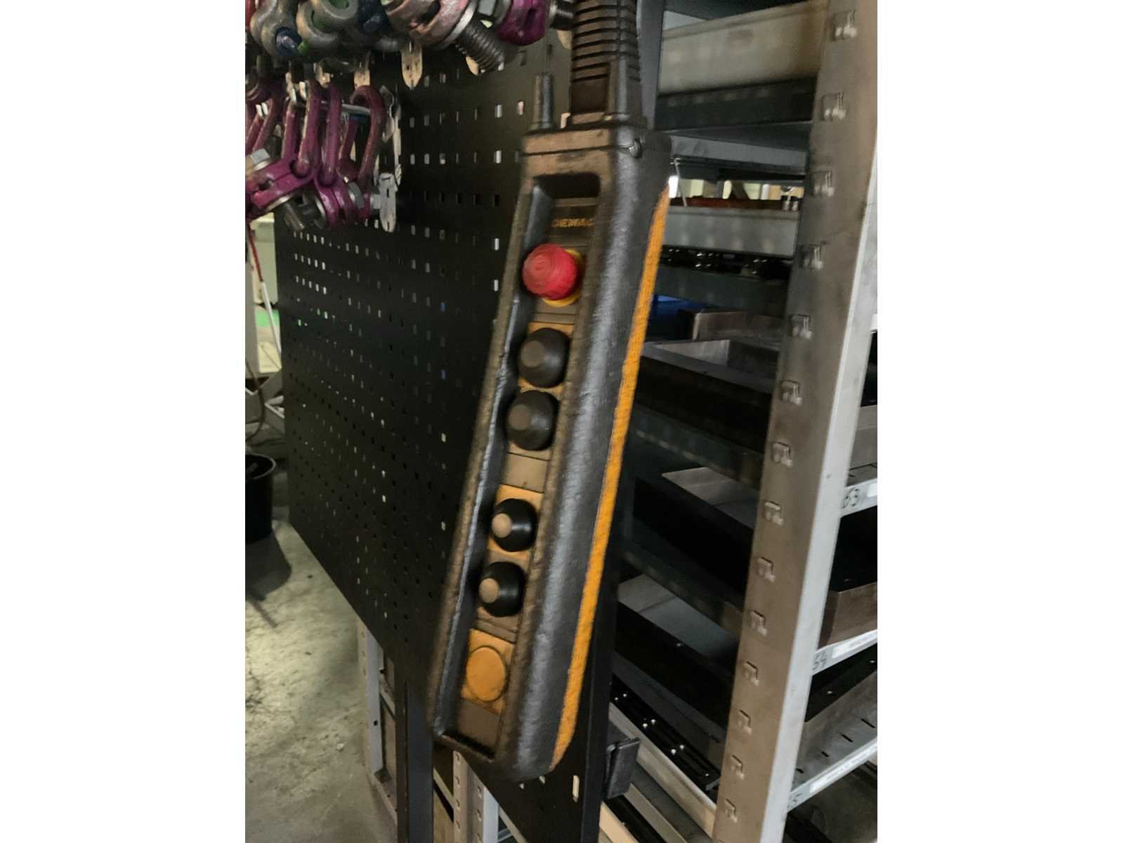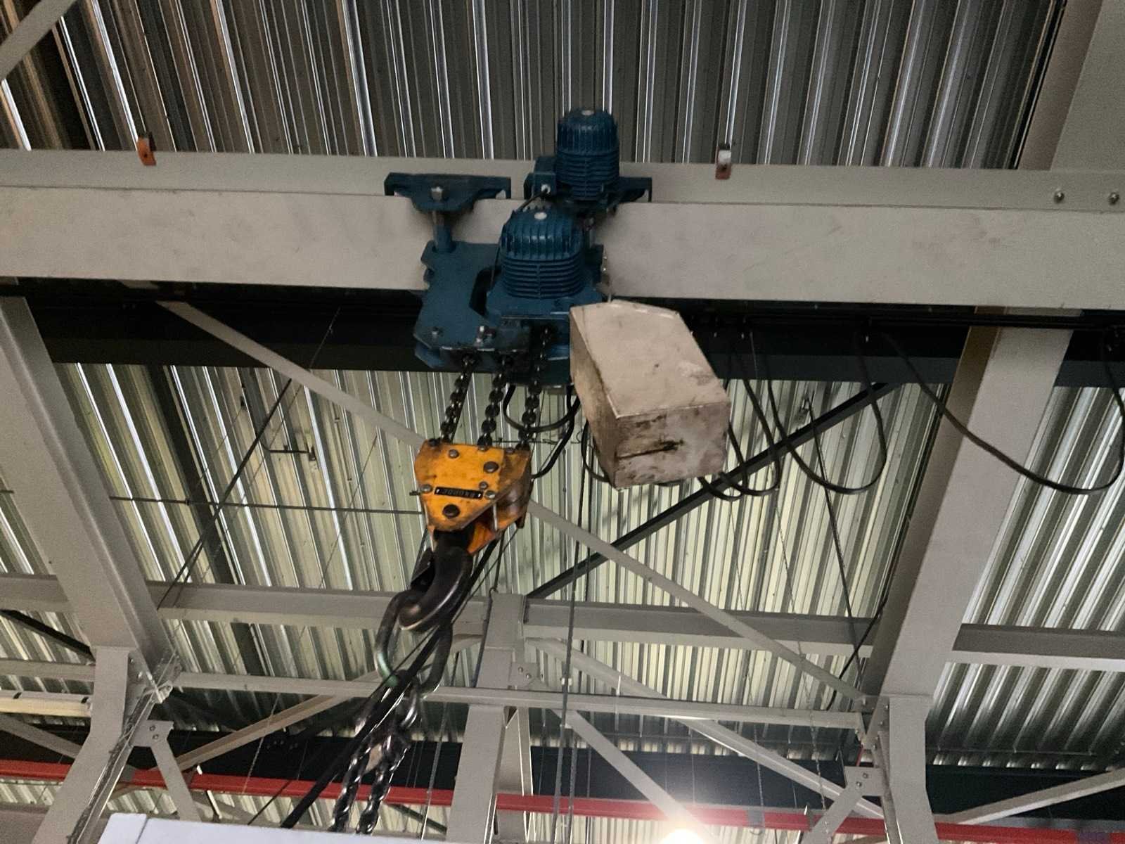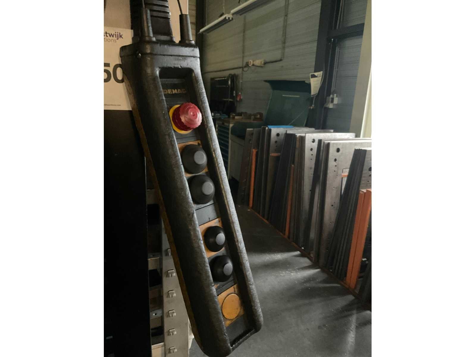 Bestaande uit portaal bestaande uit 10 kolommen voorzien van 1 elektro kettingtakel Demag cap. 3 ton met rijmotor 1 elektro kettingtakel Demag cap. 4 ton met rijmotor op middenrail 1 monorail met kettingtakel Demag cap. 2 ton met rijmotor Nee Merk: Demag Overspanning: 1600m Hijsvermogen: 4000kg Totale afmeting L: 16000mm Totale afmeting Breedte: 5800mm Totale afmeting Hoogte: 5500mm