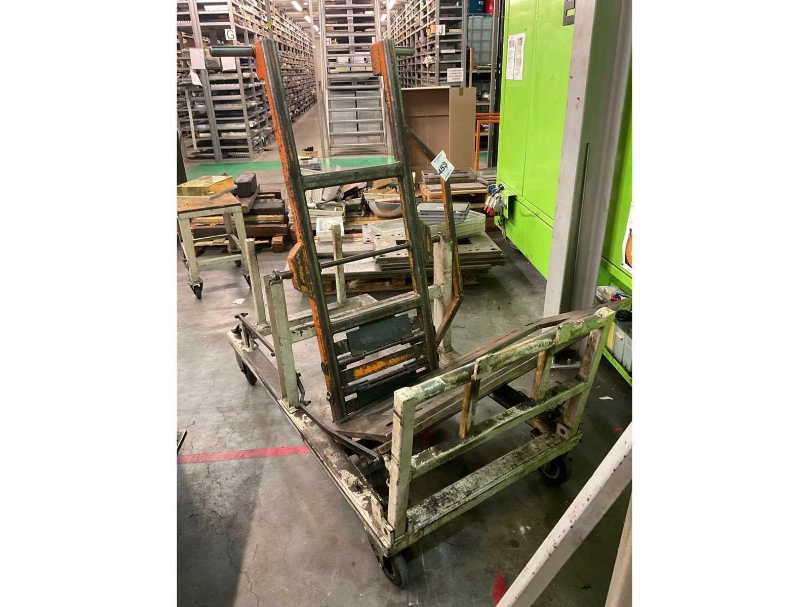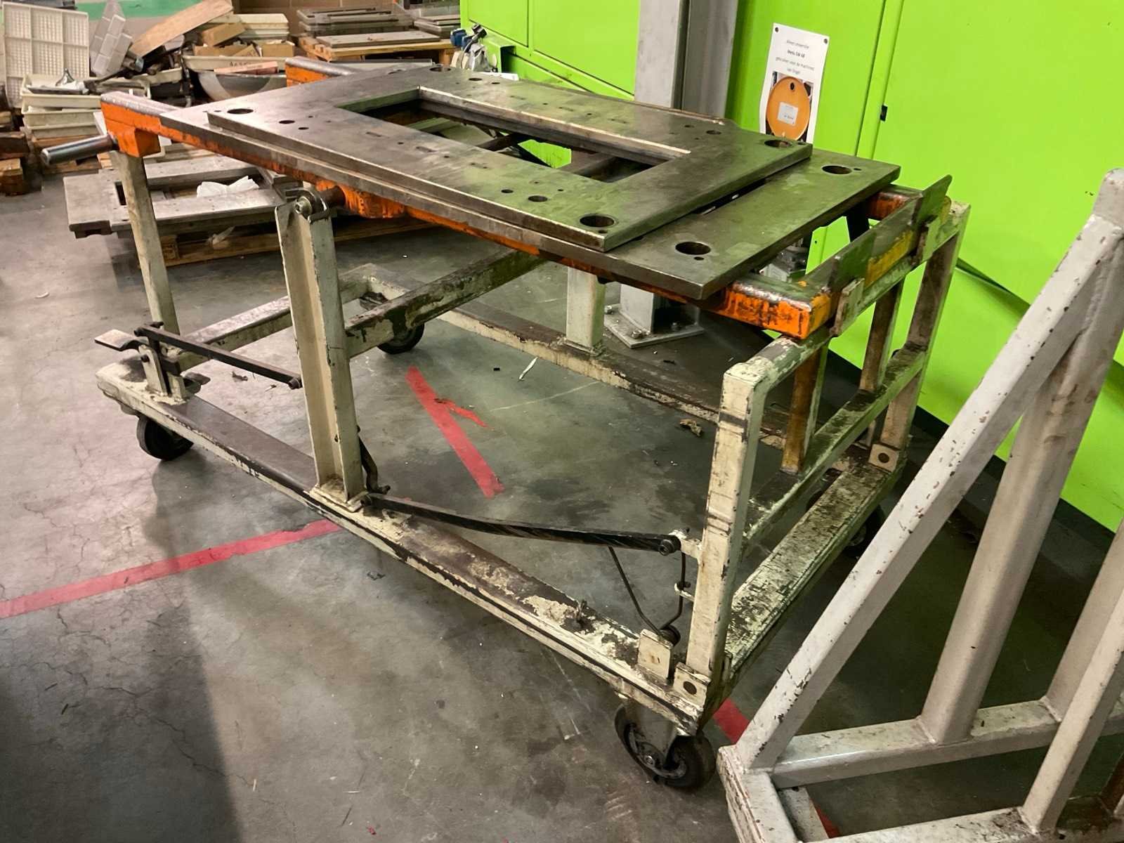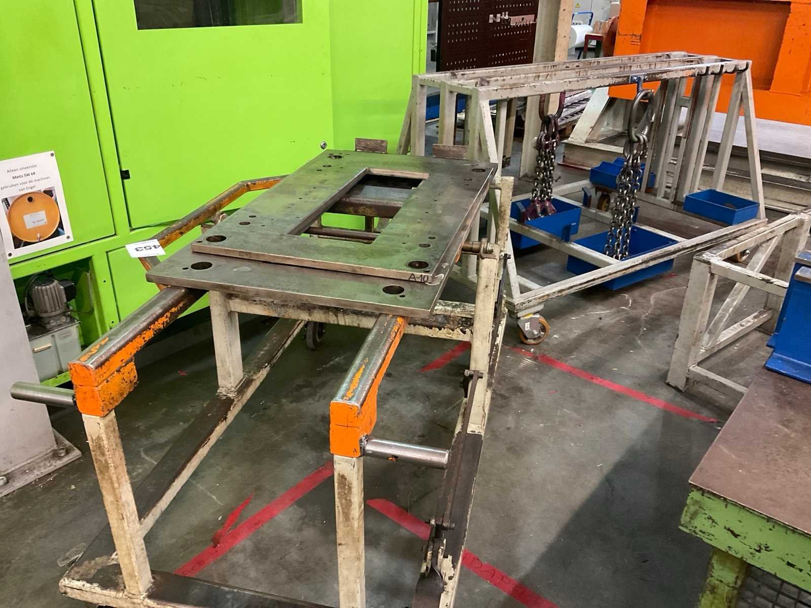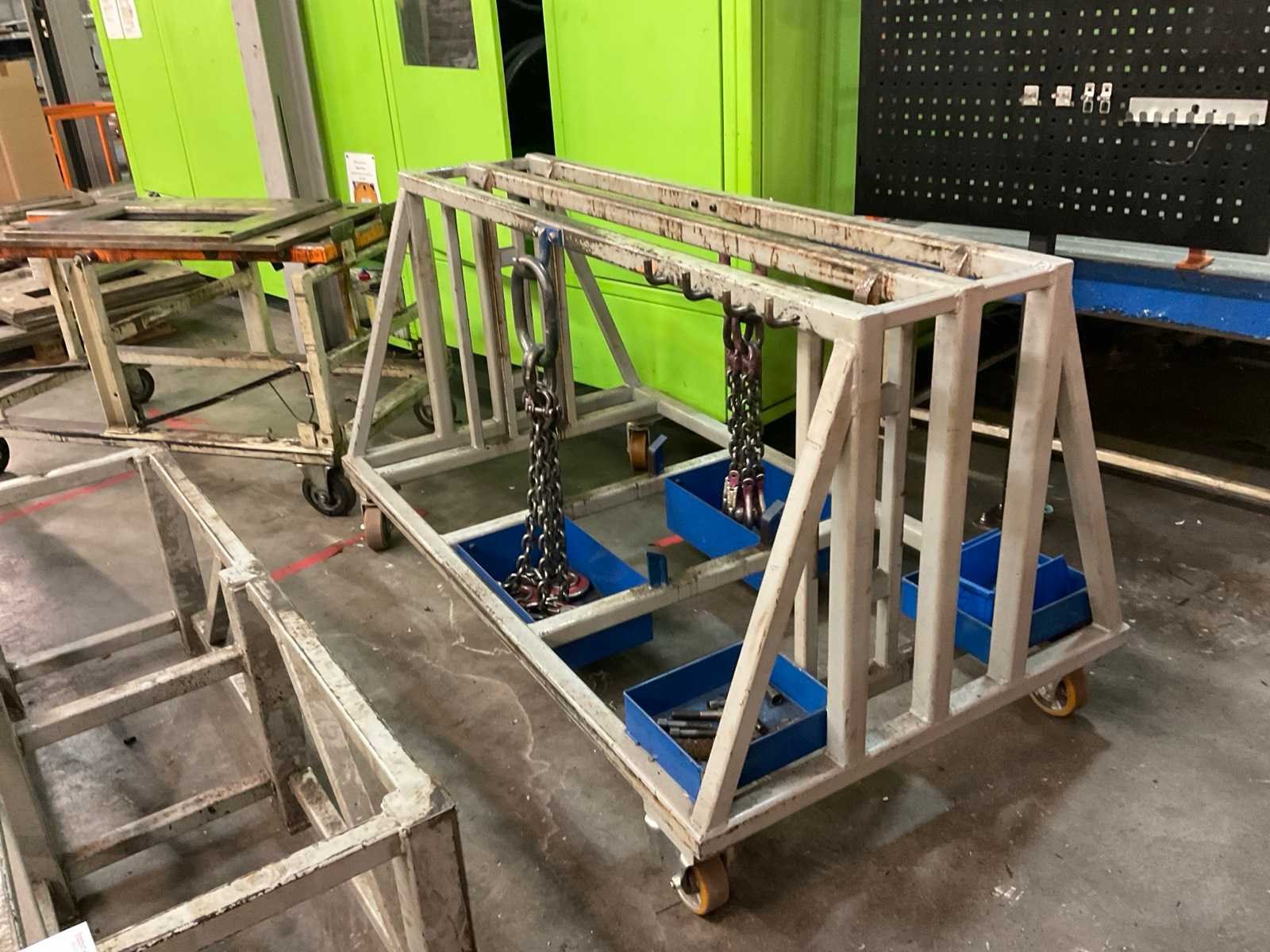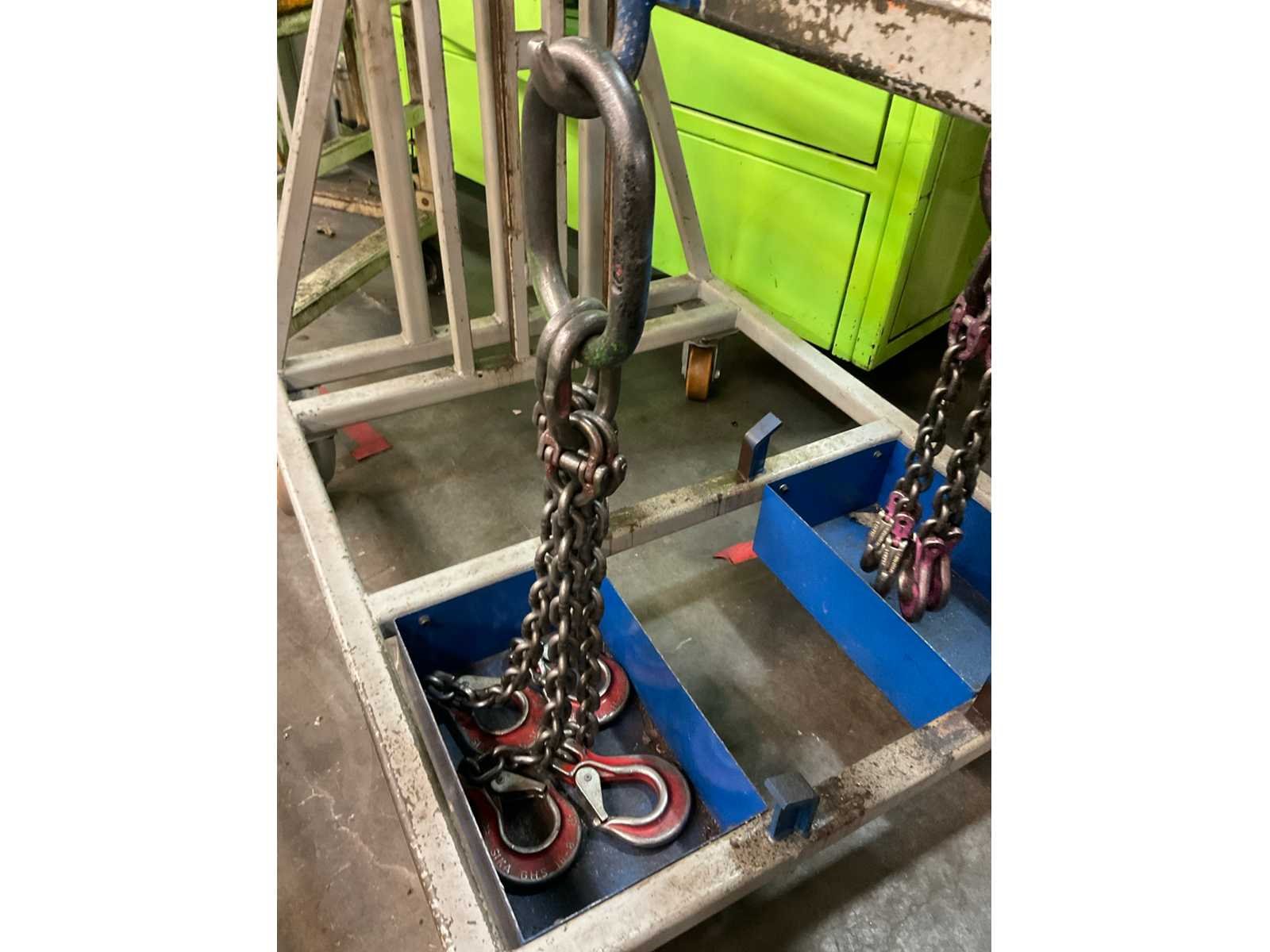 Verrijdbaar stalen frame met 2 stuks 4- sprong hijskettingen en stalen bakken afm ca. 180x100x99 cm Alsmede verrijdbaar stalen frame met kantel inrichting, waarvan items erop niet inbegrepen Nee