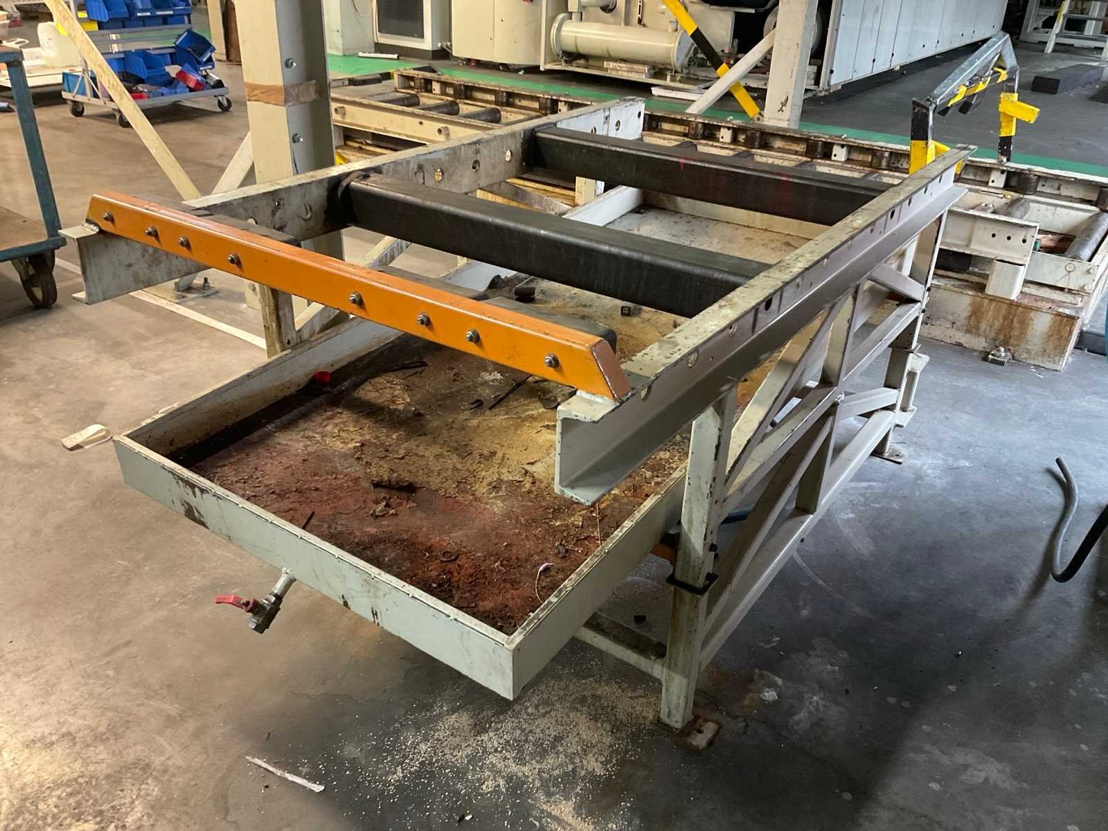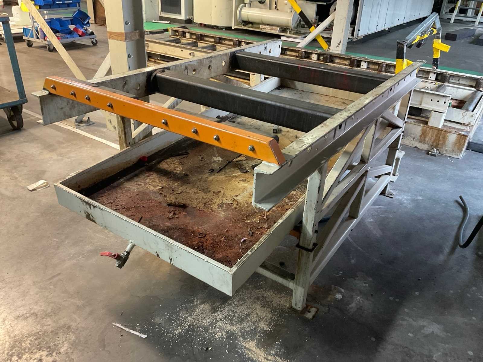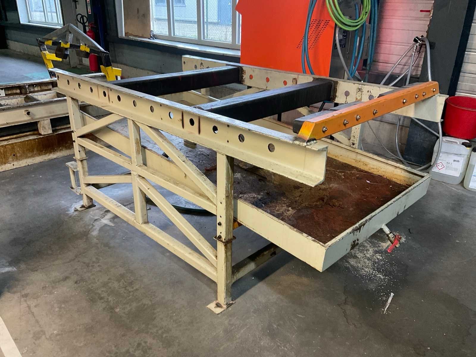 Stalen oozettafel voorzien van rollen en steunen afm ca. 450x143x110 cm En reinigingstafel afm ca. 190x106x83 cm Nee