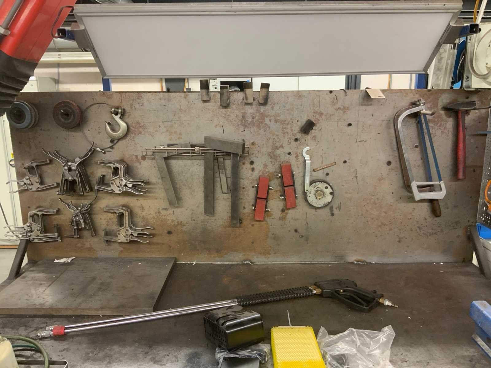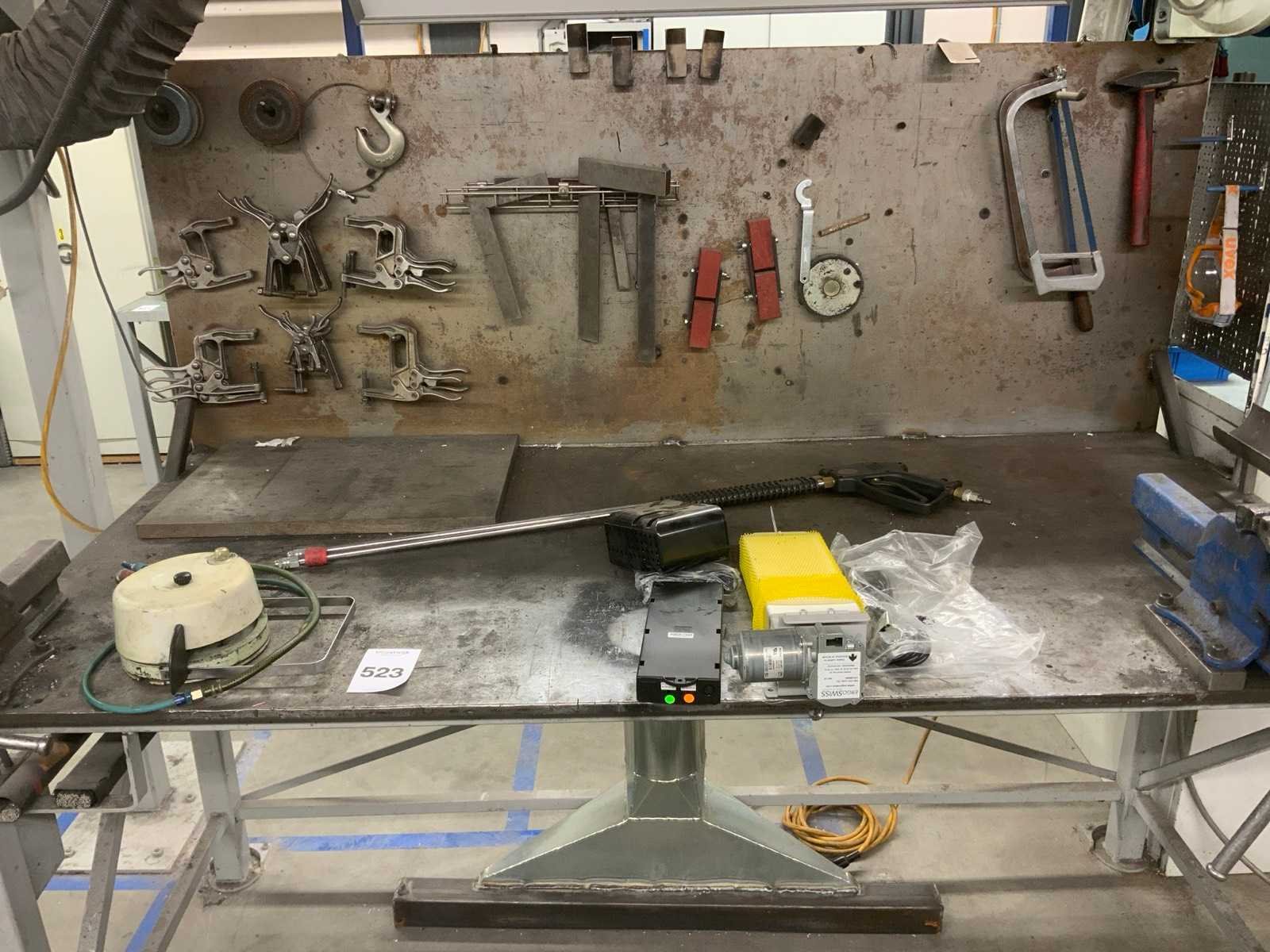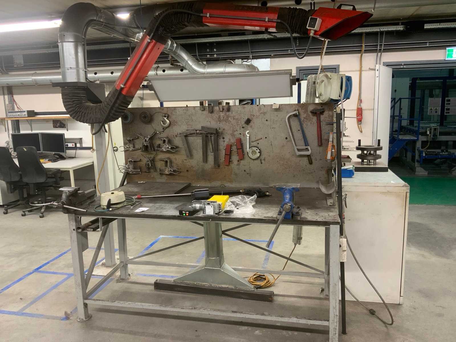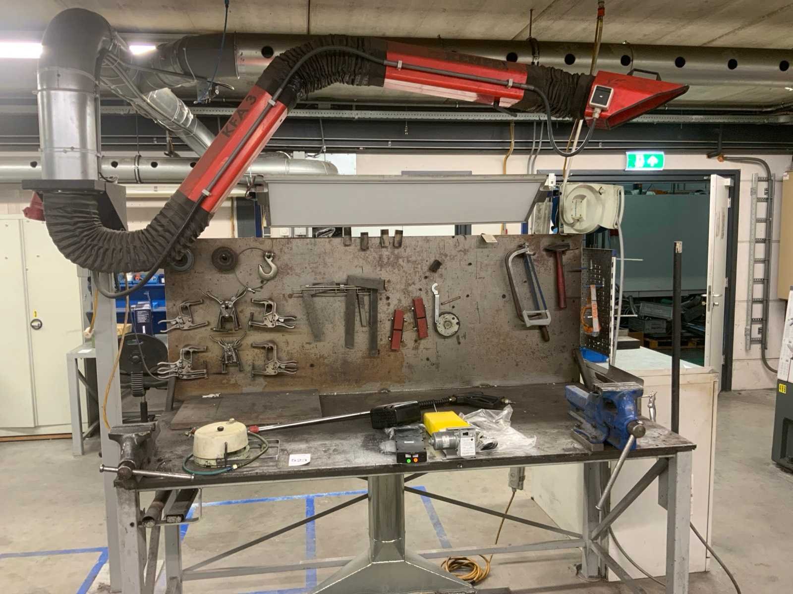 Dit kavel betreft een werkbank met inhoud, een flexibele rode afzuigkap en 3 luchtslang haspels. Werkbank is voorzien van achterwand met een bevestigde lamp en divers gereedschap, zoals klemmen, winkelhaken en zagen. Op de werkbank zijn 2 bankschroeven bevestigd. Hogedrukspuiten en Ergoswiss tablelift system zijn inbegrepen. De afzuigkap betreft alleen het flexibele rode gedeelte tot aan de aluminium buis. Koper dient zelf voldoende gereedschap mee te nemen voor demontage. Nee Breedte: 1010mm Lengte: 2000mm Hoogte: 1670mm