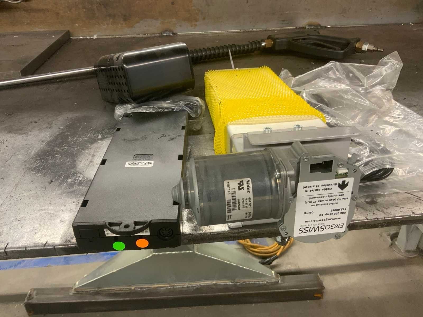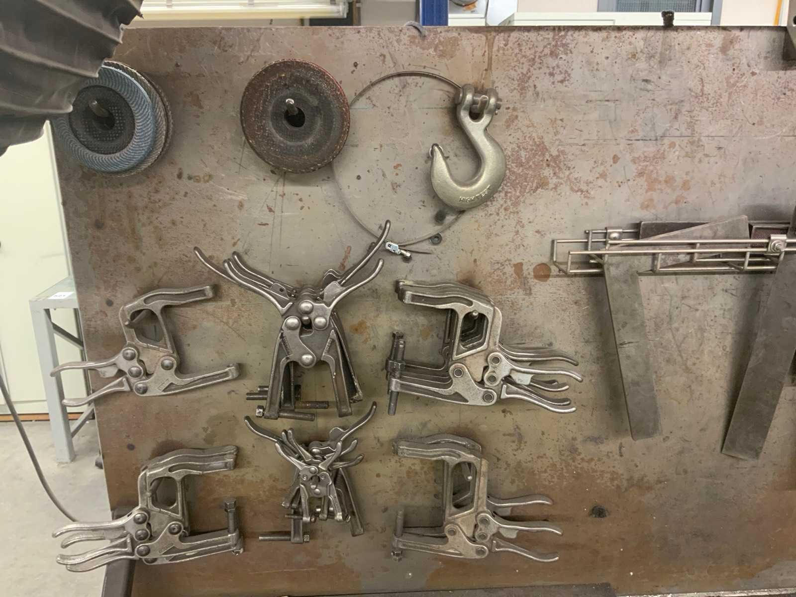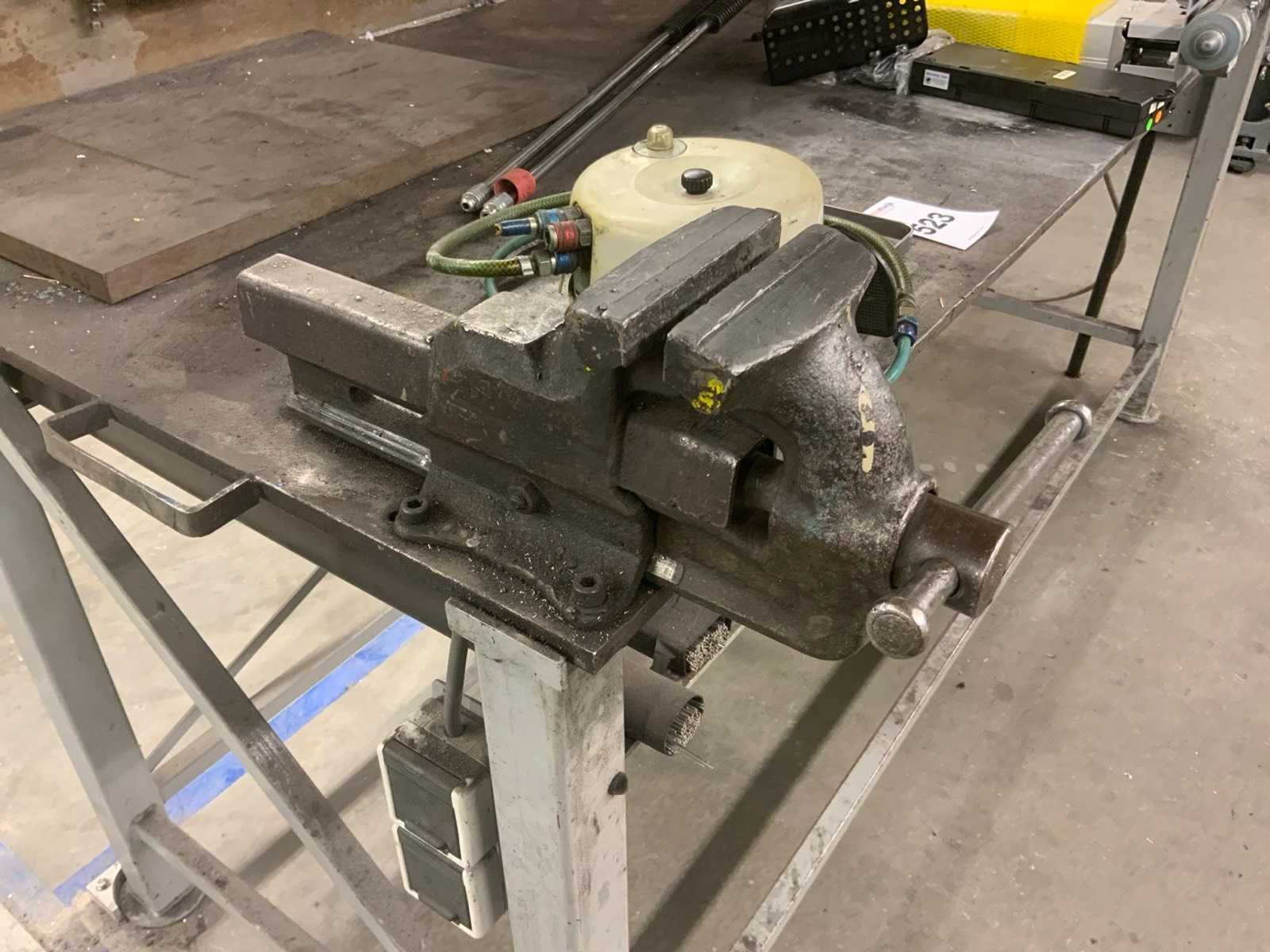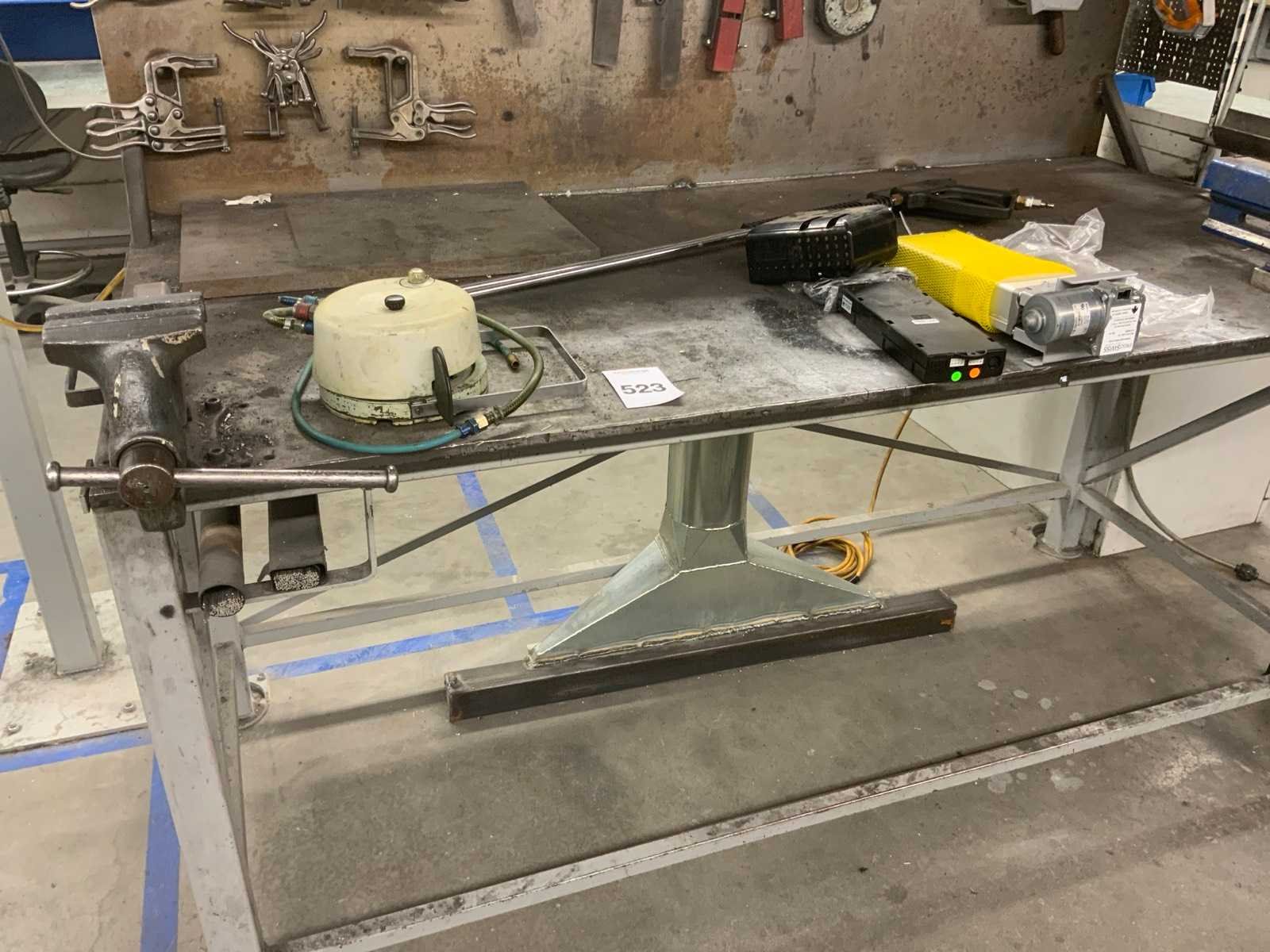 Dit kavel betreft een werkbank met inhoud, een flexibele rode afzuigkap en 3 luchtslang haspels. Werkbank is voorzien van achterwand met een bevestigde lamp en divers gereedschap, zoals klemmen, winkelhaken en zagen. Op de werkbank zijn 2 bankschroeven bevestigd. Hogedrukspuiten en Ergoswiss tablelift system zijn inbegrepen. De afzuigkap betreft alleen het flexibele rode gedeelte tot aan de aluminium buis. Koper dient zelf voldoende gereedschap mee te nemen voor demontage. Nee Breedte: 1010mm Lengte: 2000mm Hoogte: 1670mm