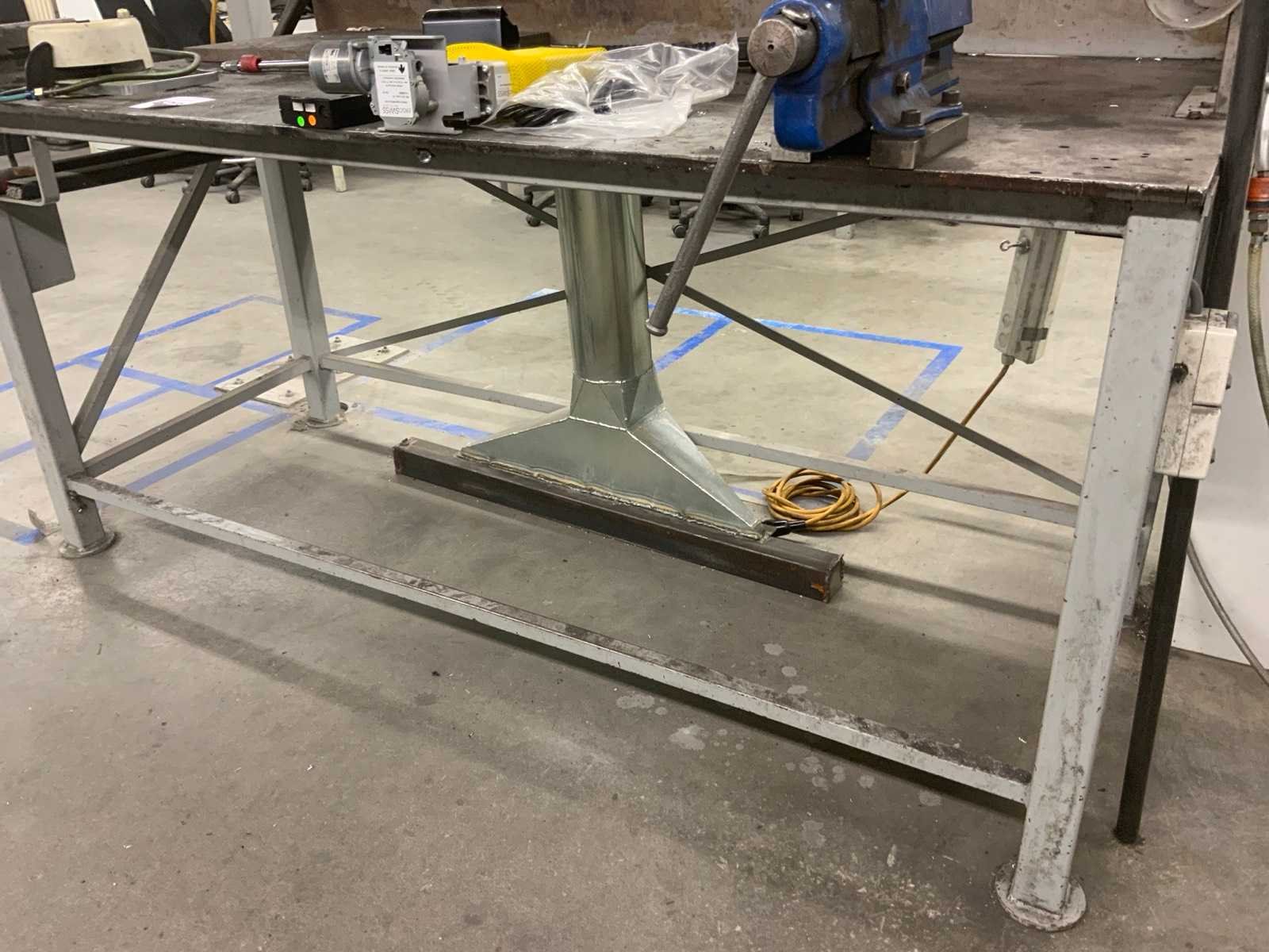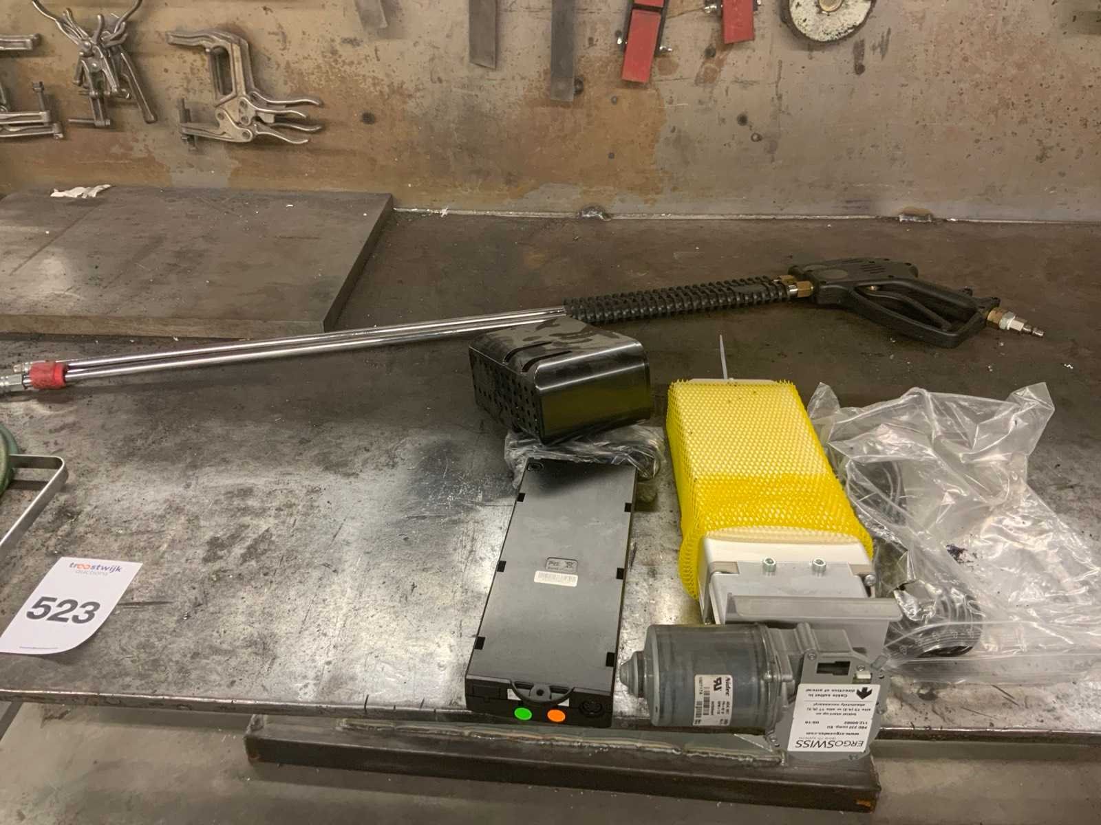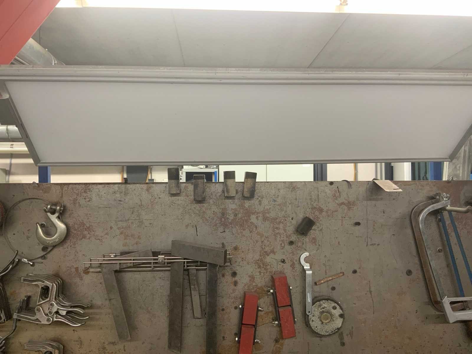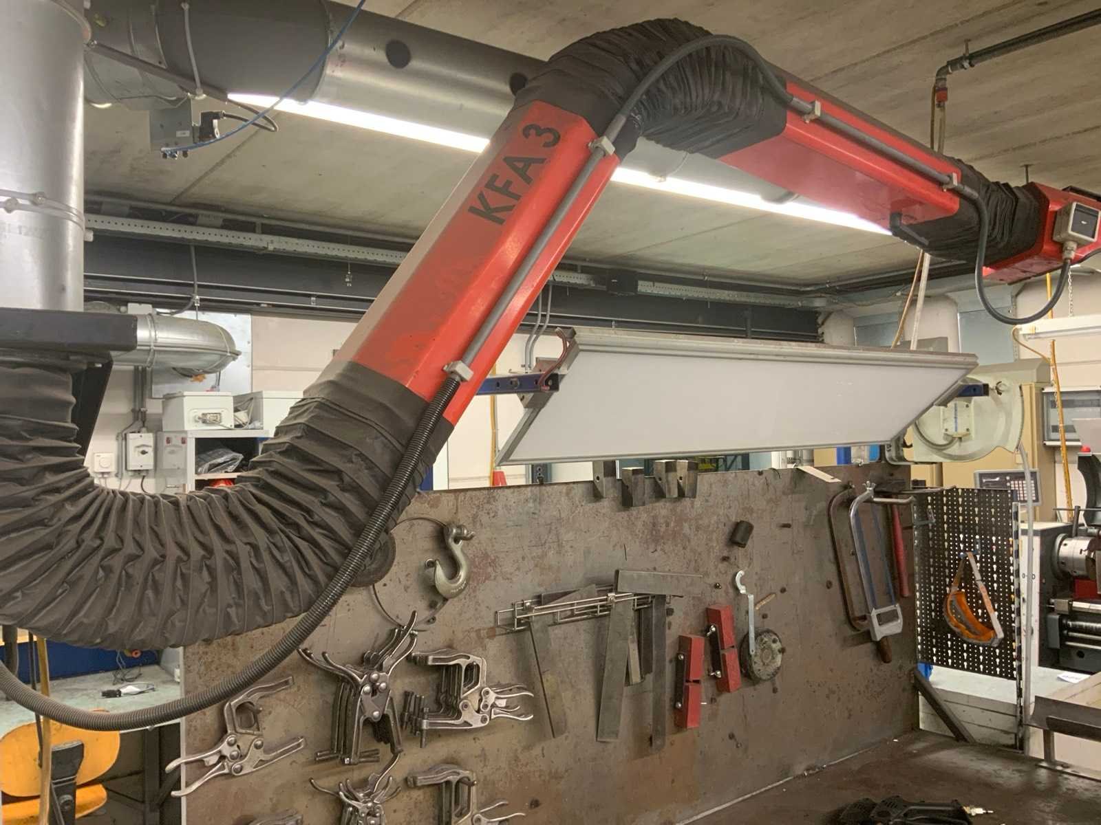 Dit kavel betreft een werkbank met inhoud, een flexibele rode afzuigkap en 3 luchtslang haspels. Werkbank is voorzien van achterwand met een bevestigde lamp en divers gereedschap, zoals klemmen, winkelhaken en zagen. Op de werkbank zijn 2 bankschroeven bevestigd. Hogedrukspuiten en Ergoswiss tablelift system zijn inbegrepen. De afzuigkap betreft alleen het flexibele rode gedeelte tot aan de aluminium buis. Koper dient zelf voldoende gereedschap mee te nemen voor demontage. Nee Breedte: 1010mm Lengte: 2000mm Hoogte: 1670mm