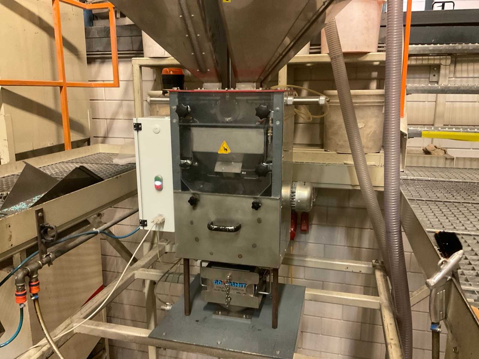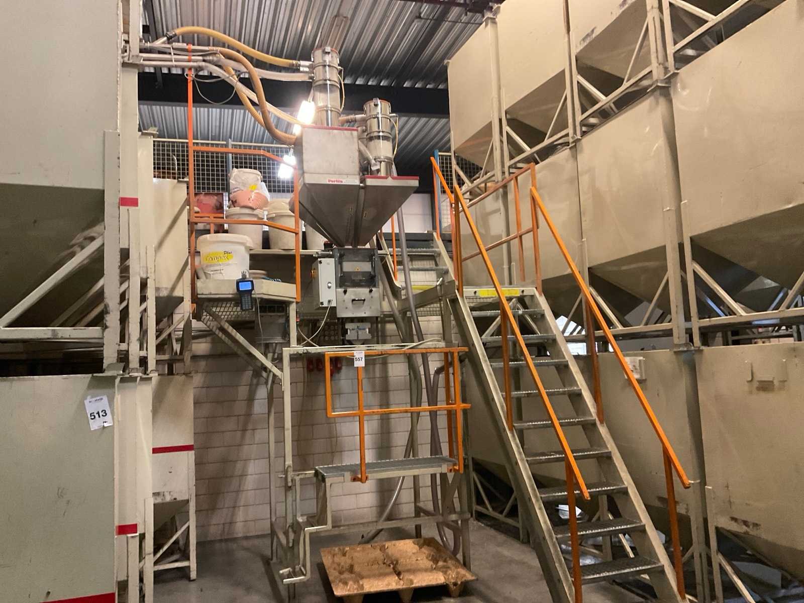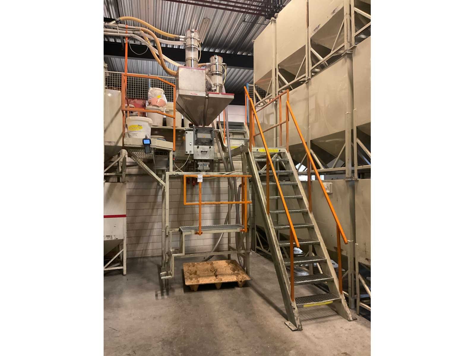 Bestaande uit stellage met bordes en trap met Gravimix doseerunit, voorzien van luchtbediende doseerkleppen, losschuif en termin digitale uitlezing. 3 stuks Motan hoppers en Goudsmit metaaldetector Nee Merk: Gravimix, Motan Type: Hps-06-1 Aansluiting: 400V Totale afmeting L: 2640mm Totale afmeting Breedte: 3900mm Totale afmeting Hoogte: 4300mm