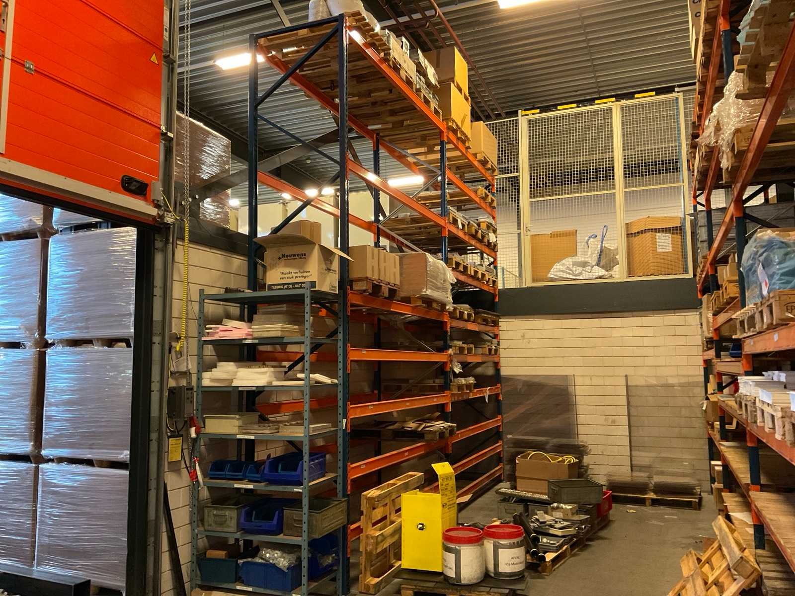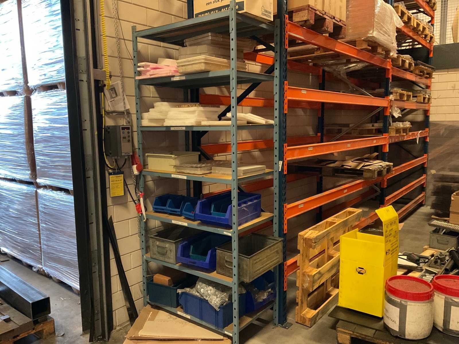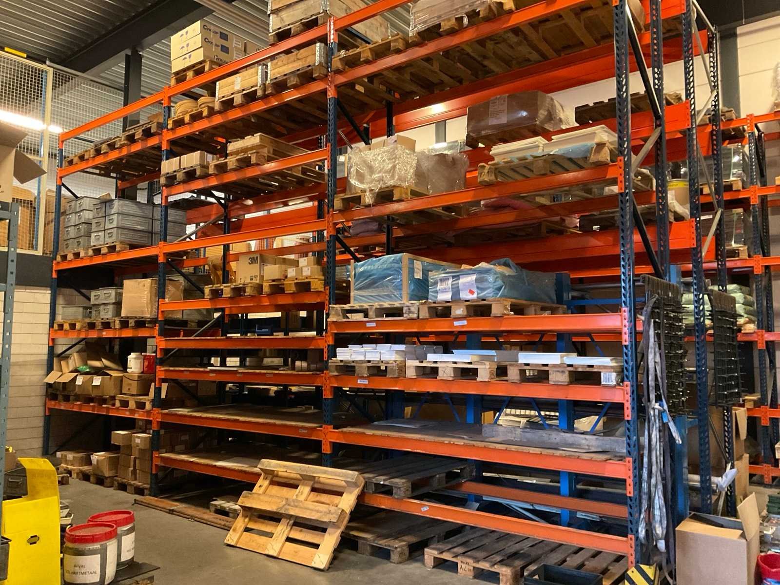 Kavel betreft de grote oranje/ blauw kleurige stelling, alsmede 3 kleinere blauwe stellingen onder en voor de grote stelling, waarvan één met draagarmen. Inhoud van alle stellingen en zichtbare pallets zijn niet inbegrepen. Nee Sectie afm. b: 2700mm Sectie diepte: 1010mm Aantal staanders: 15 Aantal liggers: 136 Demontabel: true Hoogte: 500cm