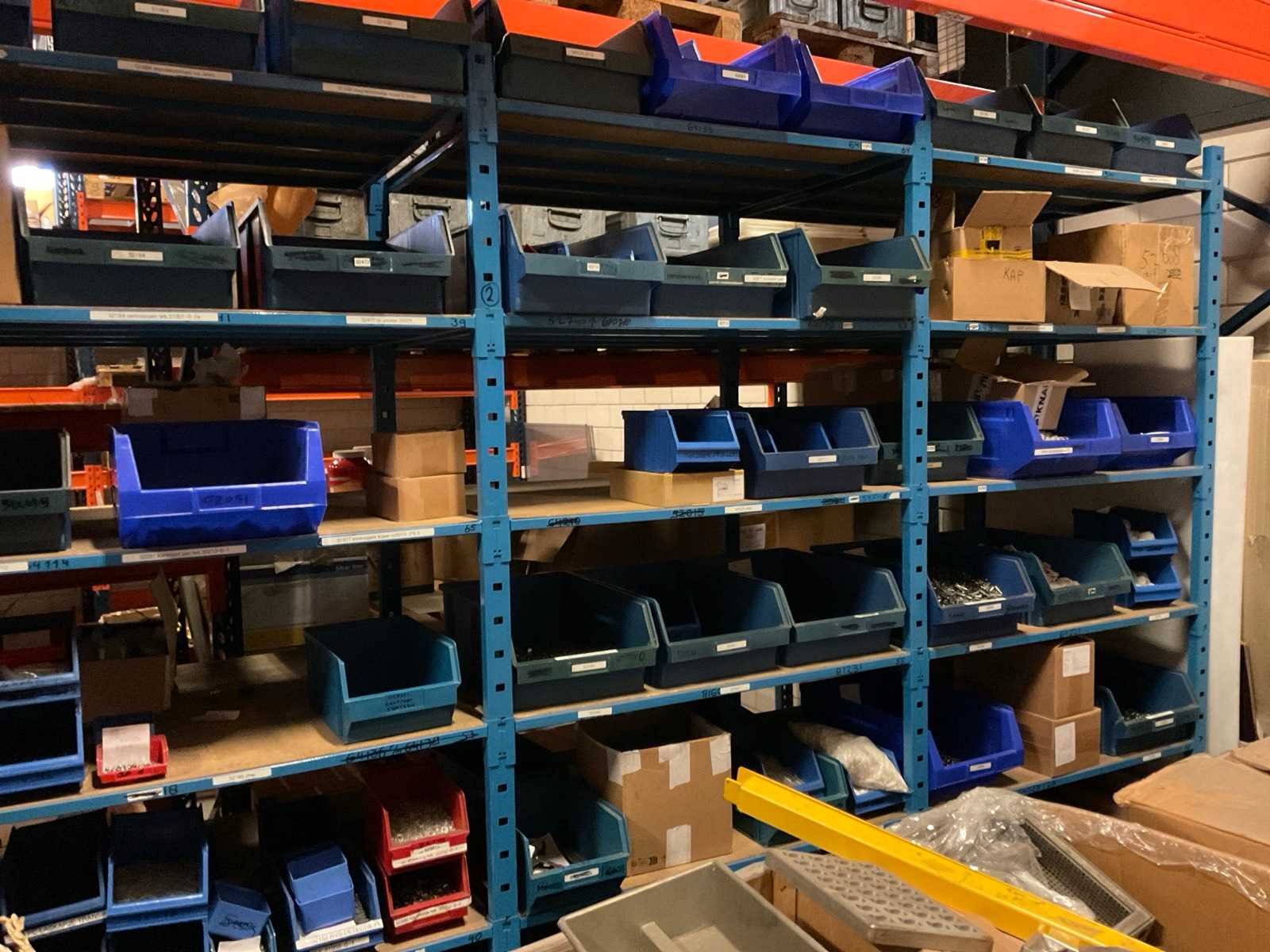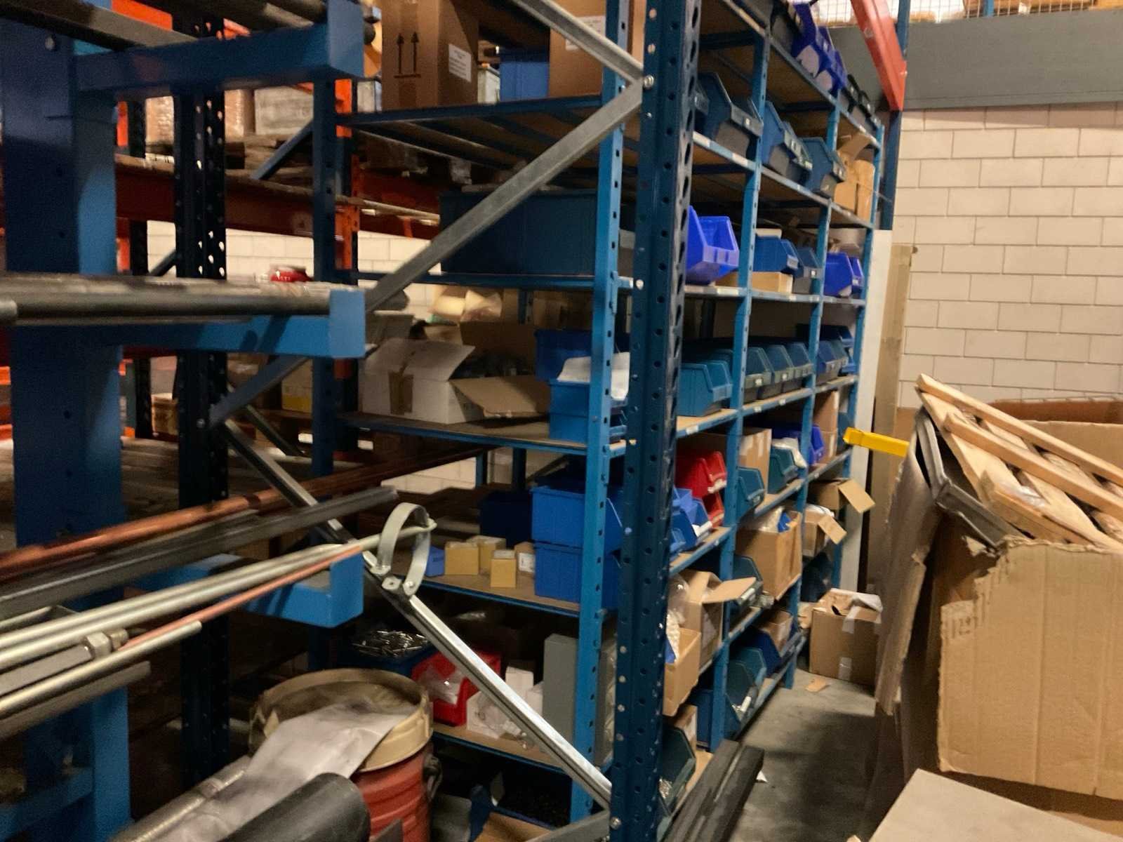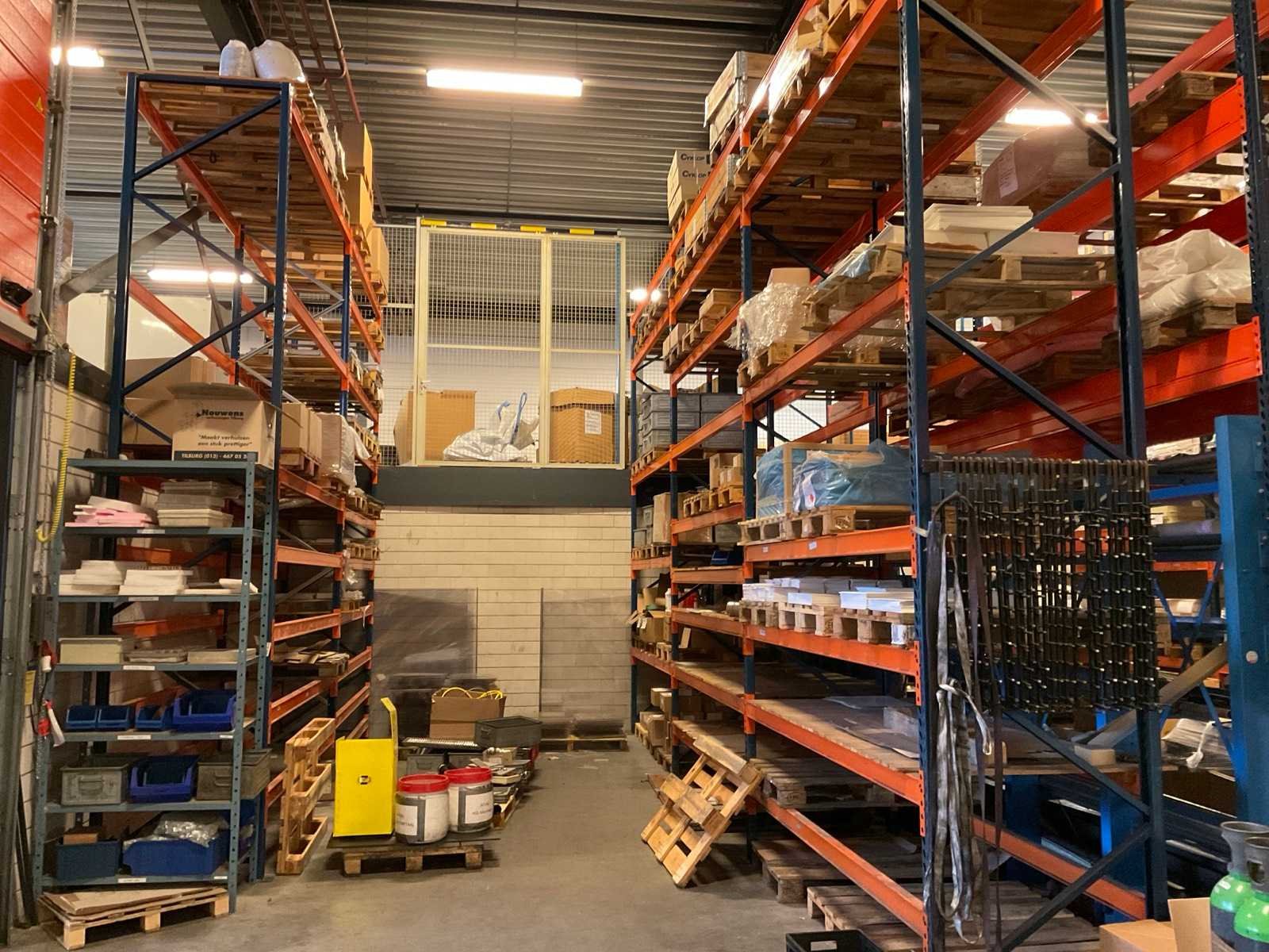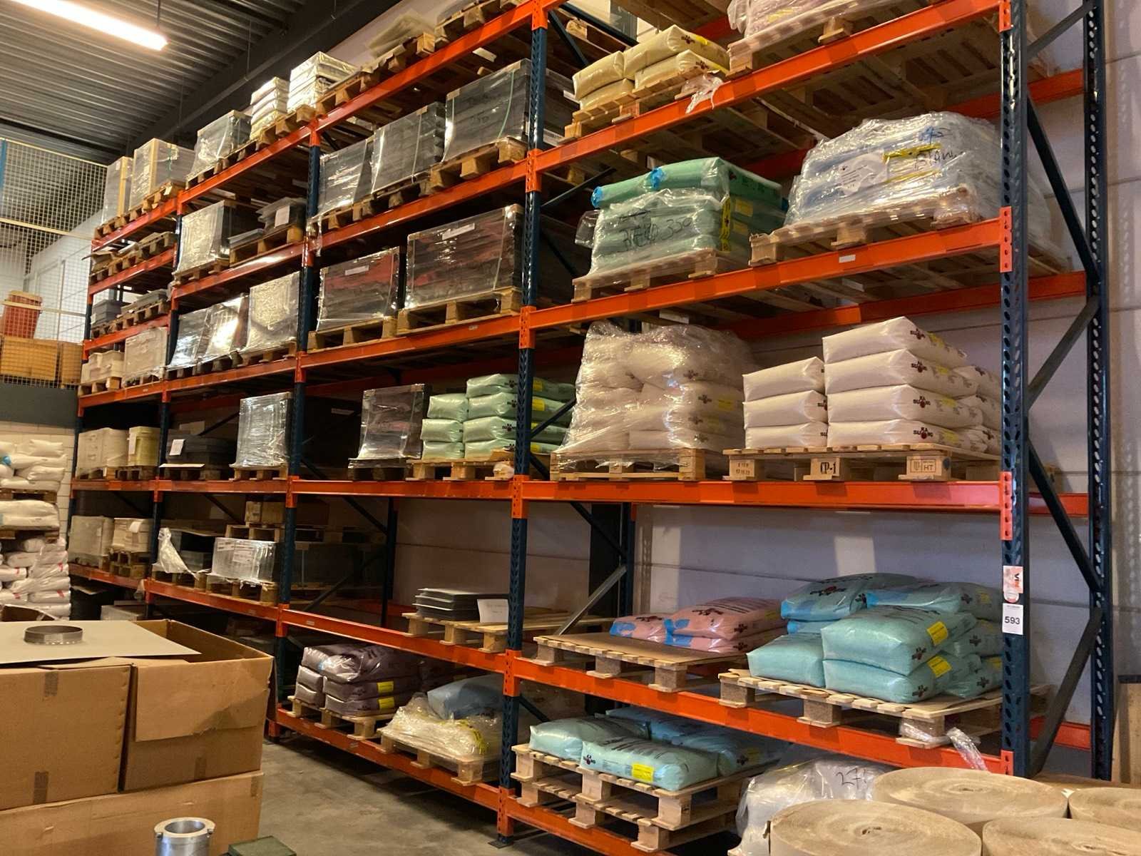 Kavel betreft de grote oranje/ blauw kleurige stelling, alsmede 3 kleinere blauwe stellingen onder en voor de grote stelling, waarvan één met draagarmen. Inhoud van alle stellingen en zichtbare pallets zijn niet inbegrepen. Nee Sectie afm. b: 2700mm Sectie diepte: 1010mm Aantal staanders: 15 Aantal liggers: 136 Demontabel: true Hoogte: 500cm