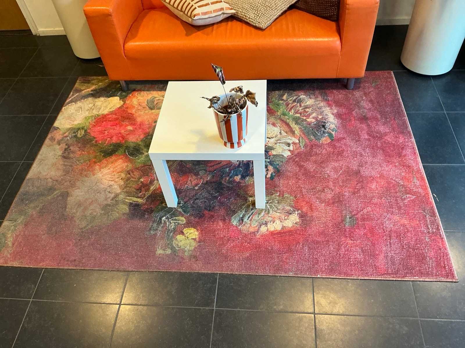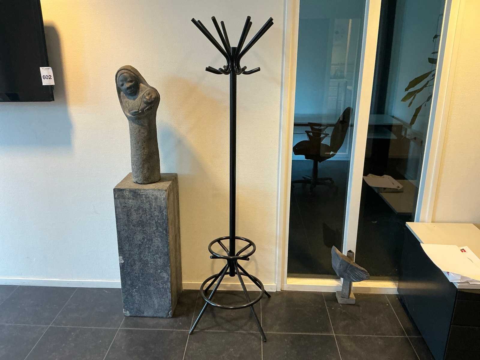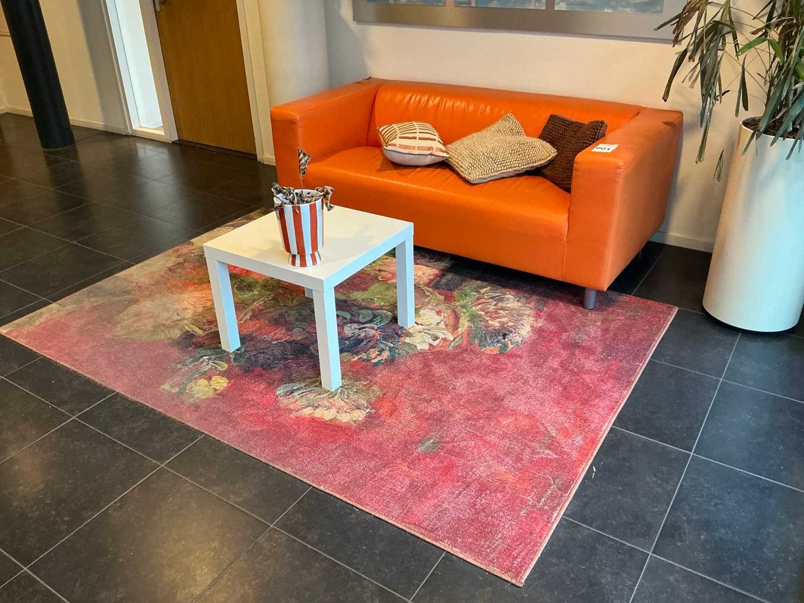 Bestaande uit een vloerkleed 237x162cm, 1x bijzettafel, 1x lederlook bank 176x85x65cm, 1 beeld op sokkel, 1 kapstok Nee