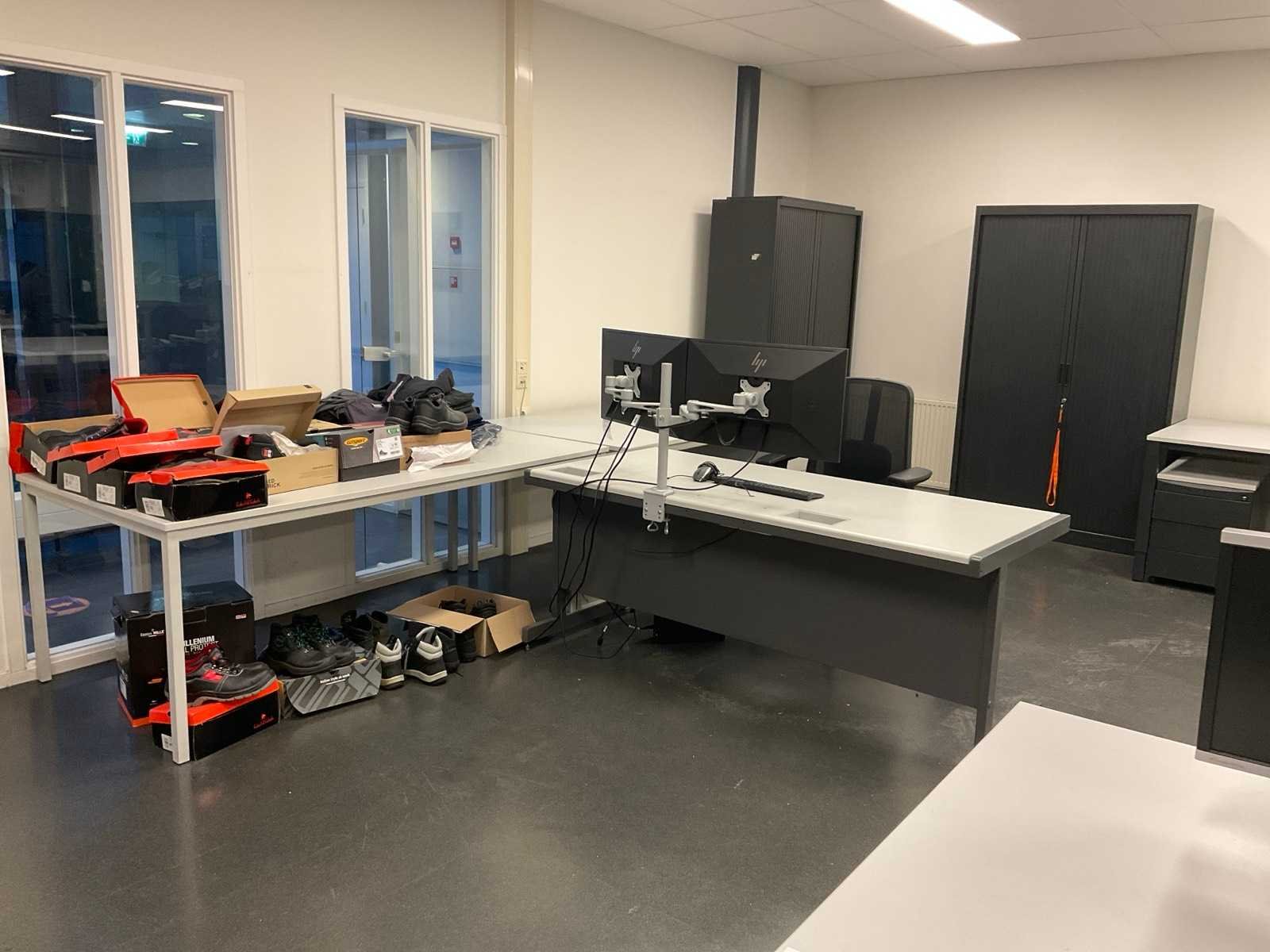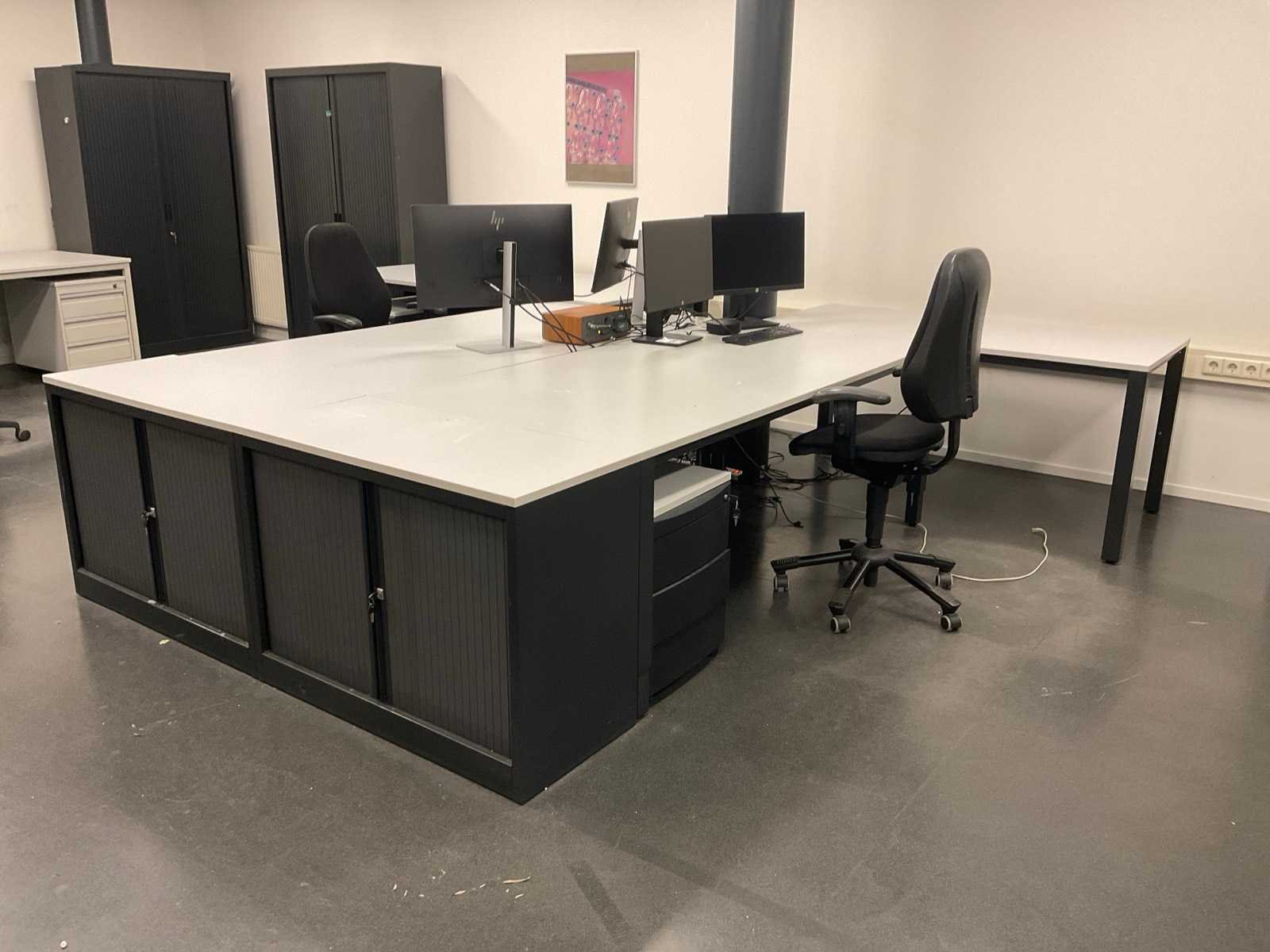Bestaande uit diverse modellen bureau’s en werktafels, 2 lage jalouziedeurkasten, 7 ladeblokken, 7 bureaustoelen, 3 planten in pot, 3 archiefkasten met inhoud, verrijdbare open kast, schuifdeurkast, ventilatoren en wanddecoratie (Anders verkavelde zaken en ICT niet inbegrepen) Nee