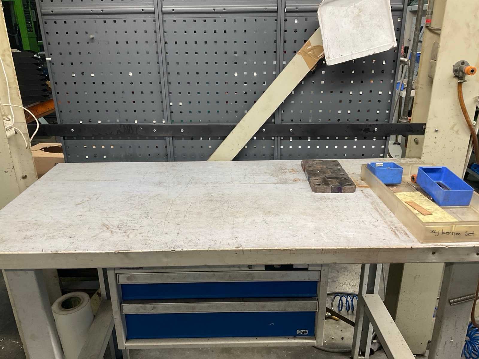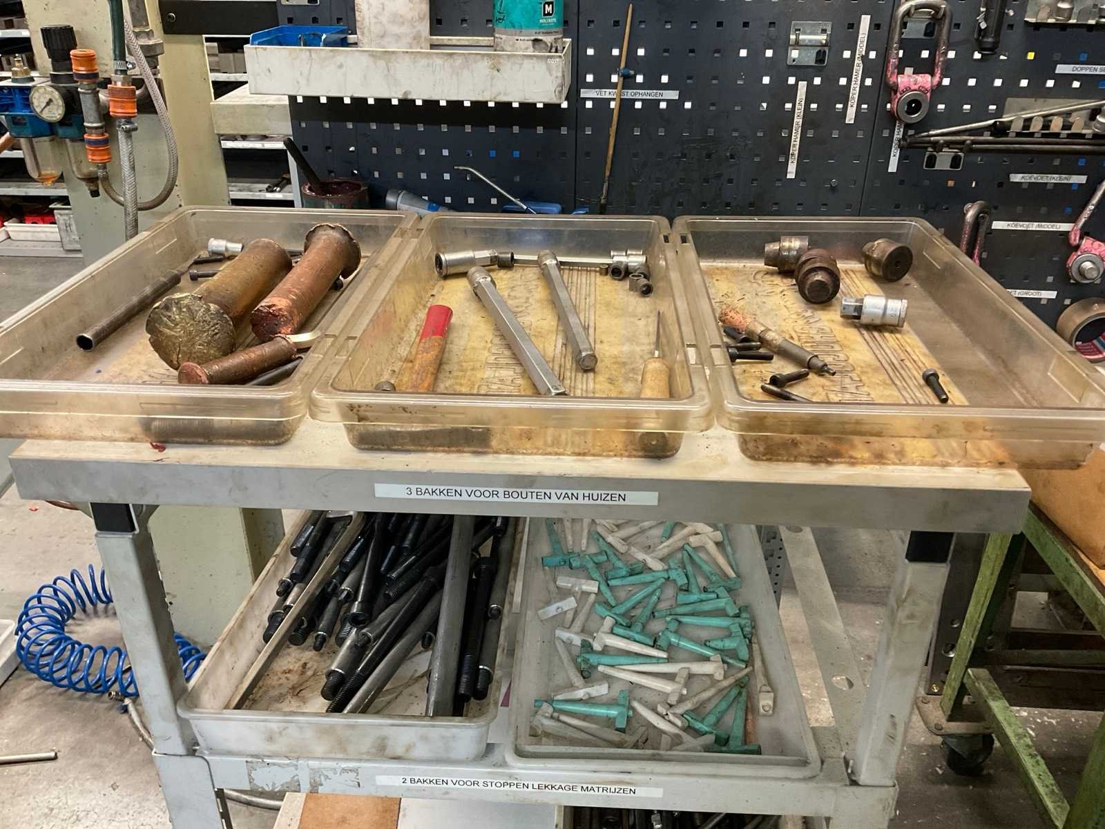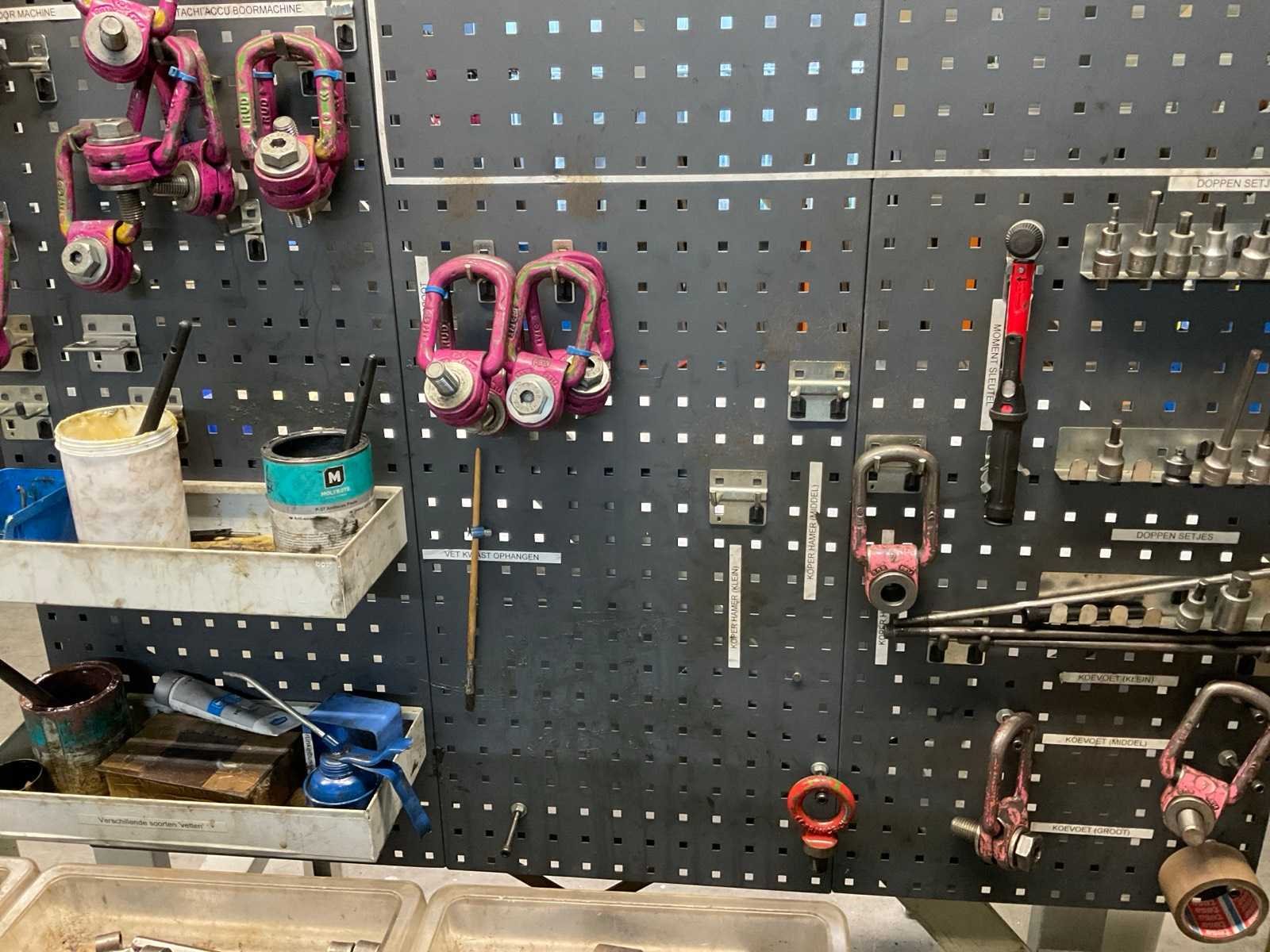 Bestaande uit: -Werktafel met inhoud, waarvan afmetingen: 150 x 70 x 107 cm. -Wandbord met onder andere hijsogen en doppenset. -verrijdbare magazijnkar voorzien van 4 lagen met inhoud, zoals diverse inbusbouten. -verrijdbare magazijnkar (groen) -standaard Nee