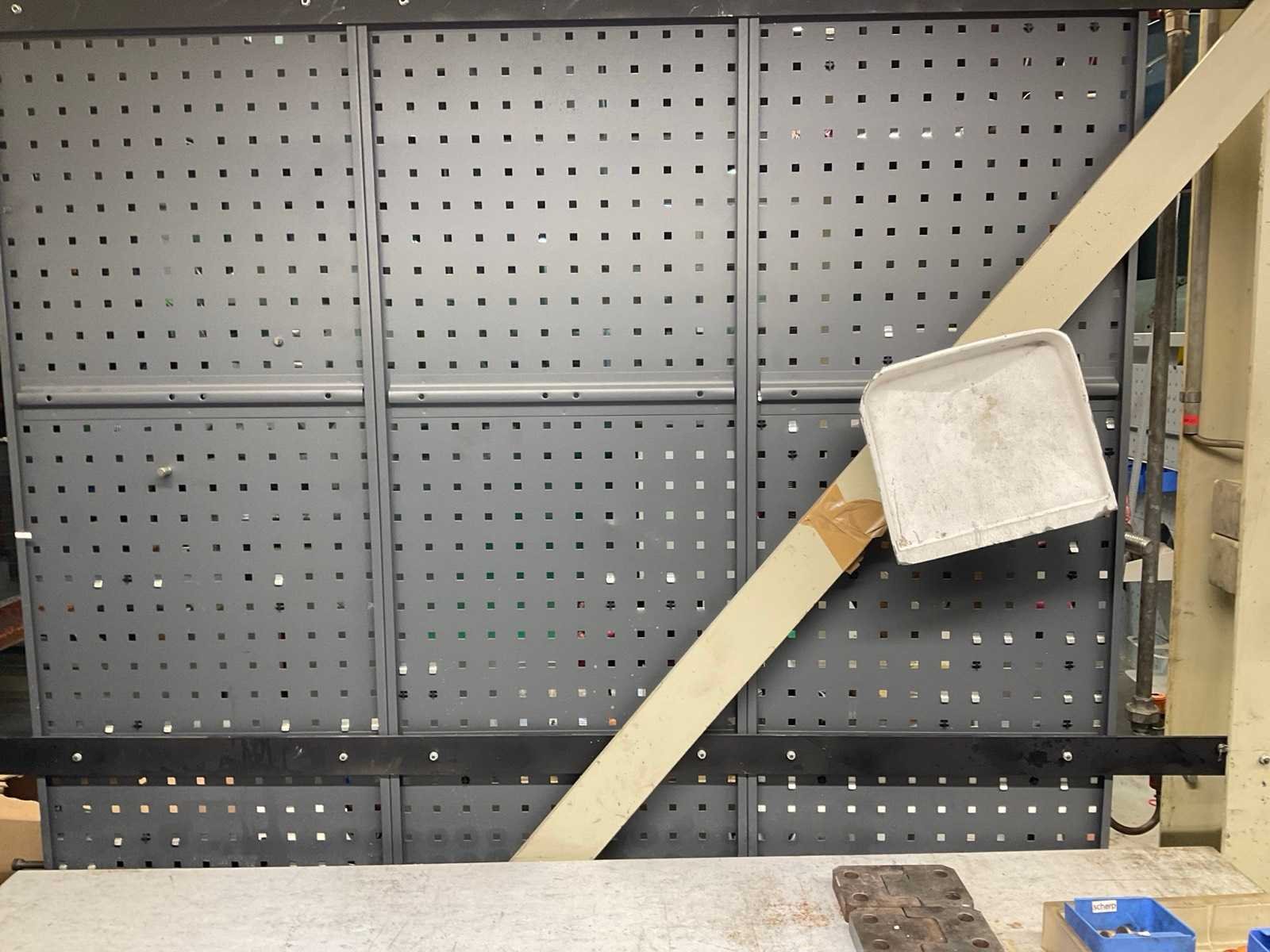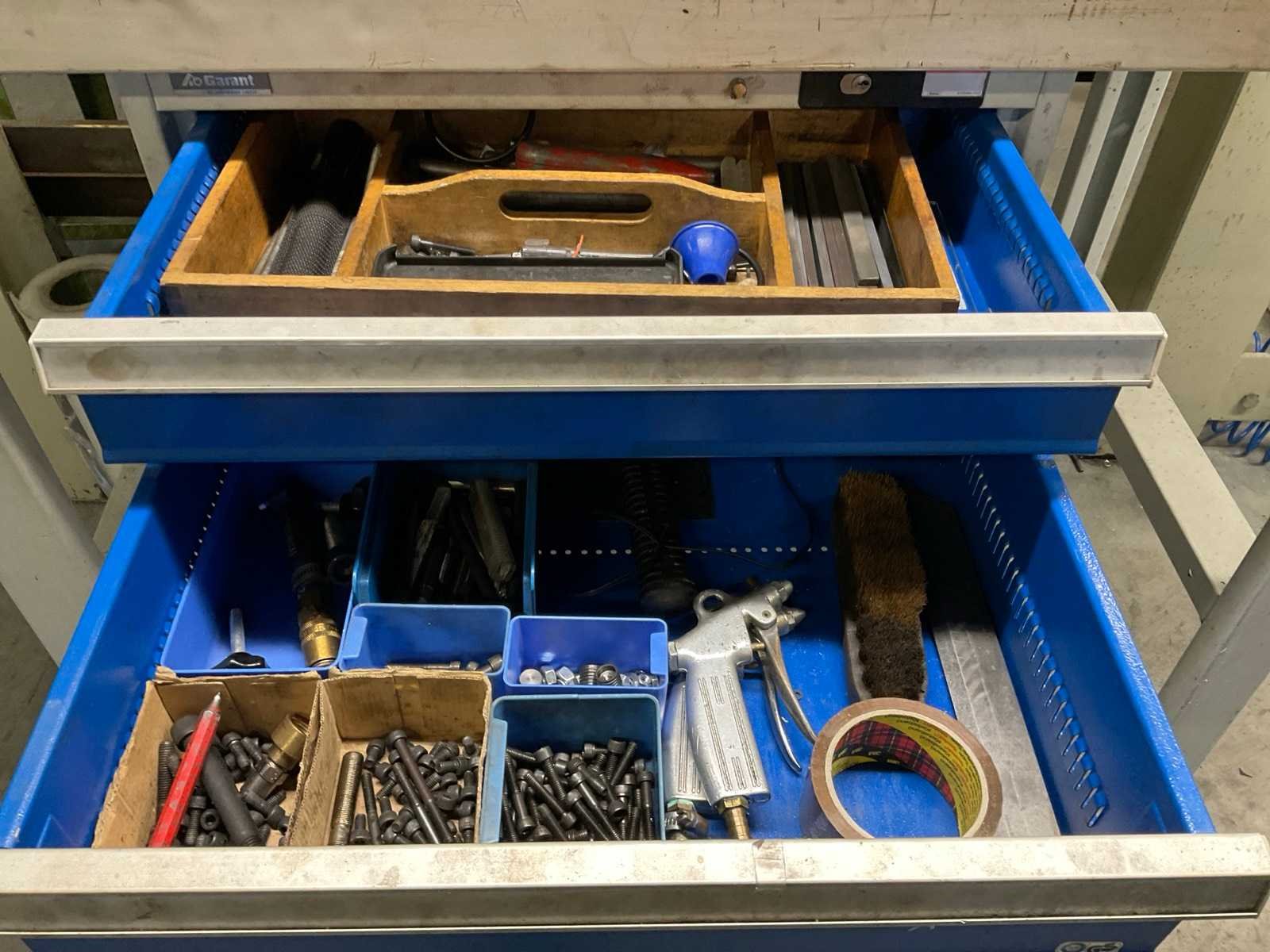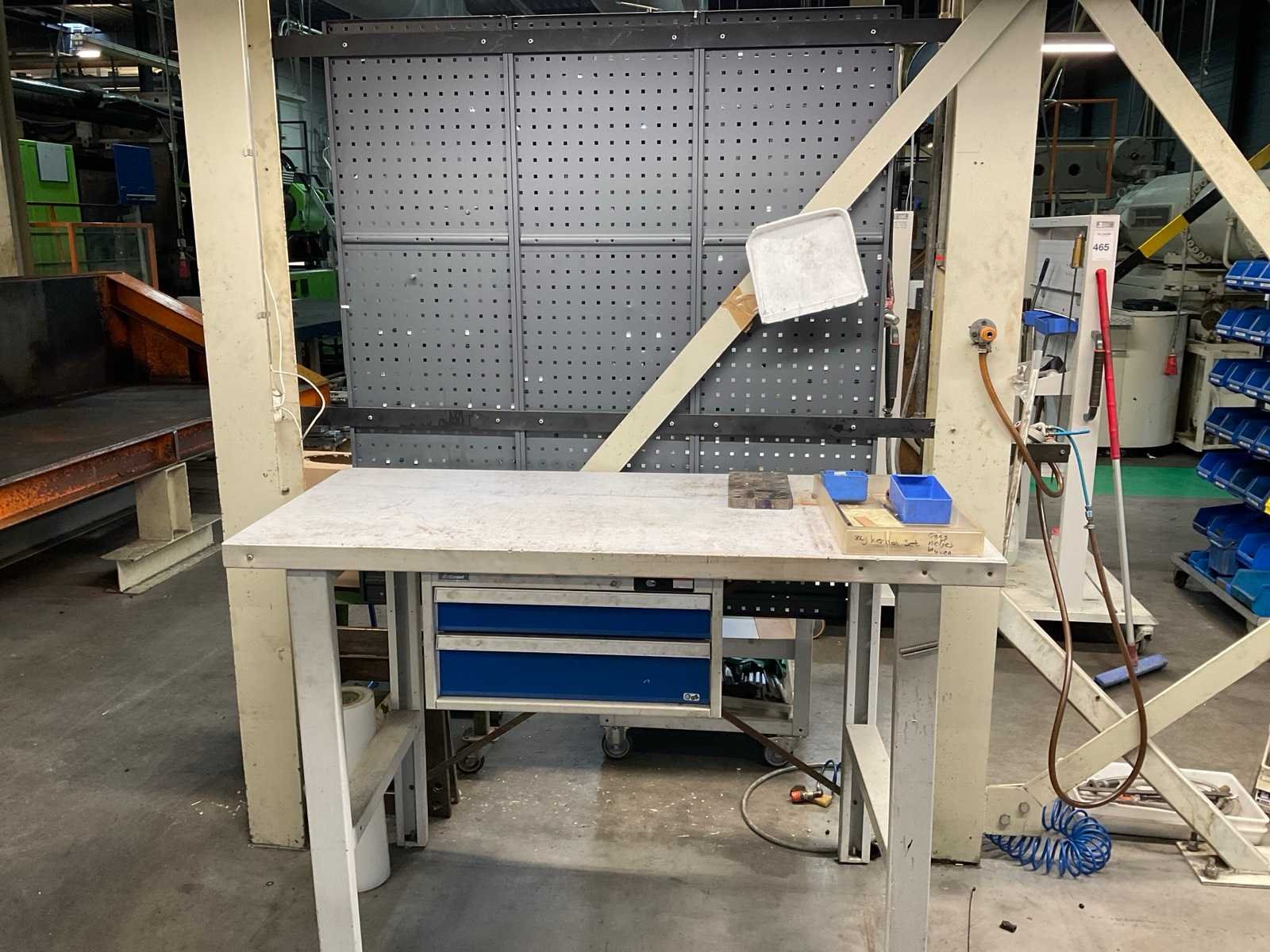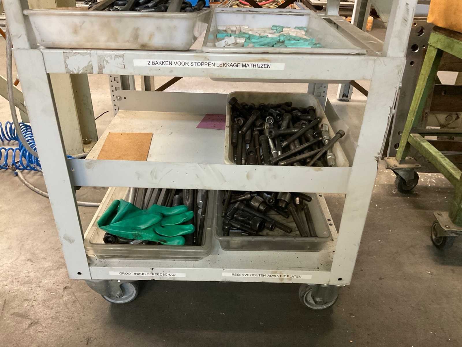 Bestaande uit: -Werktafel met inhoud, waarvan afmetingen: 150 x 70 x 107 cm. -Wandbord met onder andere hijsogen en doppenset. -verrijdbare magazijnkar voorzien van 4 lagen met inhoud, zoals diverse inbusbouten. -verrijdbare magazijnkar (groen) -standaard Nee