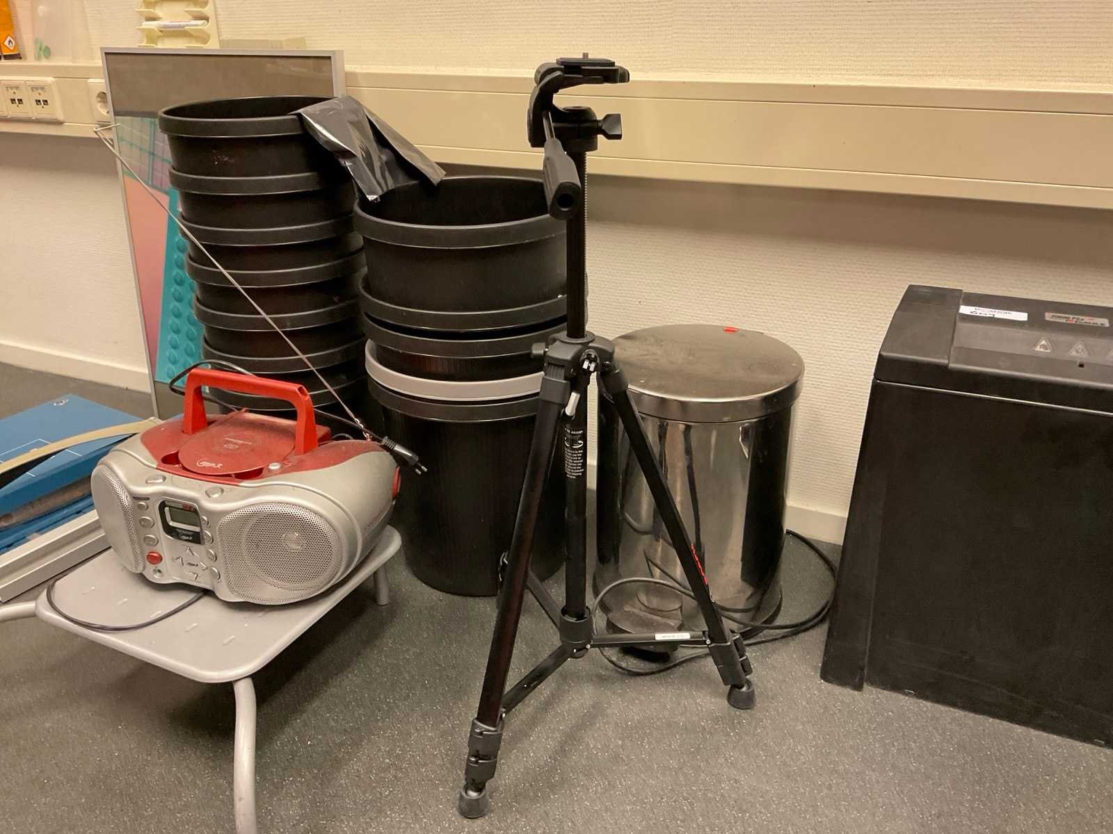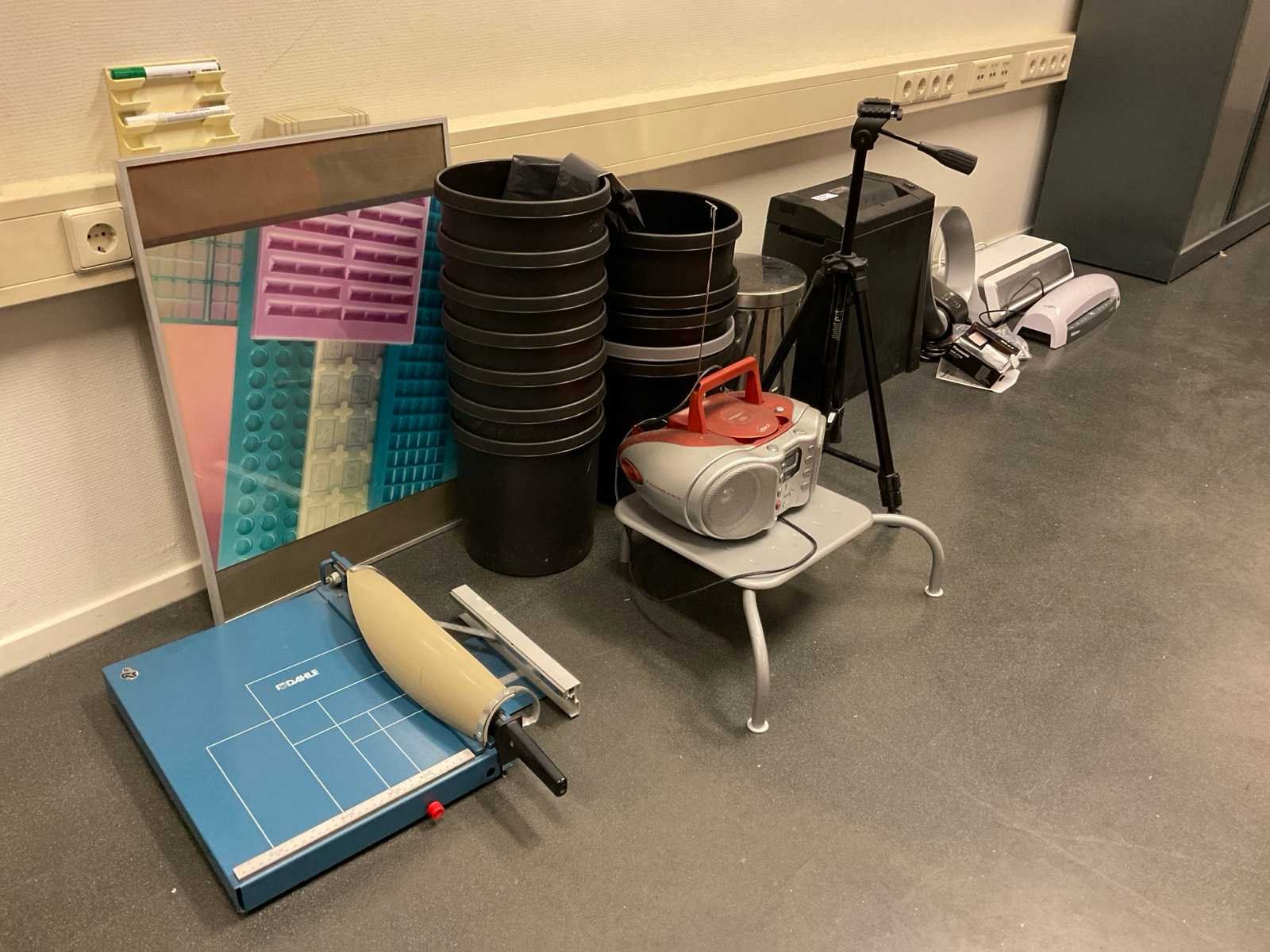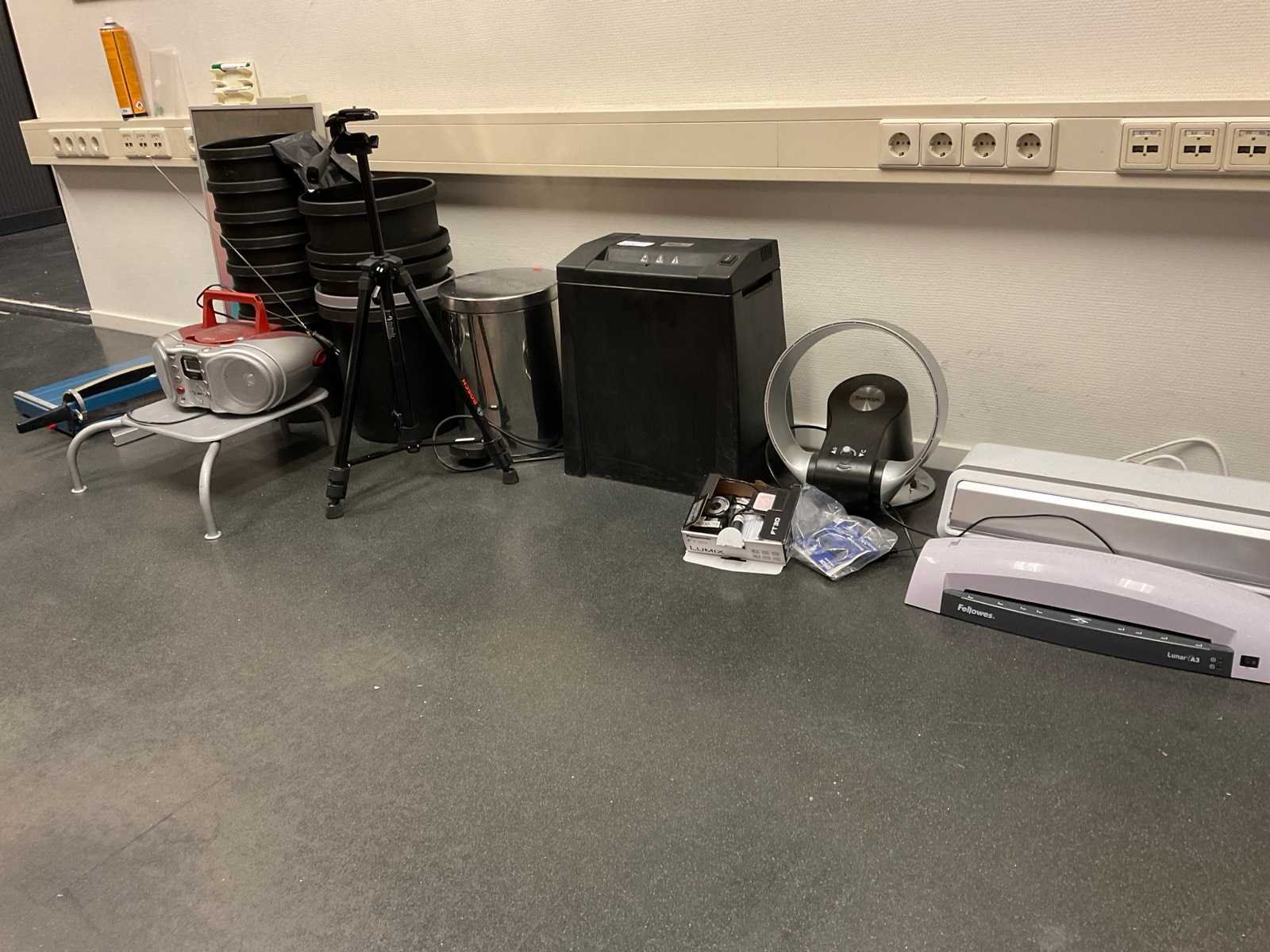 Bestaande uit onder andere: -Lamineer apparaten van Fellowes -Papierversnipperaar van Dahle -Camerastandaard -Papiersnijder van Dahle -Radio -Voetenstadaard -Prullenbakken -Lijst Nee