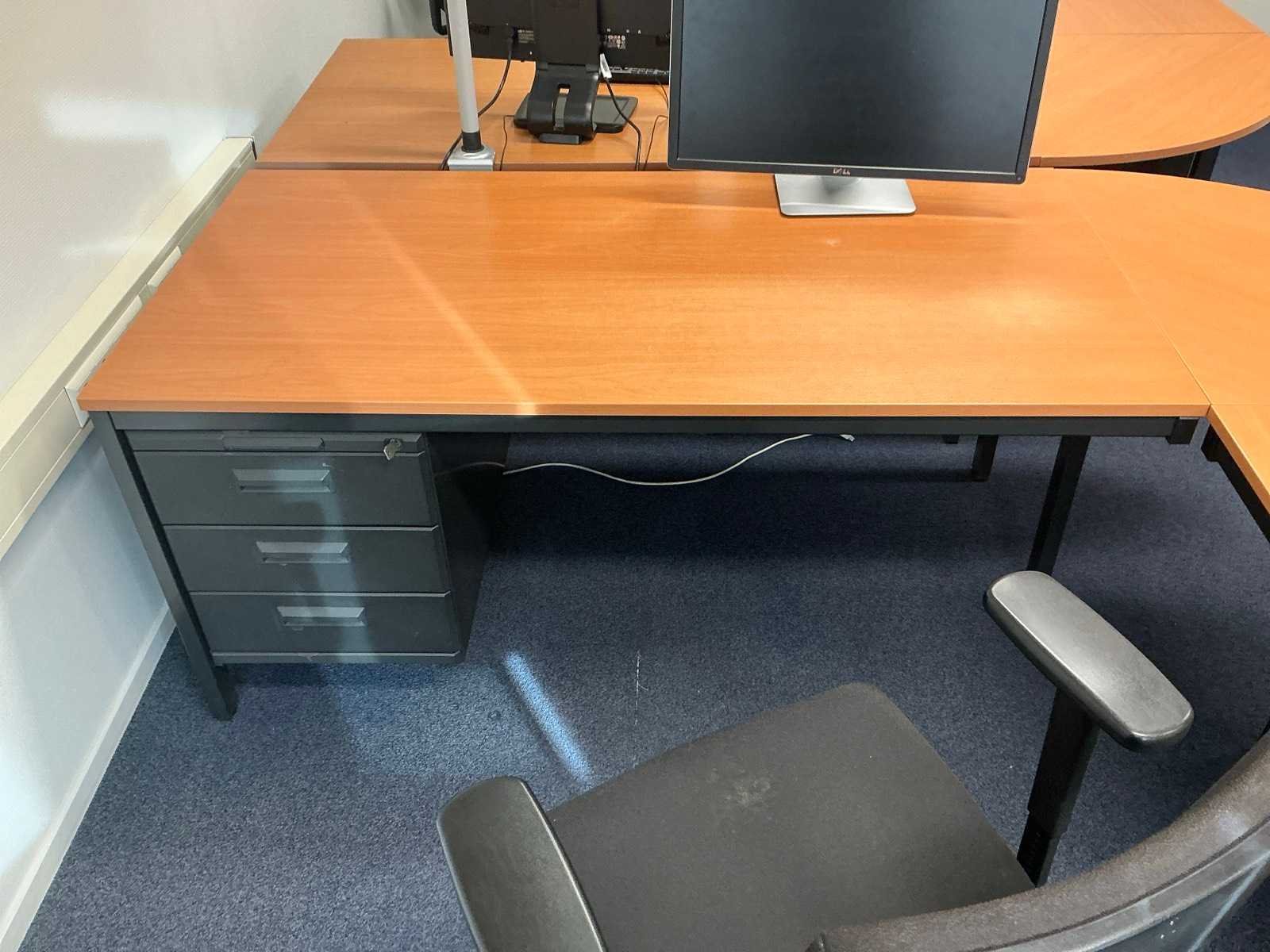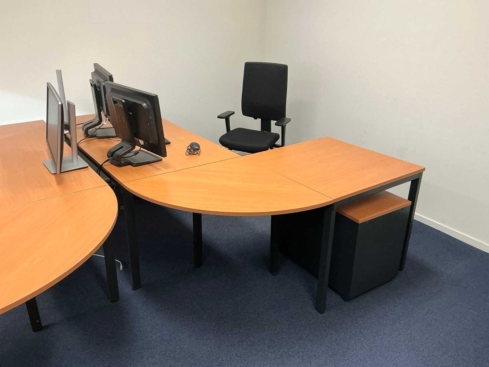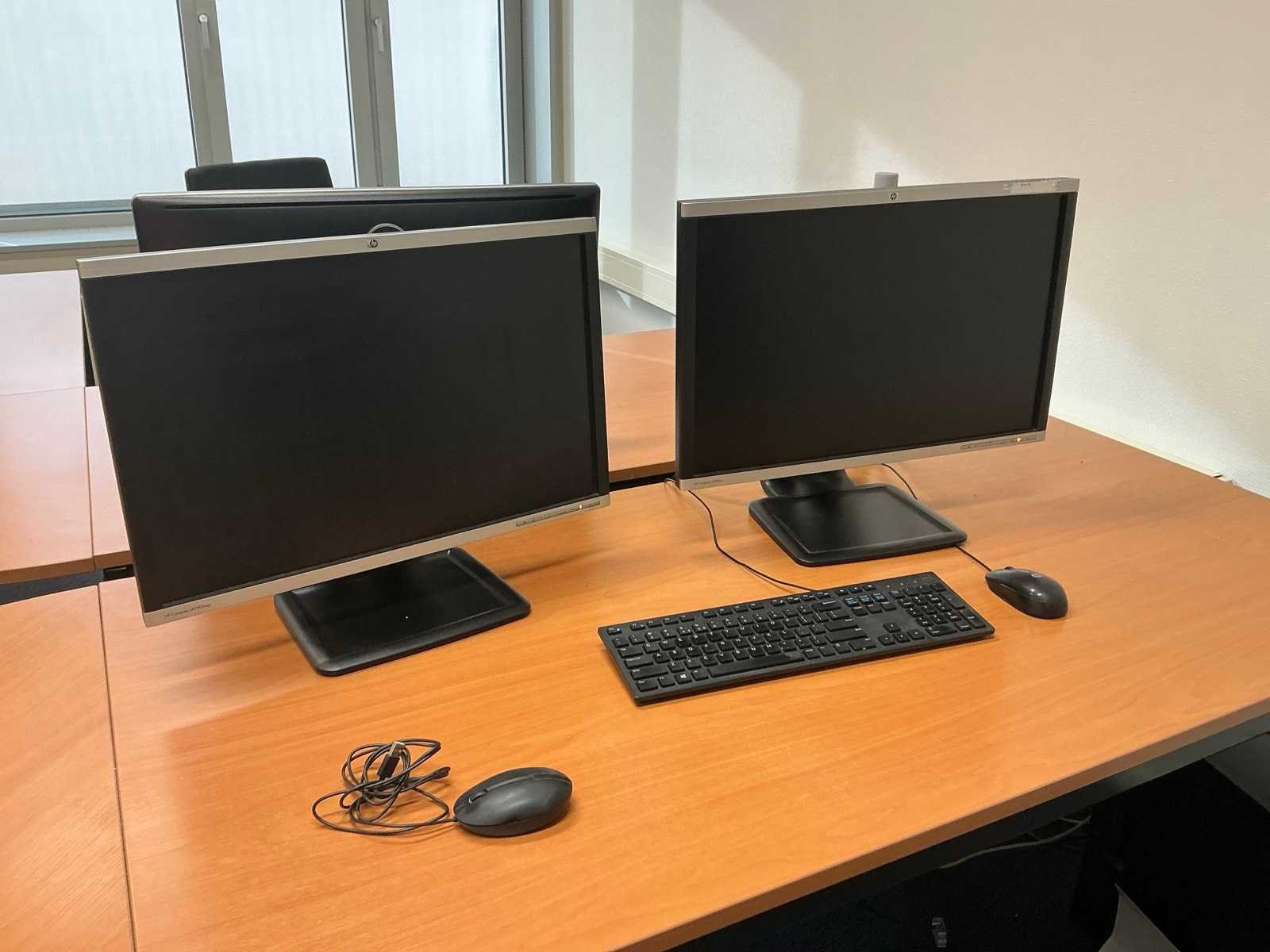 Bestaande uit 2x hoekbureau 240x200x80x75cm met bureaustoel, 1 kapstok, 1 archiefkast, 1x Dell monitor P2714ht, 2x HP LA2405x Nee