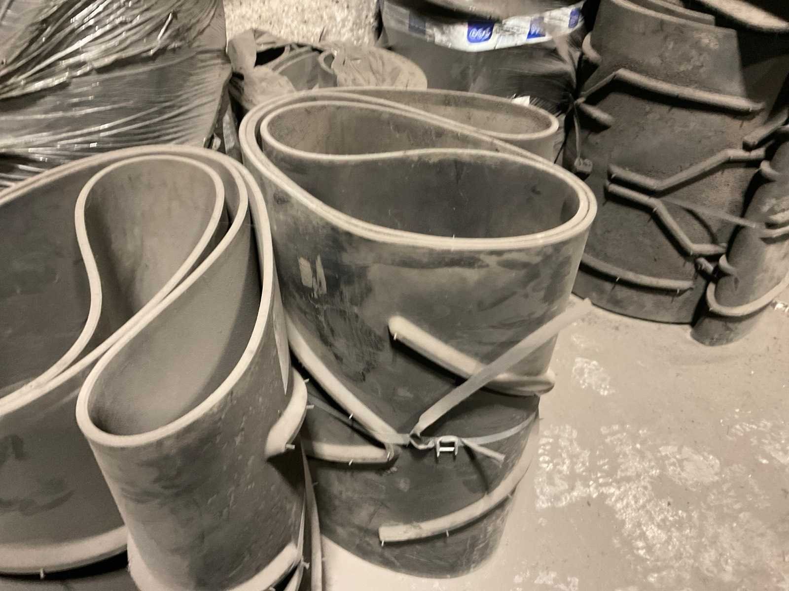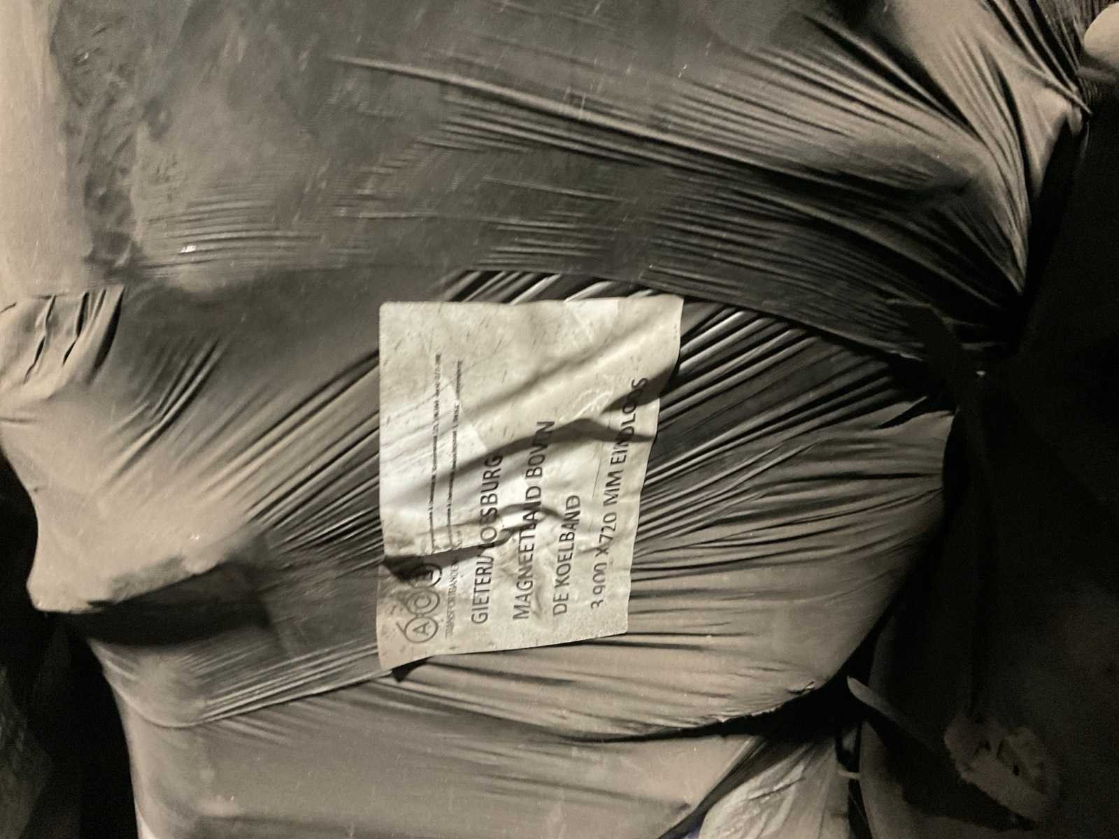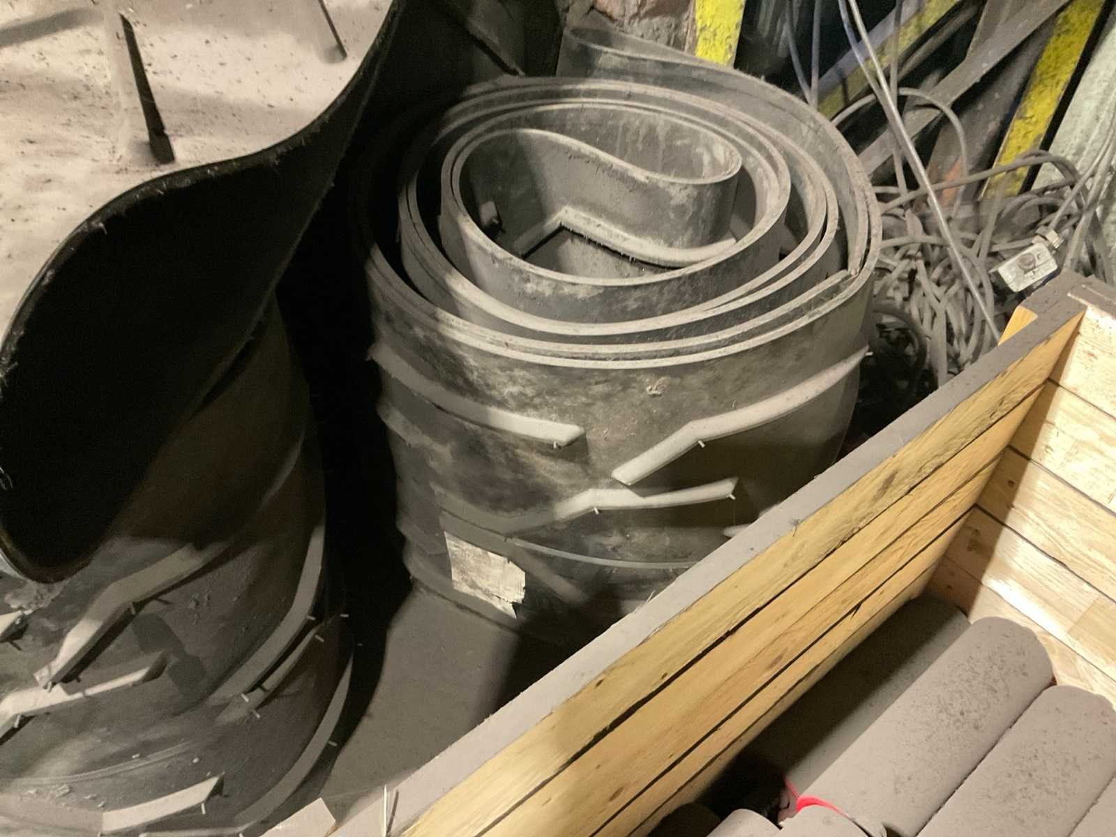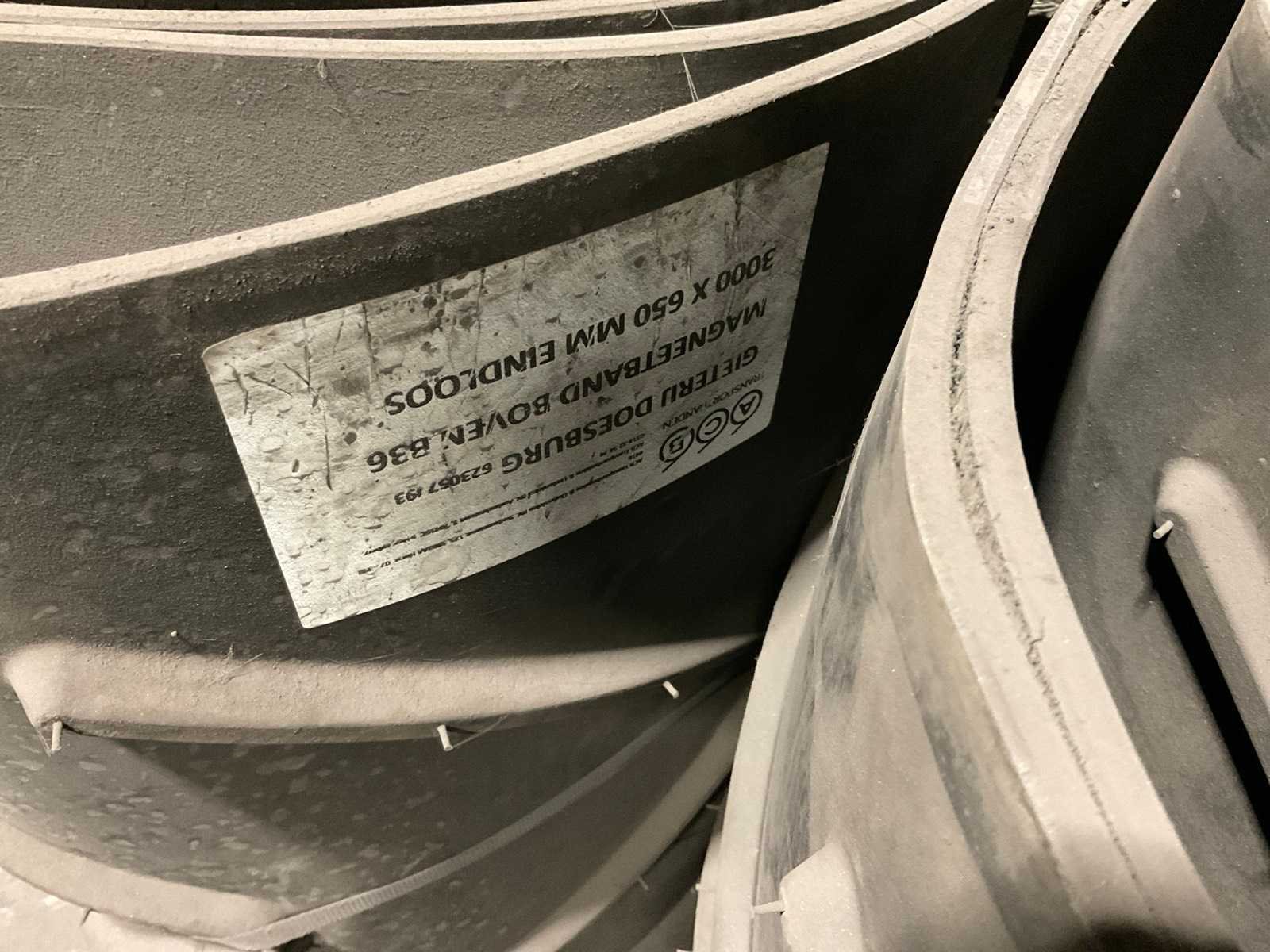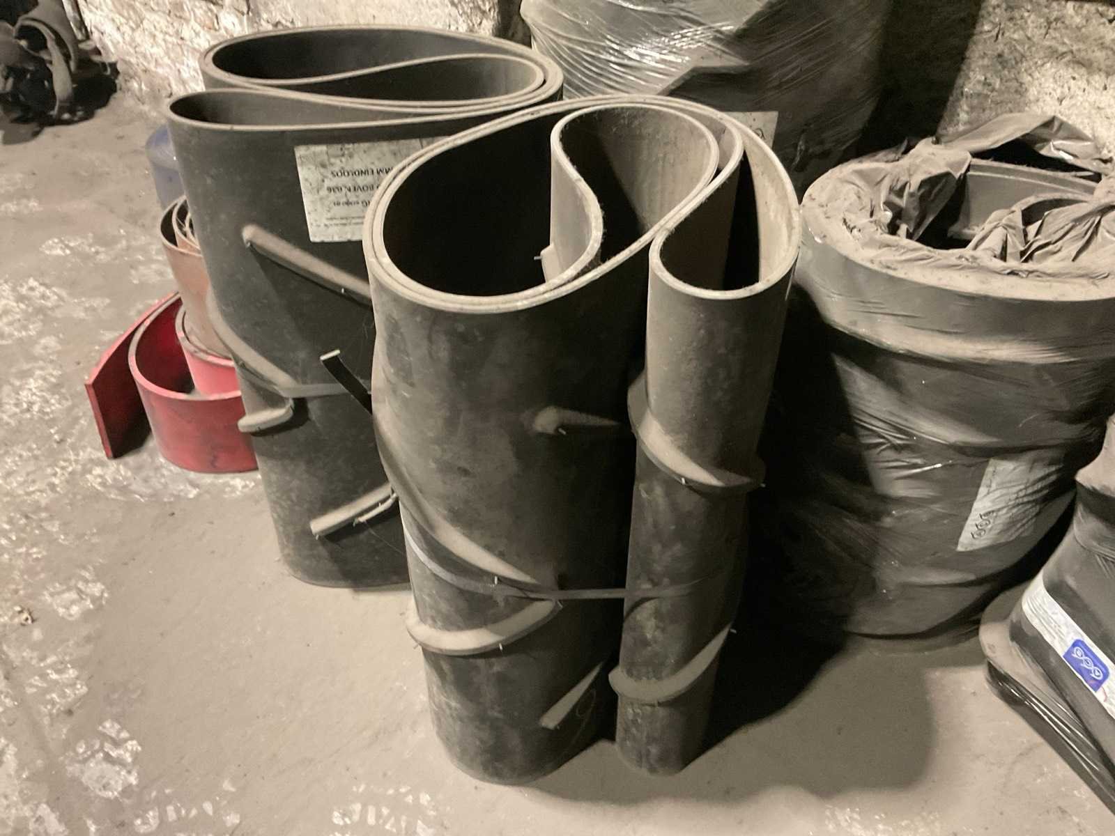 Diverse transportbanden in diverse breedtes en lengtes, o.a. 3900x720 mm, 3000x650 mm, etc. Inclusief losse rollen links ernaast. Nee