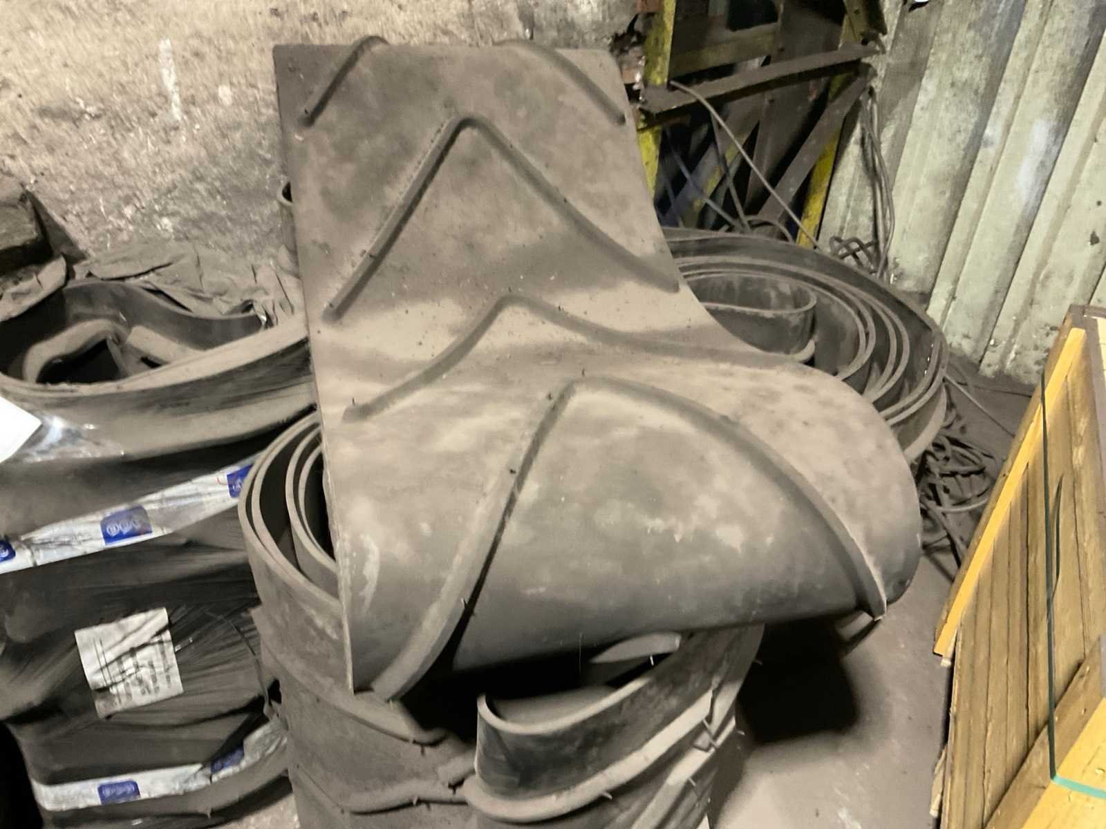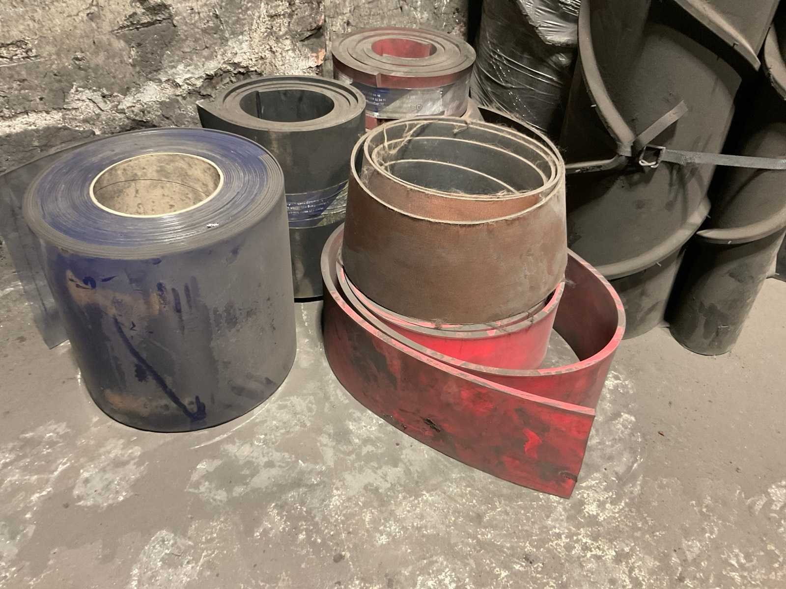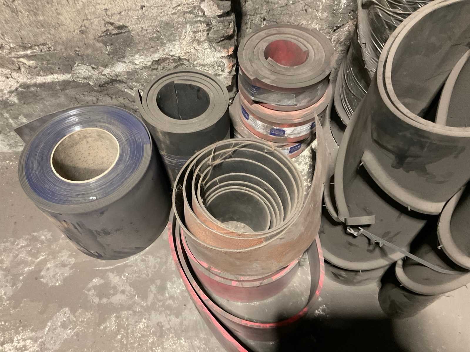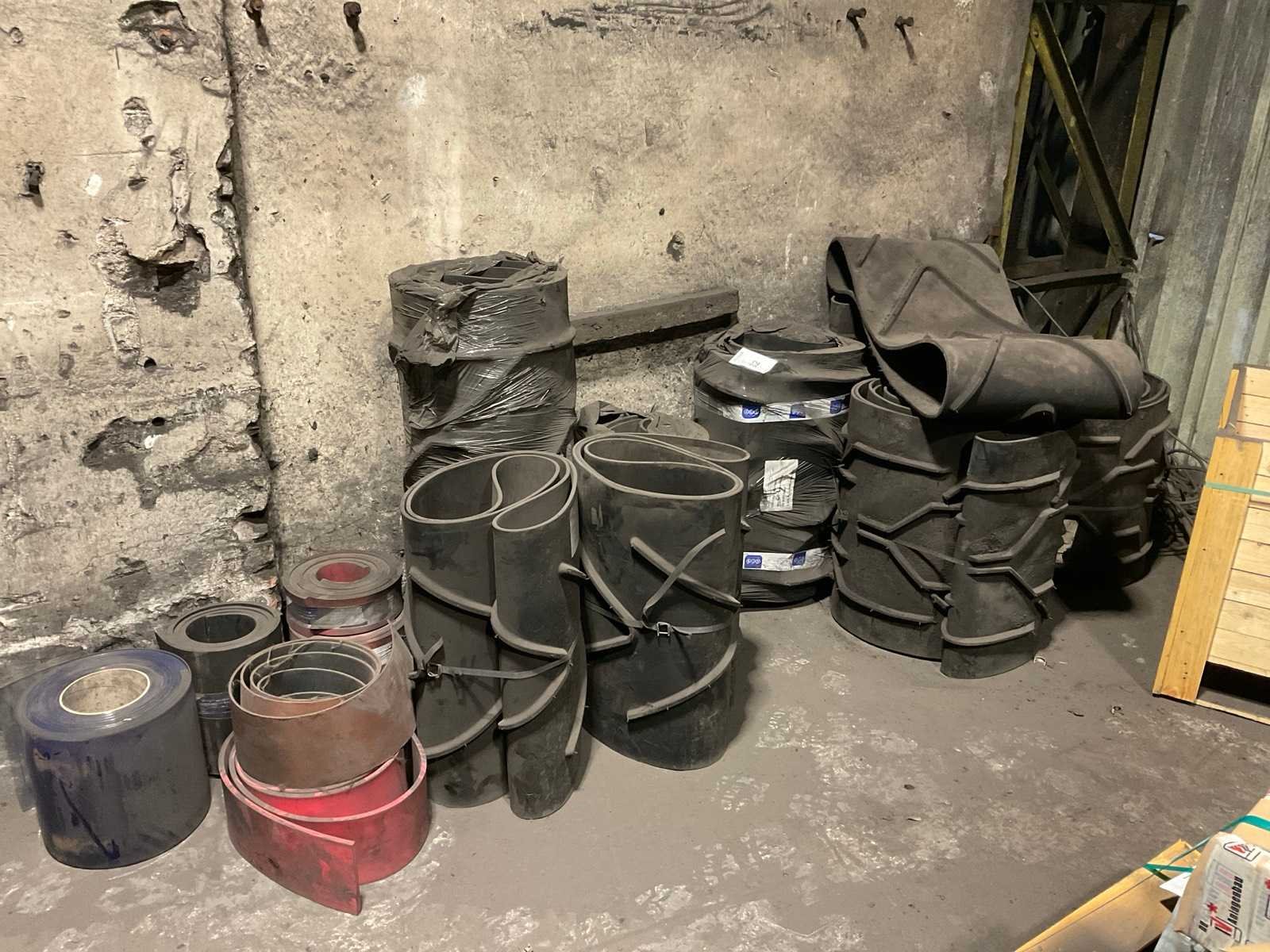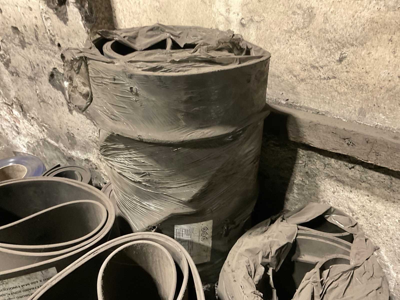 Diverse transportbanden in diverse breedtes en lengtes, o.a. 3900x720 mm, 3000x650 mm, etc. Inclusief losse rollen links ernaast. Nee