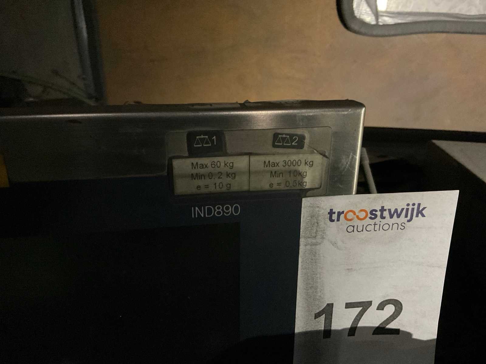 Inclusief kleine weegschaal voor Max.60 kg ca. 65x50 cm en barcodescanner. Nee Merk: Mettler Toledo Type: IND890 Weegbereik max: 3000000g Afleesnauwkeurigheid: 500g Minimum gewicht: 1000g Digitale uitlezing: true Aansluiting: 230V Totale afmeting L: 1250mm Totale afmeting Breedte: 1000mm Totale afmeting Hoogte: 100mm