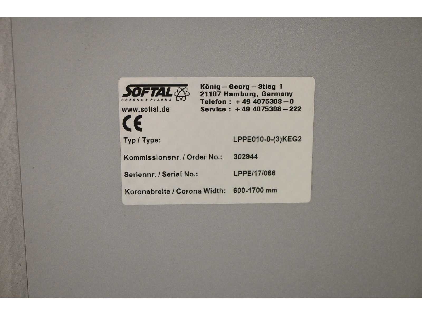 Korona breedte: 600-1700 mm. Voorzien van Softal Sorbal 2-1000 systeem. Serienummer: SOR/17/032. Machine investering: €600.000 excl. BTW. Dit kavel is onderdeel van combinatie-kavel 221 (kavel 201-220). Nee Merk: Softal Type: LPPE010-0-(3)KEG 2 Bouwjaar: 2017 Serienummer: 302944/LPPE/17/066 Aansluiting: 400V Totale afmeting L: 3000mm Totale afmeting Breedte: 800mm Totale afmeting Hoogte: 2060mm