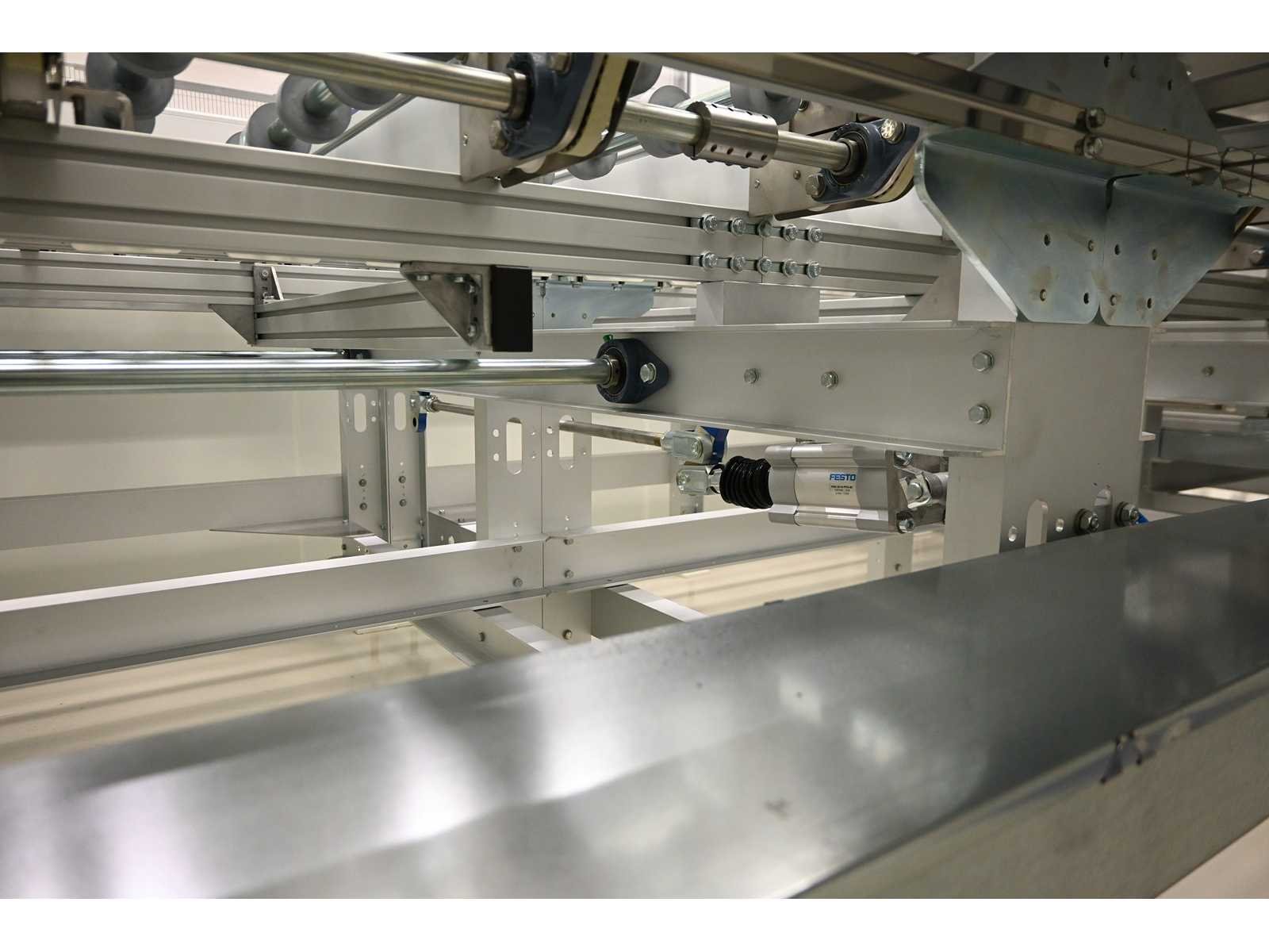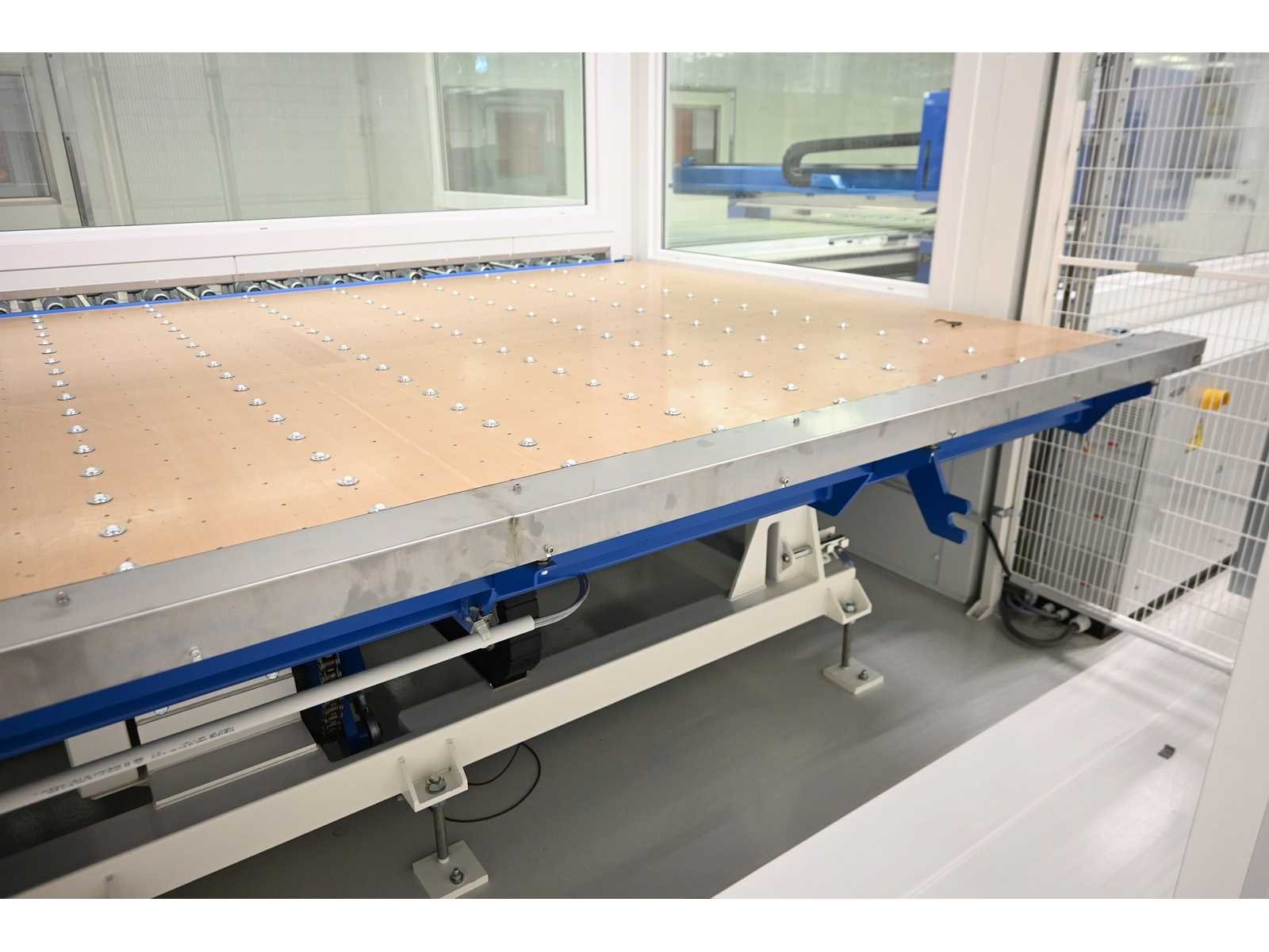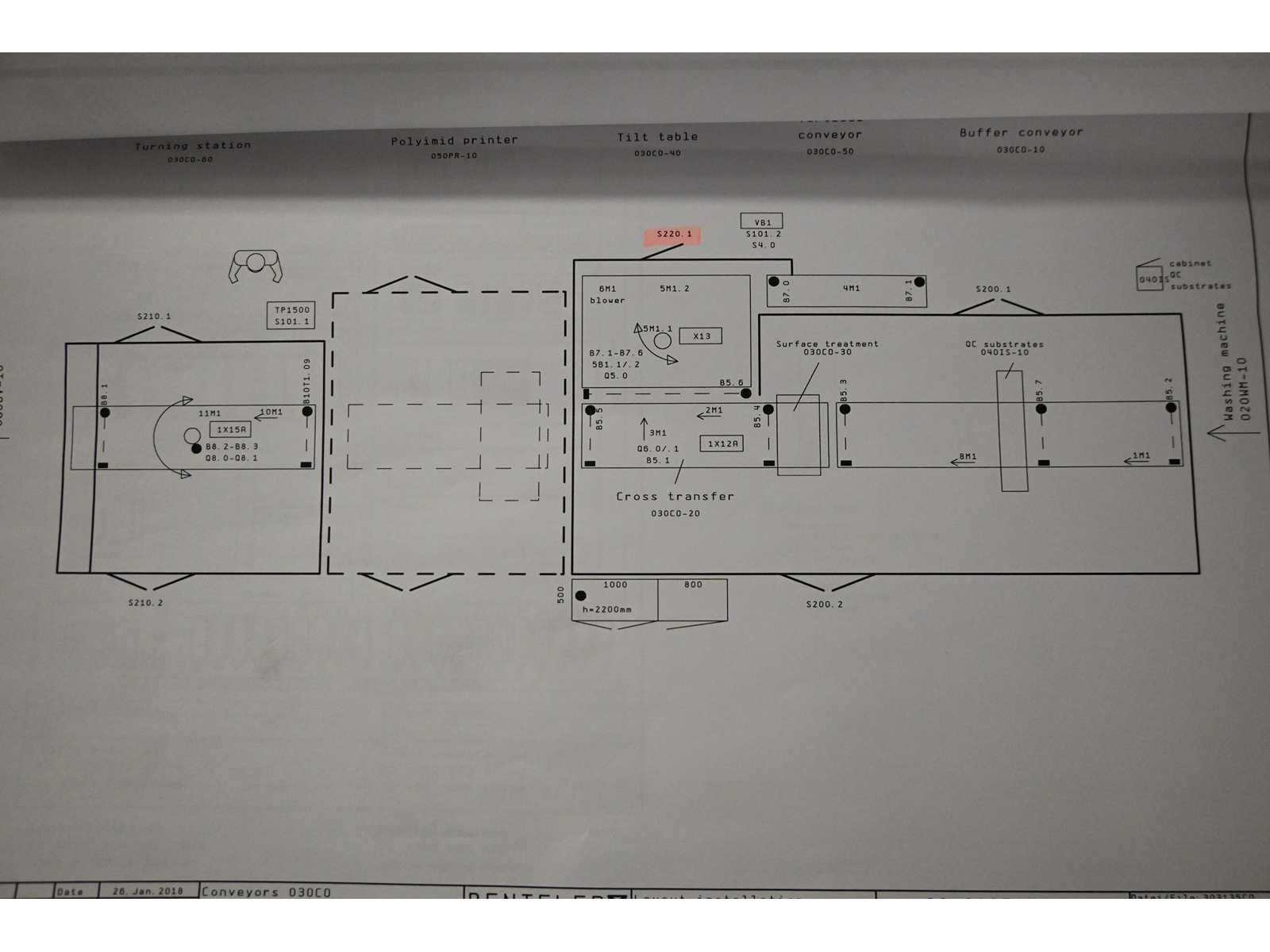 Met Siemens Simatic HMI besturingsysteem. Bestaande onder andere uit 1 x in hoogte verstelbare transport tafel die maakt van een verticaal transport proces een horizontaal transportproces. Of van een horizontaal transport proces een verticaal transport proces. Afmeting ca. L400 x B3950 x H1000 mm. Tevens 2 x Benteler Unloading conveyor in hoogte verstelbare transporttafel (afmeting ca. L400 x B210 x H100cm en L550 x B210 x H100cm), 1 x Benteler Cross belt Conveyor in hoogte verstelbare transporttafel (Afmeting ca. L370 x B225 x H100 cm), Benteler kantelbare kogelrol in hoogte verstelbare transport tafel (Afmeting ca. L378 x B255 x H100 cm) en 1 x Benteler verticale glas zij-uitgifte (Afmeting ca. L425 x B75 x H227cm. Machine-investering: €220.000 excl. BTW. Dit kavel is onderdeel van combinatie-kavel 221 (kavel 201-220). Nee Merk: Benteler Type: (Turn over Device) Conveyor unloading / Crossbelt Conveyor Bouwjaar: 2017 Aansluiting: 400V