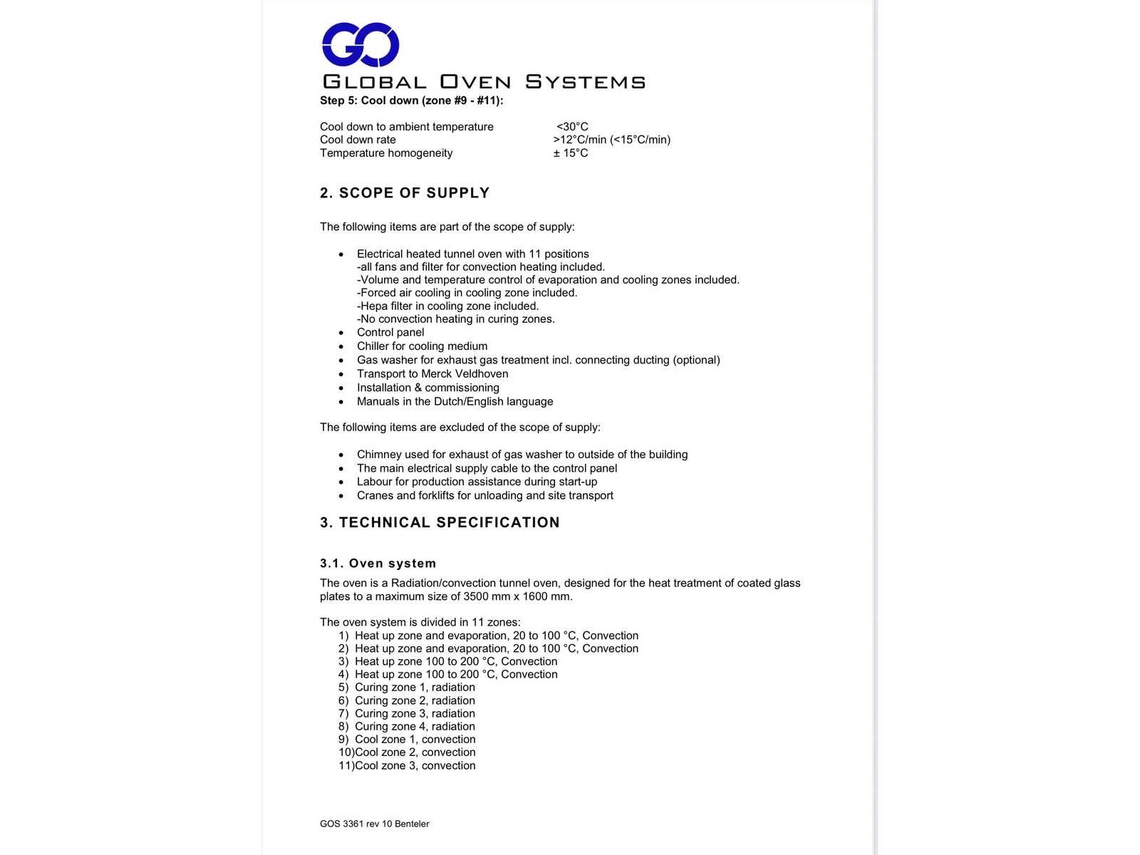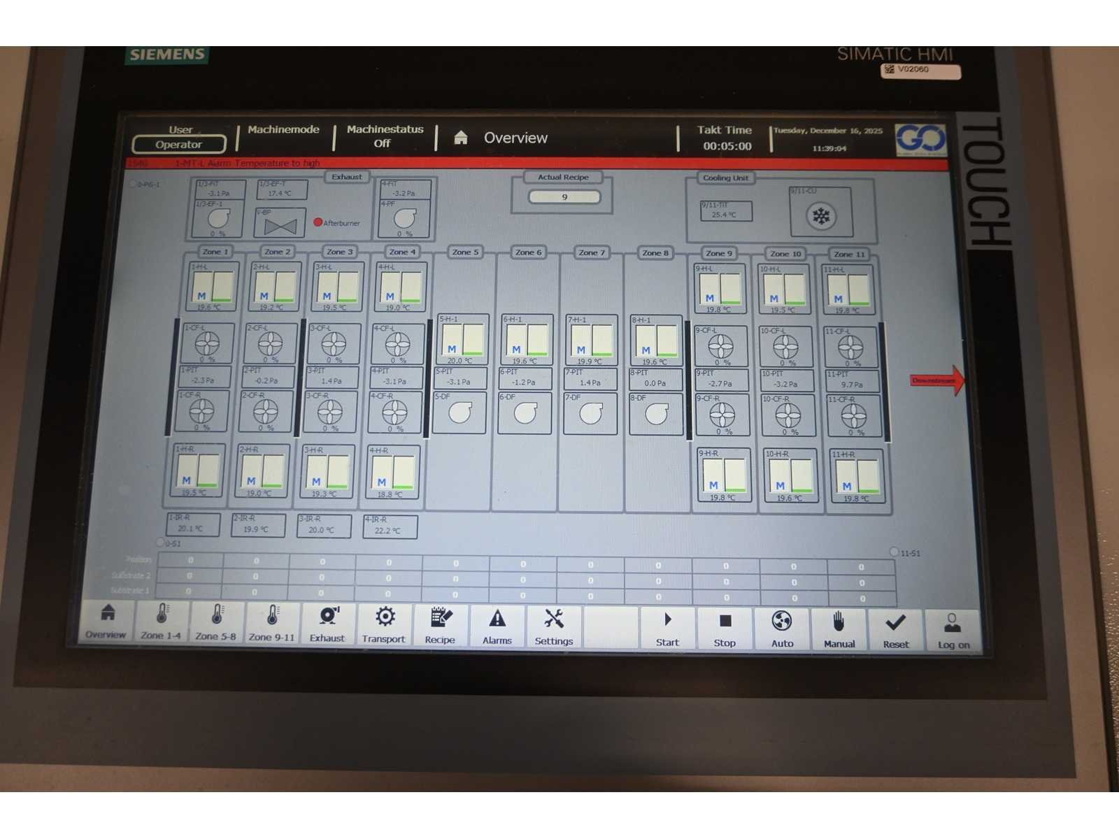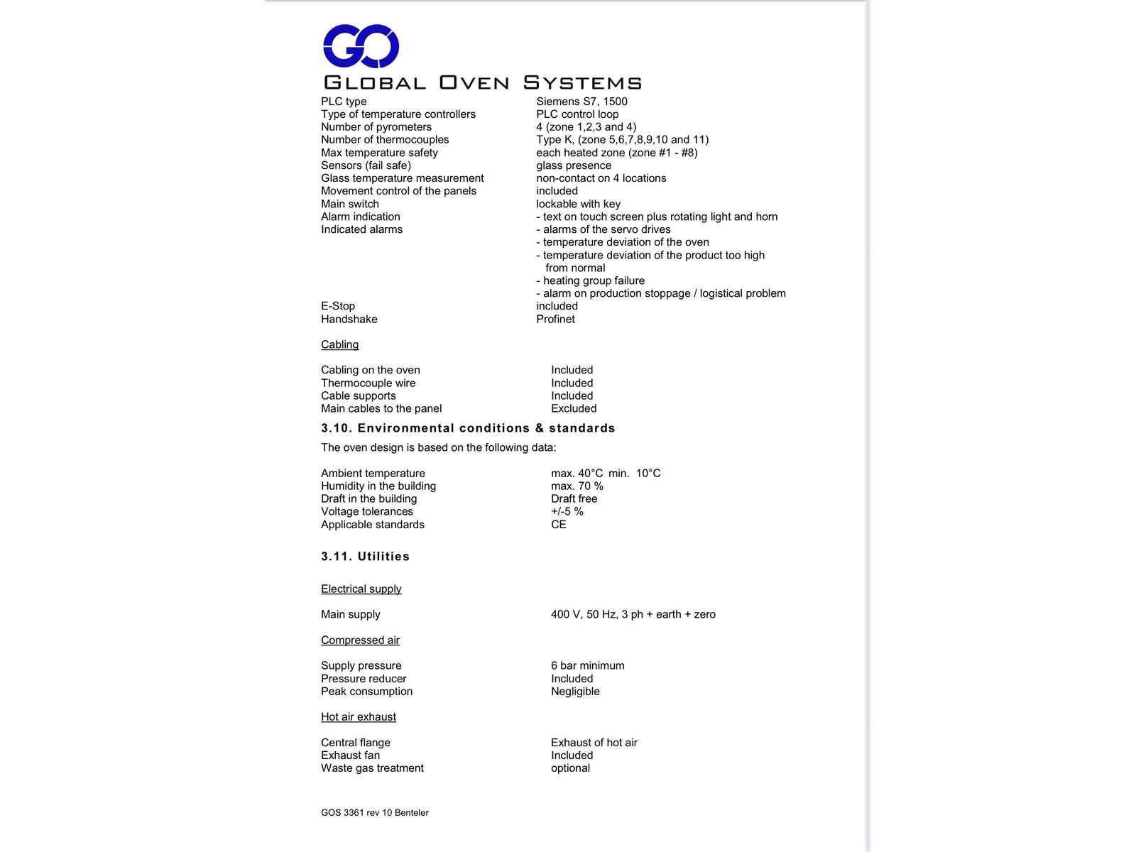 260KW. Bestaande uit 3 zones. 1. Opwarmzone. 2. Oven. 3. Afkoelzone. De oven zelf bestaat uit 11 afsluitbare zones die naar temperatuur in te regelen zijn. De oven is nu ingesteld op 2 x 100 graden, 6 x 200 graden, 1 x 150 graden, 1 x 75 graden en 1 x 40 graden. Inclusief gas affakkel systeem voor de eerste 2 opwarmzones. Voorzien van Siemens Simatic HMI touch besturingsysteem. Werkbreedte ca. 350 cm. Maximale werkbreedte ca. B3500 x L1600 x 4.2mm. Maximum oven-temperatuur: 250 graden. Inclusief machine-boeken. Machine investering: €980.000 excl. BTW. Dit kavel is onderdeel van combinatie-kavel 221 (kavel 201-220). Nee Merk: Global Oven Systems Type: TCRE Bouwjaar: 2017 Serienummer: 16-088 Kamer afmeting l: 215000mm Kamer afmeting b: 3500mm Kamer afmeting h: 950mm Maximale temperatuur: 230°c Aansluiting: 400V Totale afmeting L: 21500mm Totale afmeting Breedte: 4500mm Totale afmeting Hoogte: 2500mm