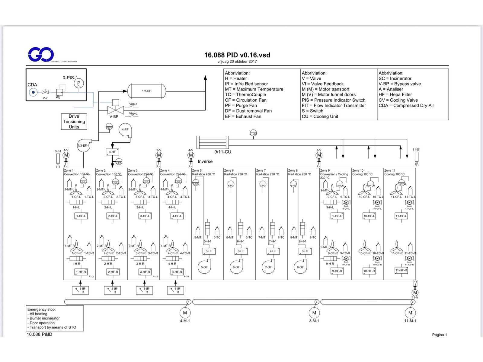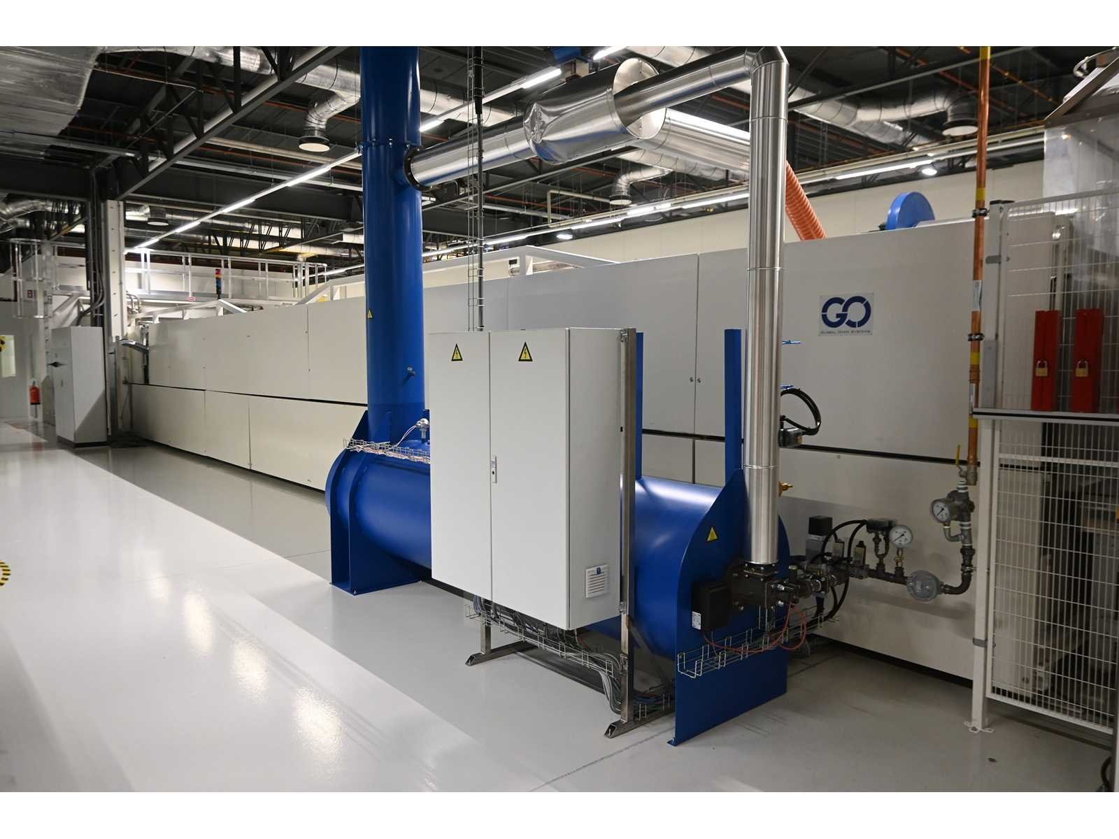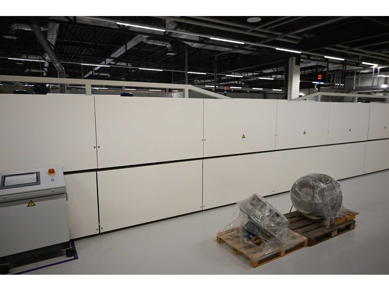 260KW. Bestaande uit 3 zones. 1. Opwarmzone. 2. Oven. 3. Afkoelzone. De oven zelf bestaat uit 11 afsluitbare zones die naar temperatuur in te regelen zijn. De oven is nu ingesteld op 2 x 100 graden, 6 x 200 graden, 1 x 150 graden, 1 x 75 graden en 1 x 40 graden. Inclusief gas affakkel systeem voor de eerste 2 opwarmzones. Voorzien van Siemens Simatic HMI touch besturingsysteem. Werkbreedte ca. 350 cm. Maximale werkbreedte ca. B3500 x L1600 x 4.2mm. Maximum oven-temperatuur: 250 graden. Inclusief machine-boeken. Machine investering: €980.000 excl. BTW. Dit kavel is onderdeel van combinatie-kavel 221 (kavel 201-220). Nee Merk: Global Oven Systems Type: TCRE Bouwjaar: 2017 Serienummer: 16-088 Kamer afmeting l: 215000mm Kamer afmeting b: 3500mm Kamer afmeting h: 950mm Maximale temperatuur: 230°c Aansluiting: 400V Totale afmeting L: 21500mm Totale afmeting Breedte: 4500mm Totale afmeting Hoogte: 2500mm