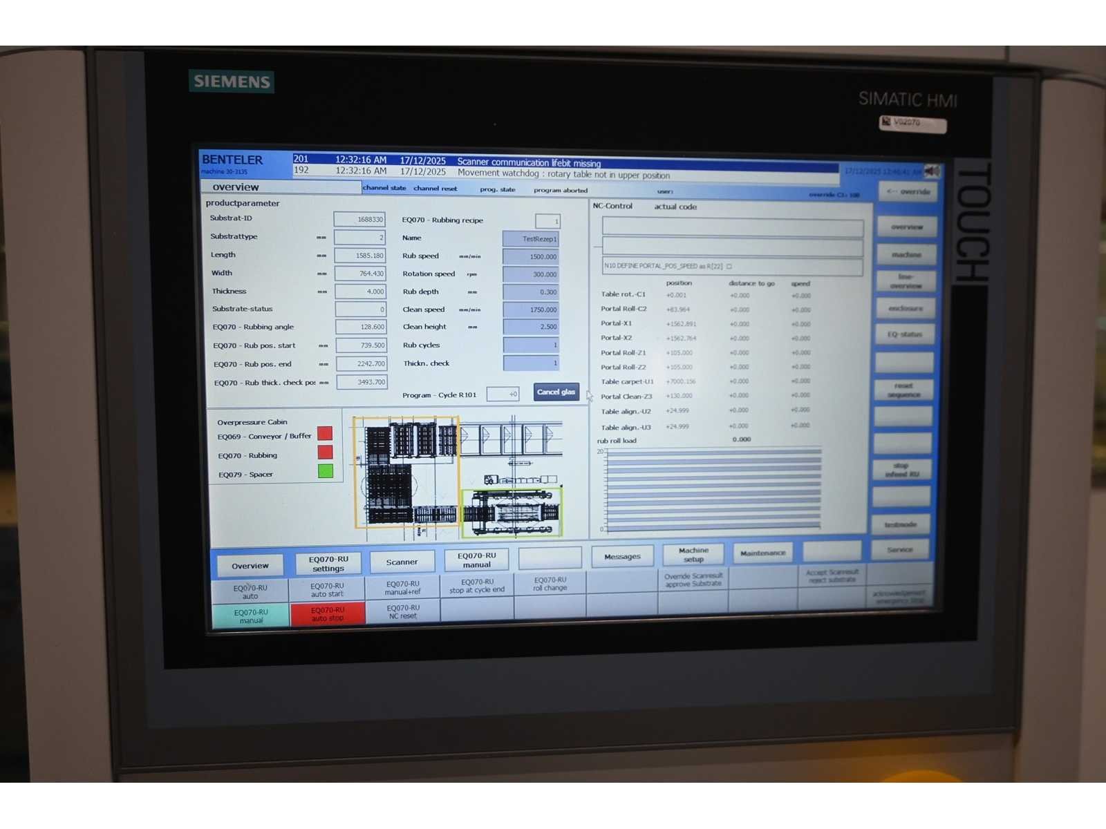Voorzien van hardstenen vlakteplaat, afmeting ca. 3600 x 1800mm. Machine investering €585.000 excl. BTW. Afmeting Benteler aanvoertafel ca. L120 x B210 x H95cm en Benteler kantelbare aanvoertafel ca. L204 x B210 x H95cm. Afmeting Benteler kantelbare uitvoer tafel ca. L166 x B210 x H95cm. Inclusief 2-Delige carbon rubbing rol uitwisselsysteem vacumeer tafel . Dit kavel is onderdeel van combinatie-kavel 221 (kavel 201-220). Nee Merk: Benteler Type: Friction Unit Bouwjaar: 2018 Serienummer: 30-3135-19 Aansluiting: 400V Eigen gewicht: 10000kg Totale afmeting L: 7500mm Totale afmeting Breedte: 6000mm Totale afmeting Hoogte: 2000mm