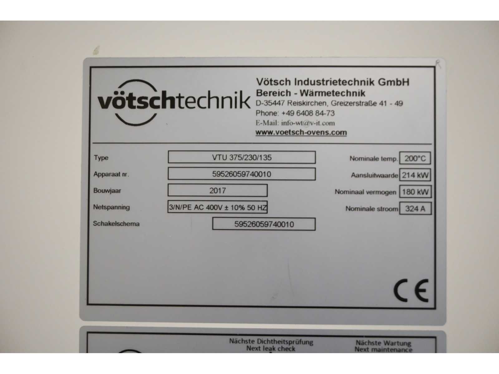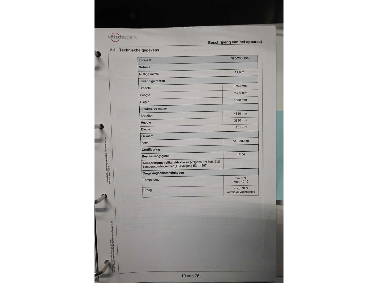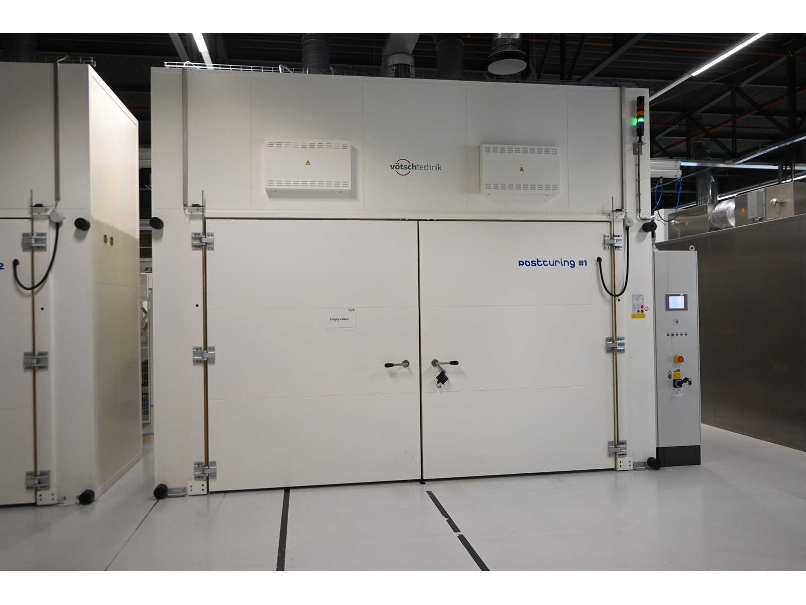 11,6m3 gebruiks ruimte. Inwendige maten ca. L3750 x D1350 x H2300mm. Nominaal vermogen: 180KW. Aangesloten vermogen: 324KW. Inclusief touchscreen besturing systeem. Oven nummer 1. Oven Nummer 2 is kavel 303. Machine-investering: €145.000,- excl. BTW Nee Merk: Vötsch Type: VTU 375/230/135-200Celsius Bouwjaar: 2017 Serienummer: 59526059740010 Kamer afmeting l: 3750mm Kamer afmeting b: 1350mm Kamer afmeting h: 2300mm Maximale temperatuur: 200°c Aansluiting: 400V Eigen gewicht: 3500kg Totale afmeting L: 4850mm Totale afmeting Breedte: 1705mm Totale afmeting Hoogte: 3880mm