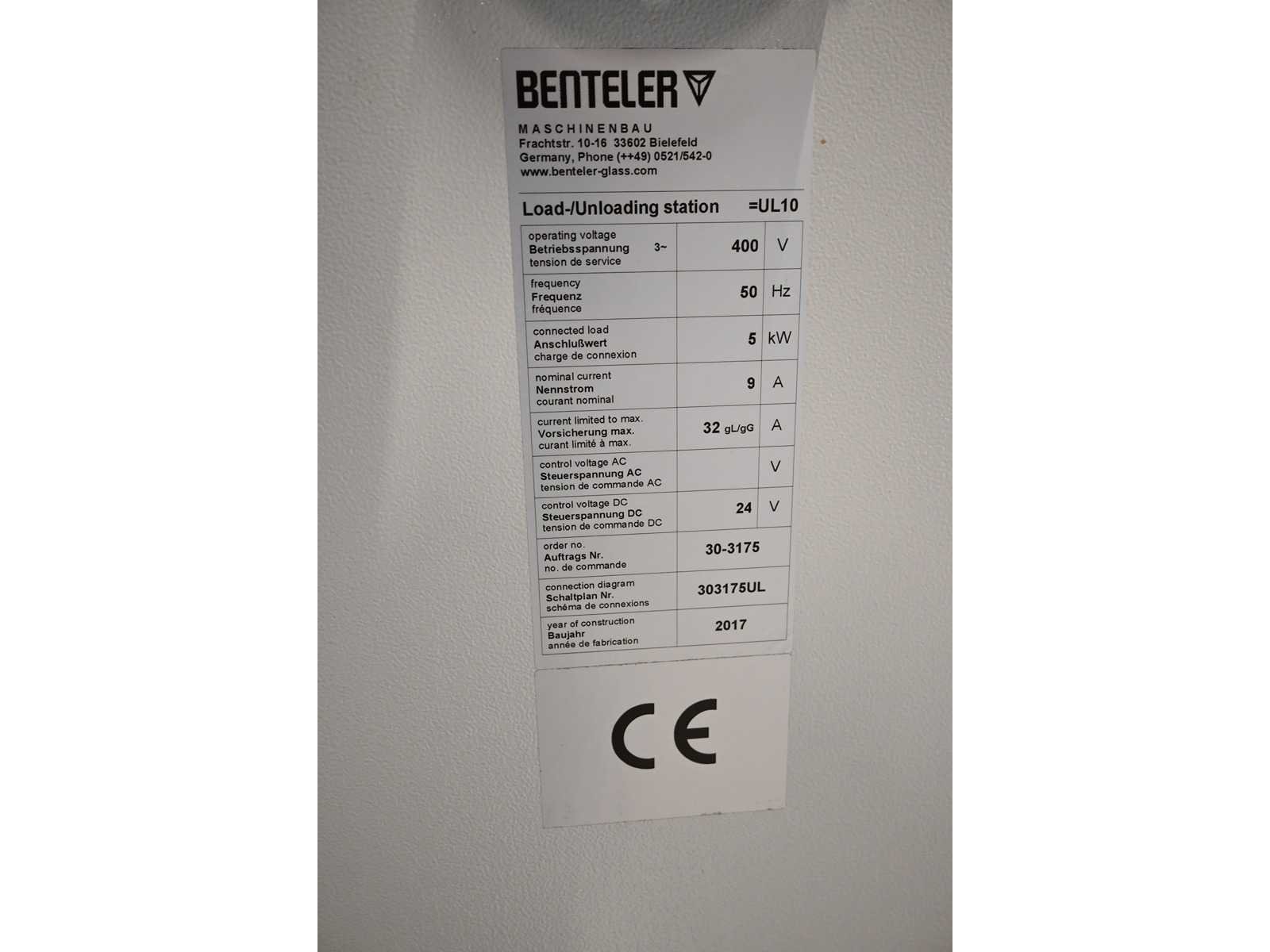 Bestaande uit Benteler Vertical Loading / Unloading Conveyor (afmeting ca. L425 x B200 x H220 cm) en 1 x Benteler glas ontlaadstation (afmeting ca. L375 x B80 cm). Voorzien van Siemens Simatic HMI Touch - besturing. Inclusief machine- hekwerk met Leuze elektronische laser beveiliging systeem. Machine-investering: €144.000,- excl. BTW. Nee Merk: Benteler / Masévon Type: Vertical Conveyor Bouwjaar: 2017 Serienummer: 30-3175 Aansluiting: 400V