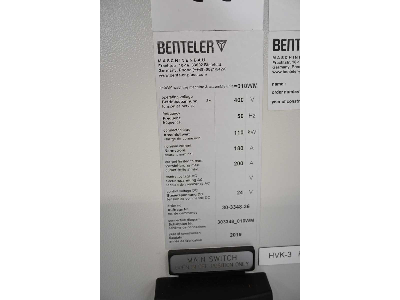 Afmeting kantelbare glastafel ca. L400 x B160 x H215cm, afmeting infeed conveyor L400 x B210 x H98 cm, afmeting Wasmachine ca. L435 x B300 x H220 c.m. Inclusief Siemens HiMatic Touch Operator system. Machine-investering: €223.000,- exclusief BTW. Dit kavel is onderdeel van combinatie-kavel 409 (kavel 401-408). Nee Merk: Benteler Type: TecLine TecWasher F.18/S-B2-B-R-CKK Bouwjaar: 2019 Serienummer: 30-3348 Aansluiting: 400V