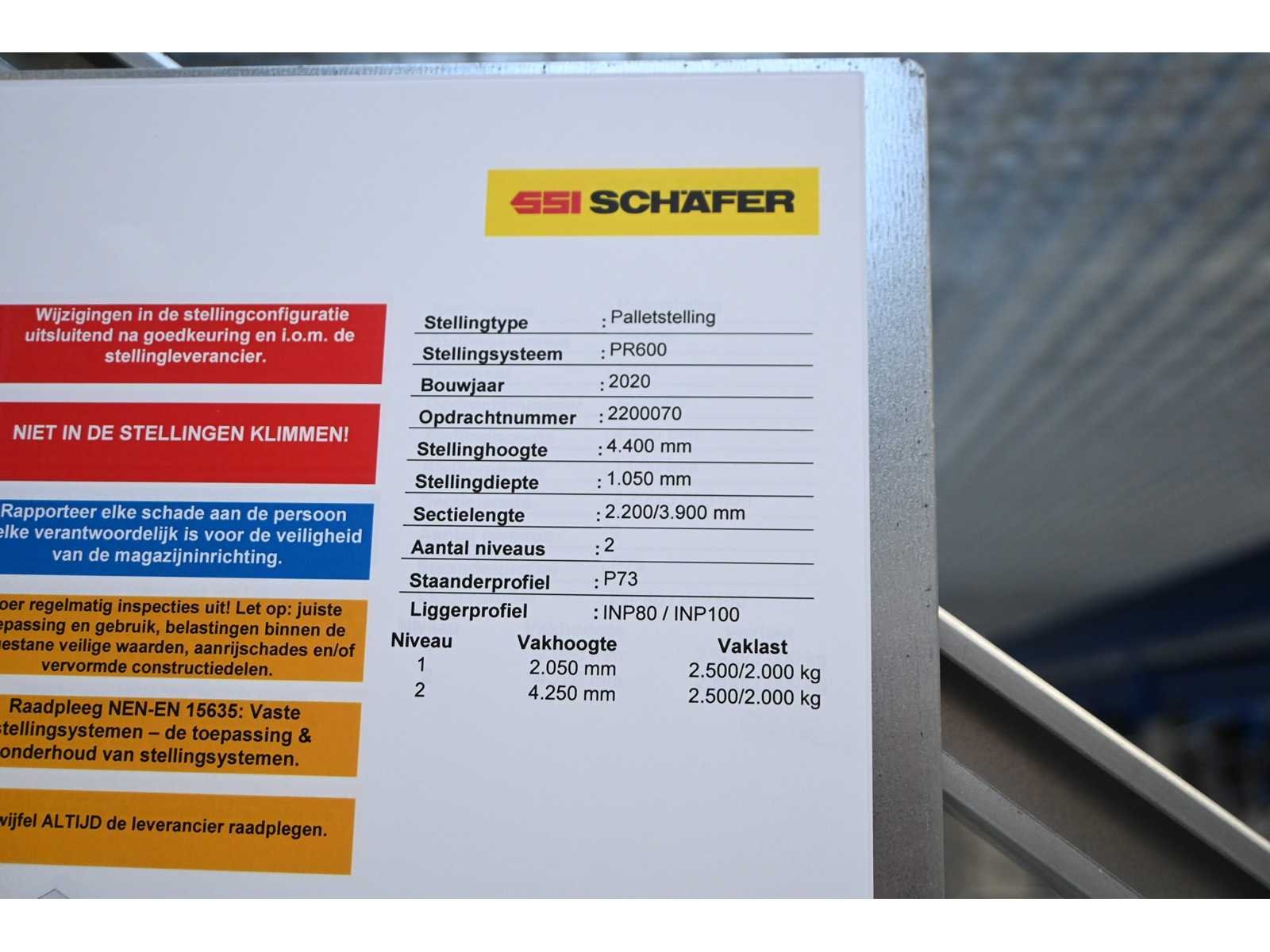 14 x sectiebreedte 400cm, 56 liggers van 400 cm, 8 x sectiebreedte 220cm, 32 liggers van 220 cm. Inclusief Schäfer legborden, aanrijd beveiliging, etc. Nee Merk: SSI Schäfer Type: PR600 Bouwjaar: 2020 Aantal secties: 22 Sectie afm. b: 3900mm Sectie diepte: 1050mm Sectie afm. h: 4400mm Aantal staanders: 24 Aantal liggers: 88 Aantal legborden: 88 Max. sectiebelasting: 5800kg Demontabel: true