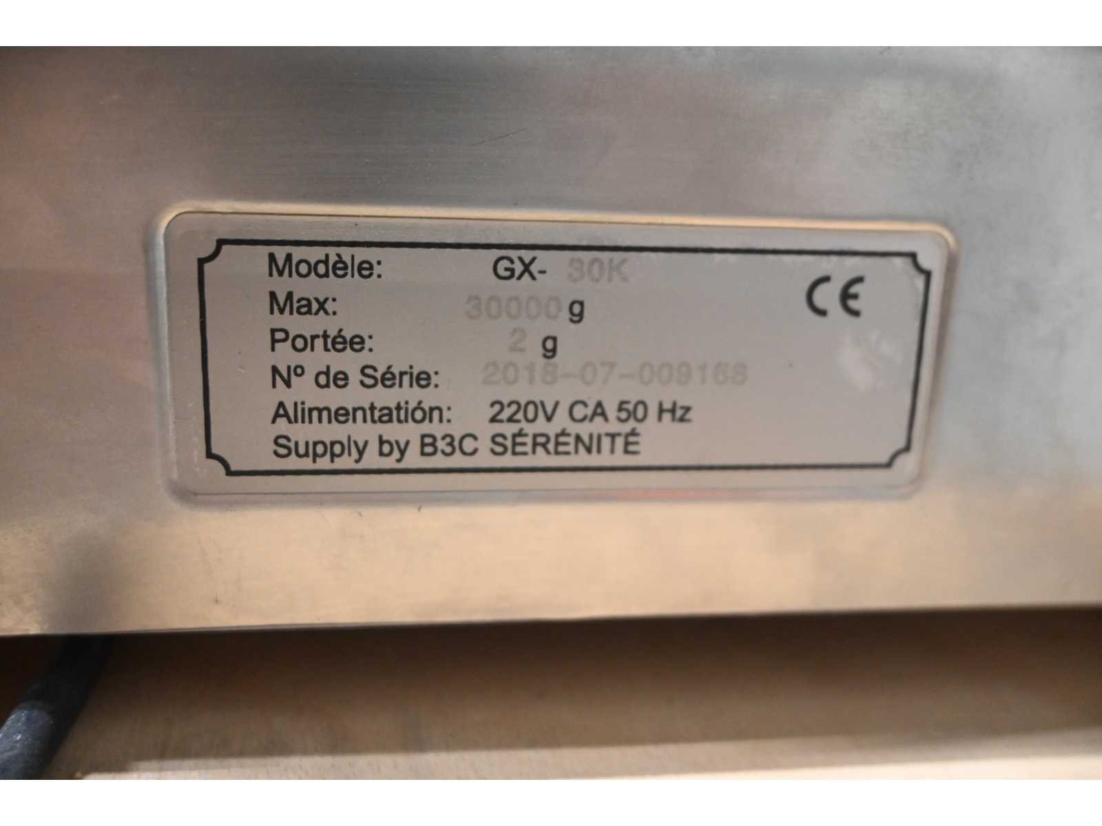 Nee Merk: Sérénité Type: B3C Pesage GX30K Weegbereik max: 30000g Afleesnauwkeurigheid: 2g Aansluiting: 230V