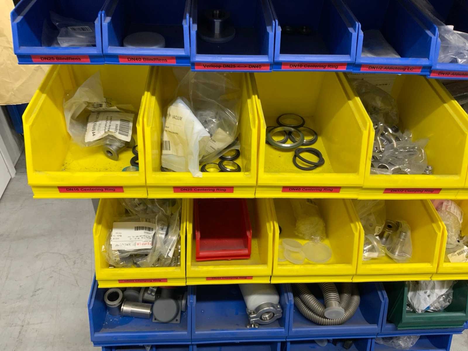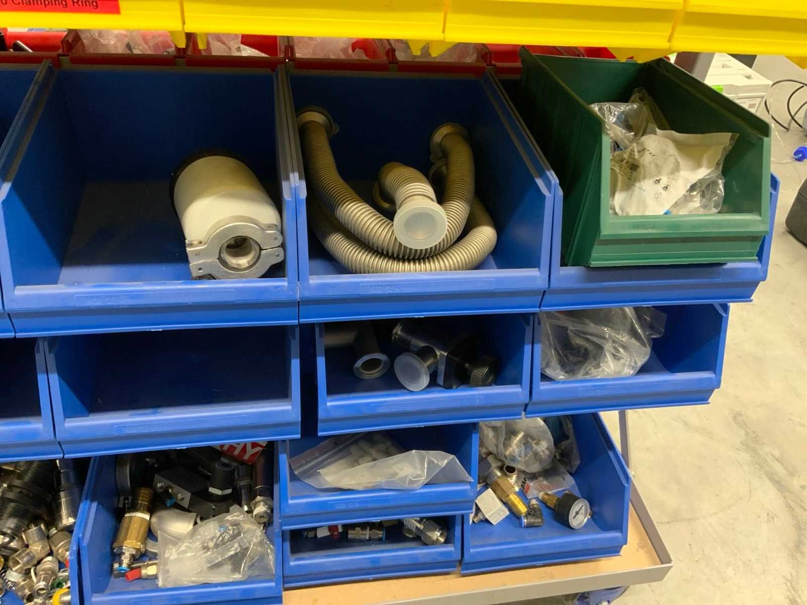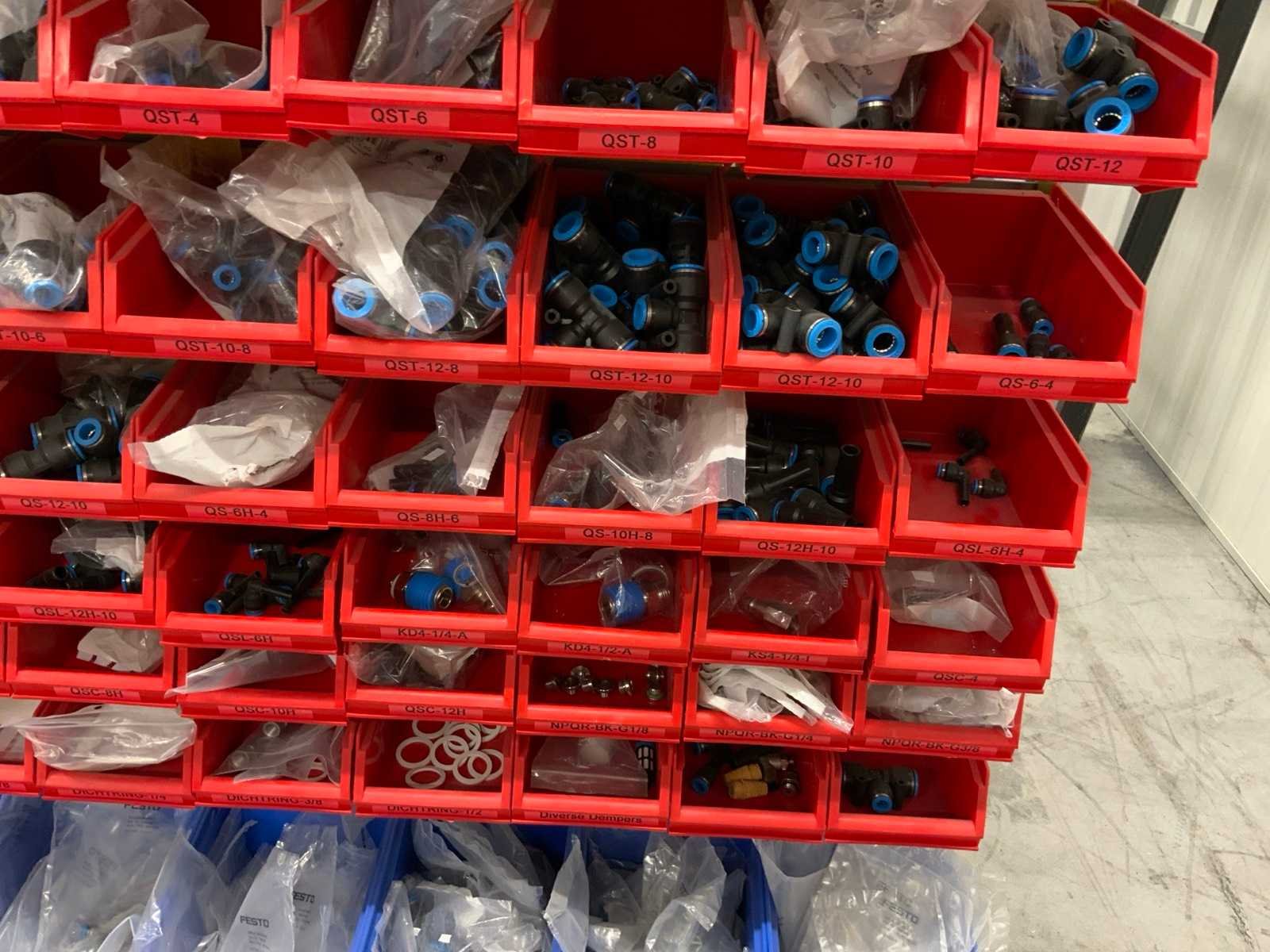 Bestaande uit 137 magazijnbakken, deels gevuld met onder andere Festo onderdelen, types onder andere: QS, QST, QSF, QSL, GRLA, ETC. Nee Merk: Festo Model: QSM / QS / QSL / QST Lengte: 88cm Breedte: 63cm Hoogte: 153cm