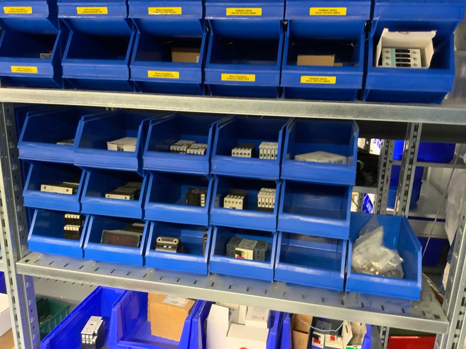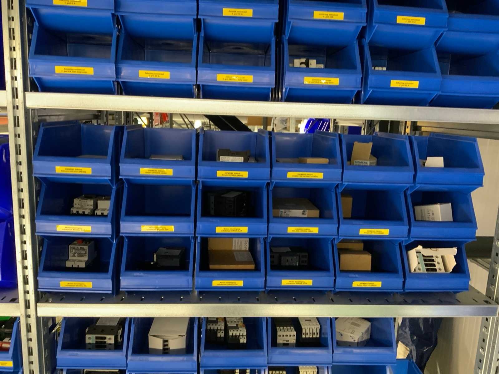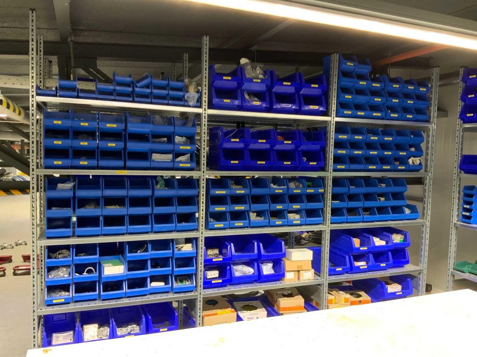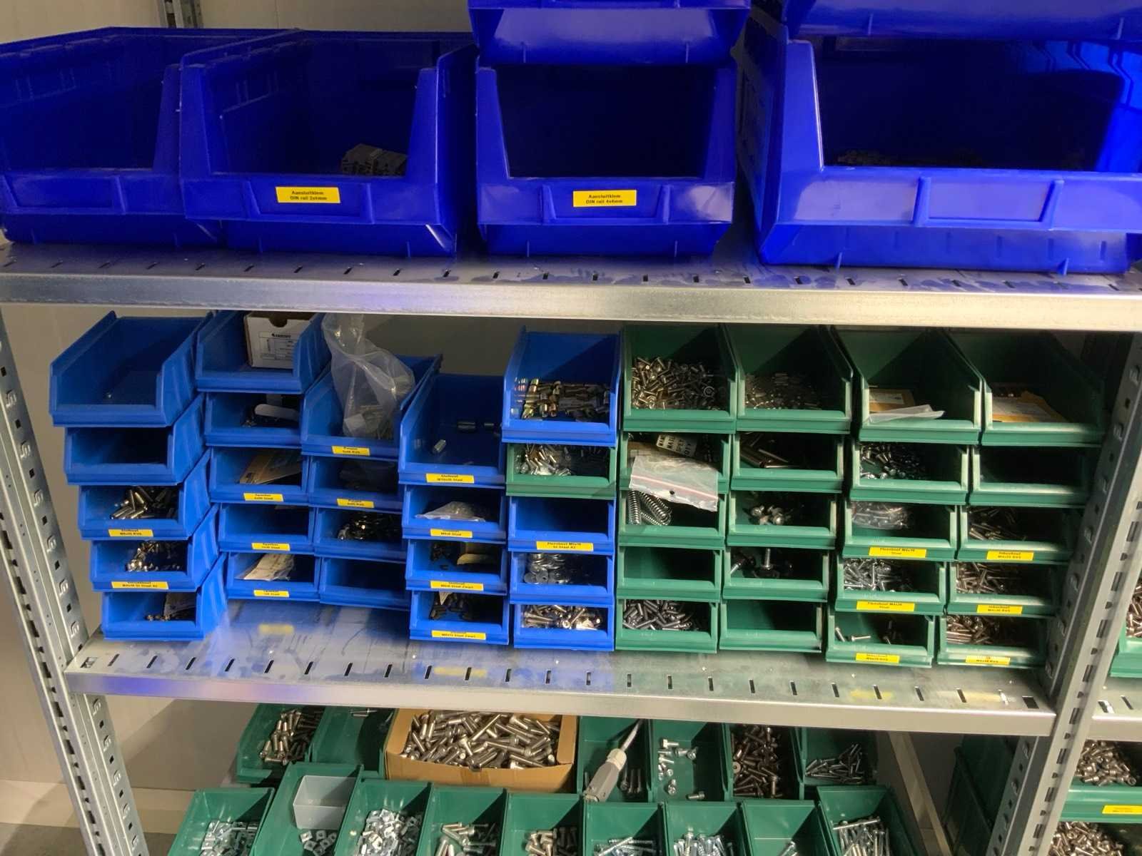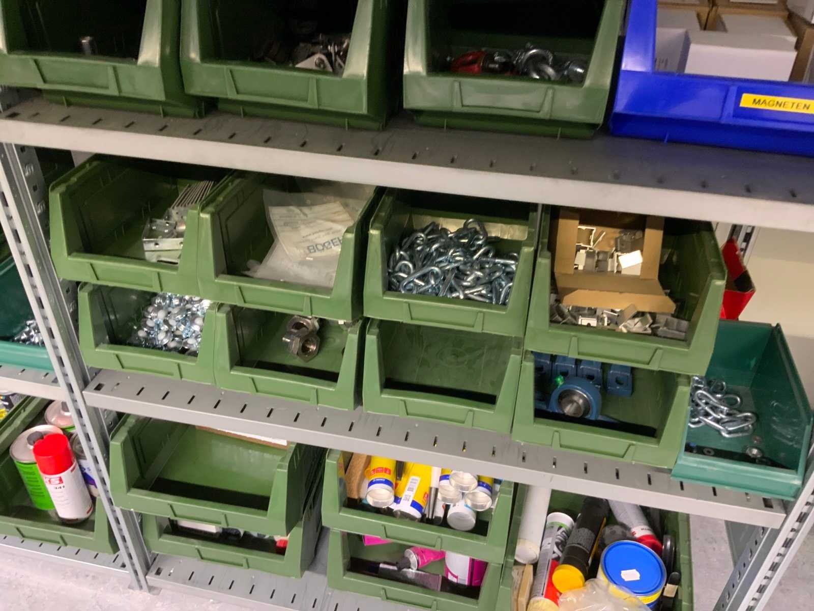 Inhoud installatiematerialen (ca. 500 sorteerbakken) van 9 legbordstellingen