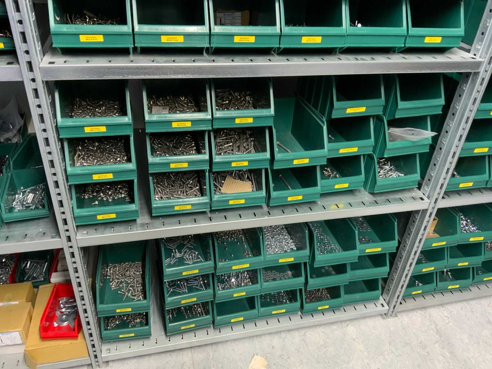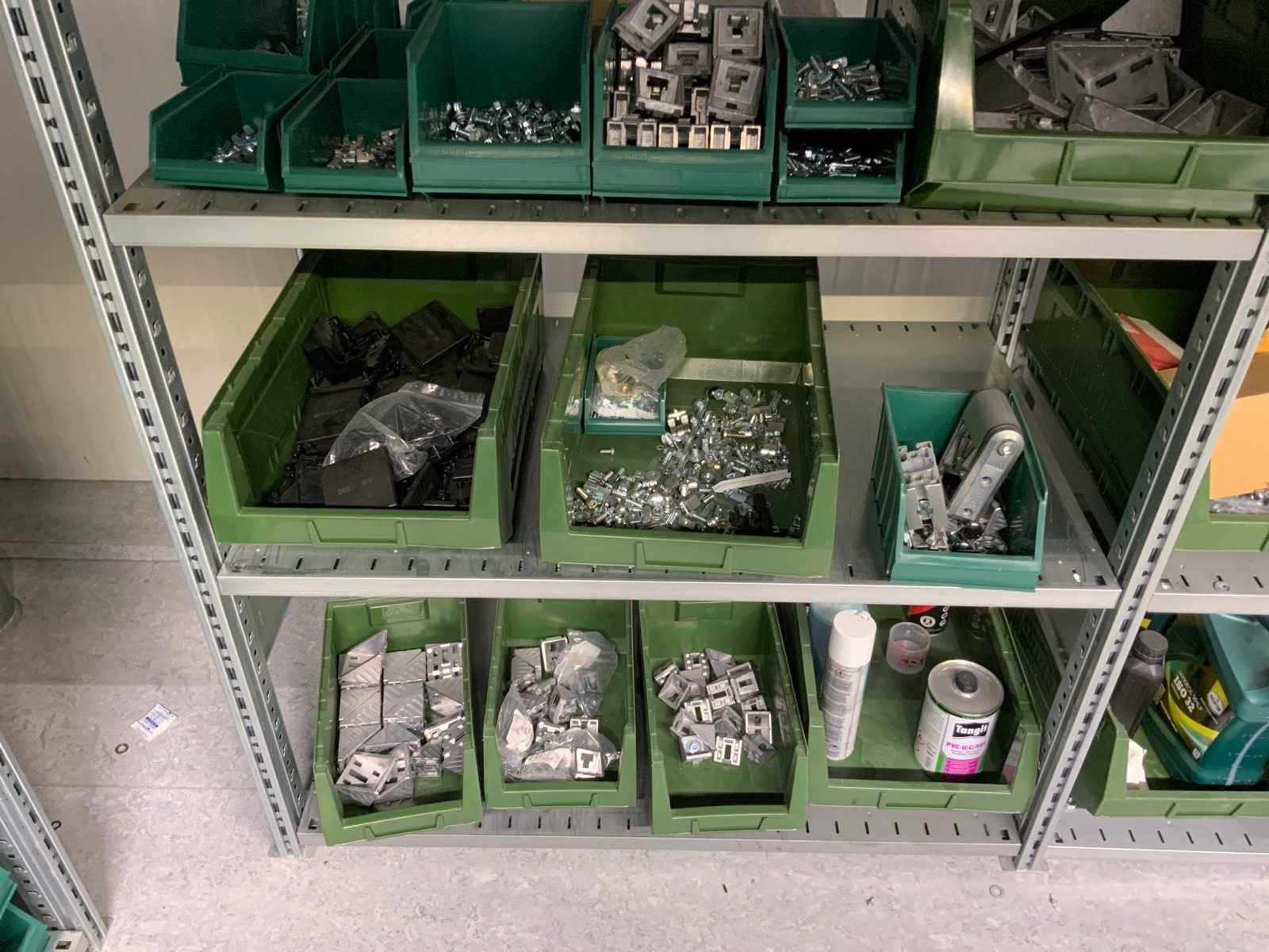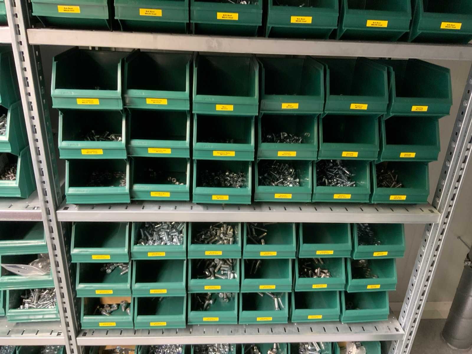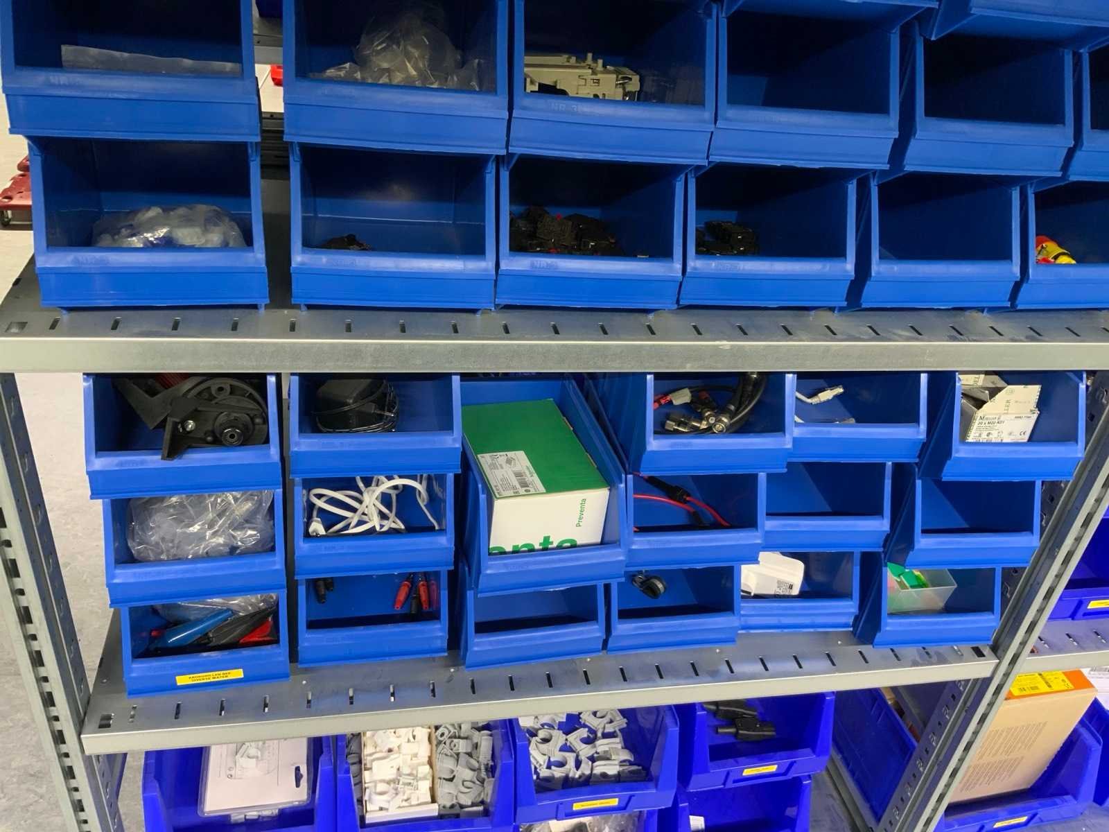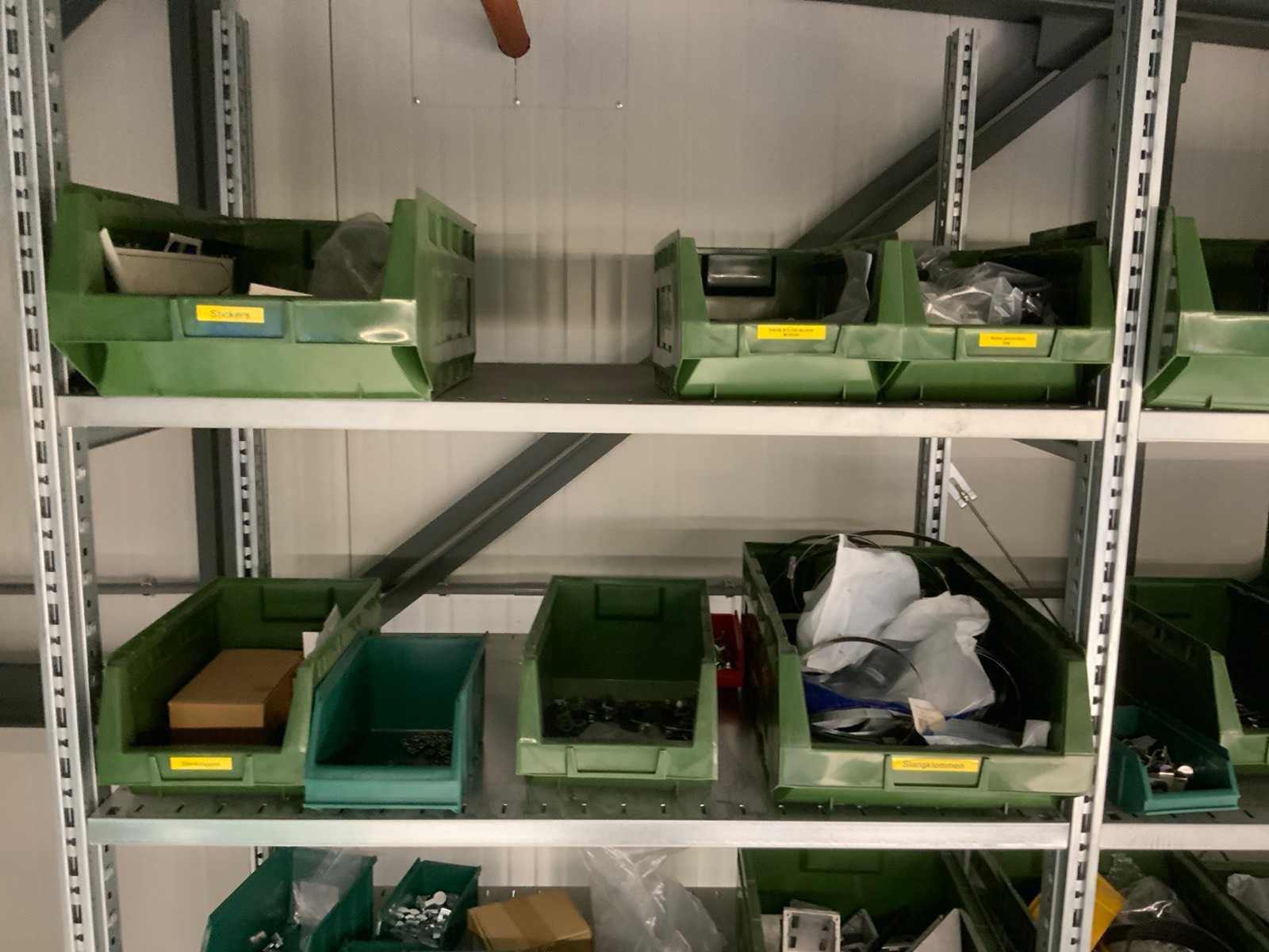 Inhoud installatiematerialen (ca. 500 sorteerbakken) van 9 legbordstellingen