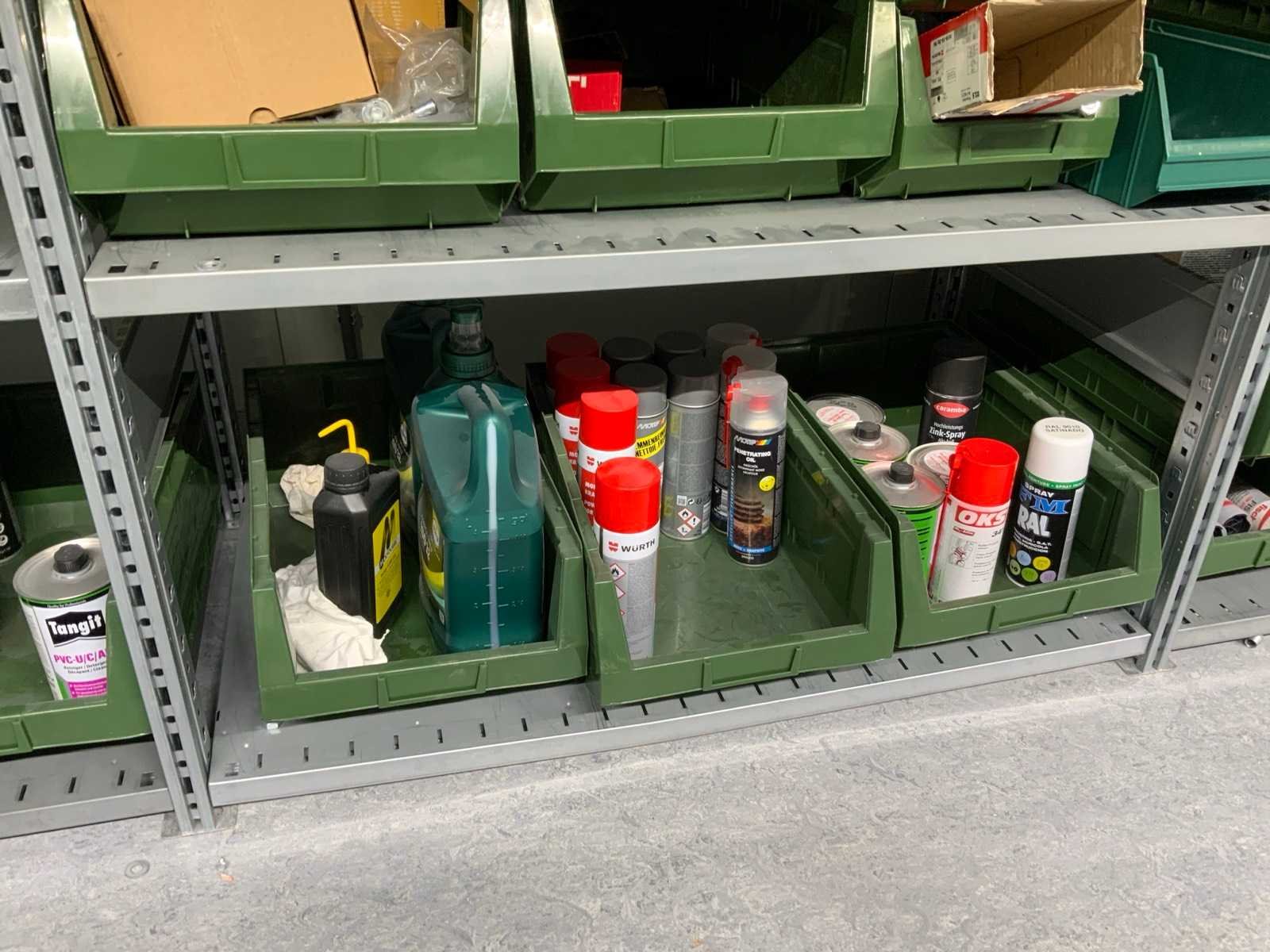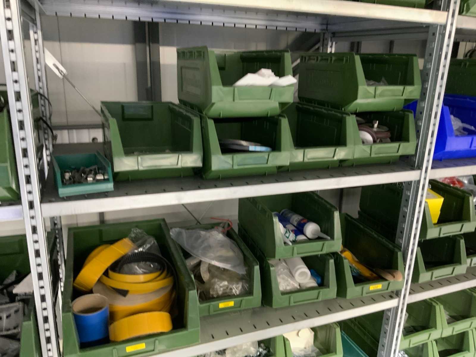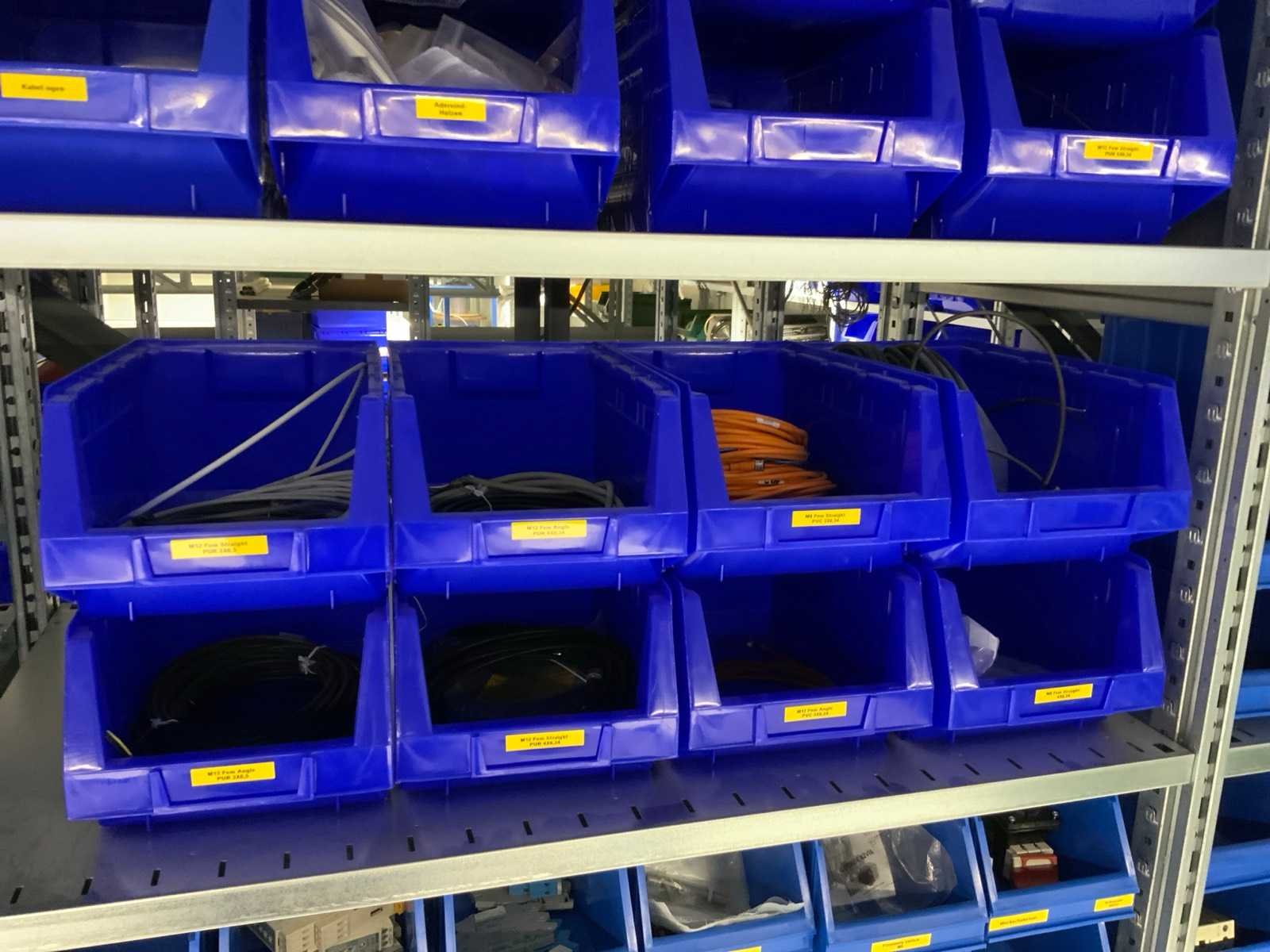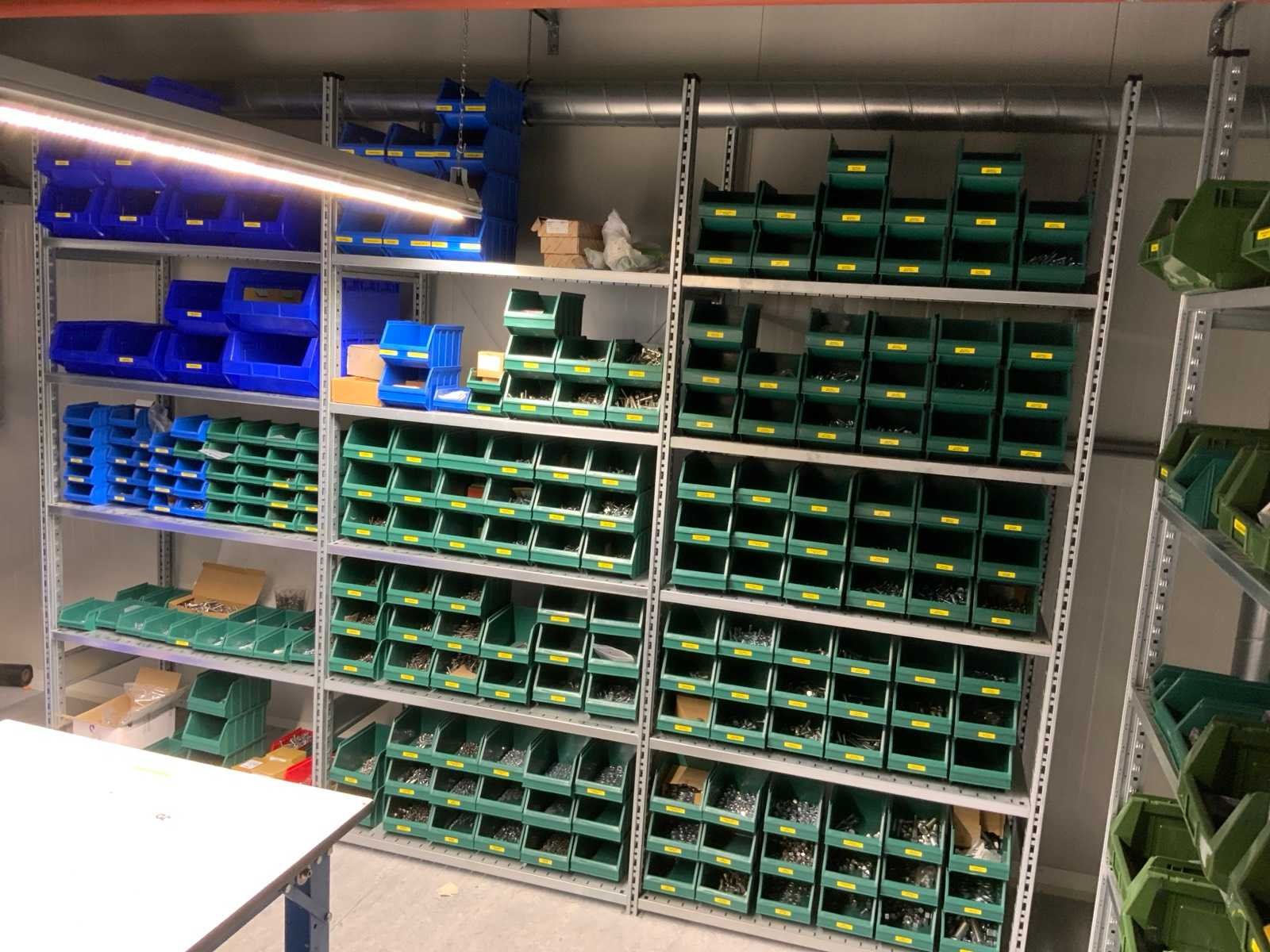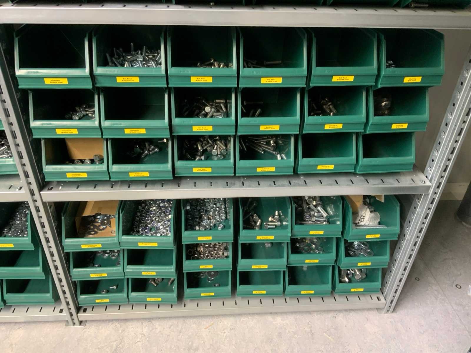 Inhoud installatiematerialen (ca. 500 sorteerbakken) van 9 legbordstellingen