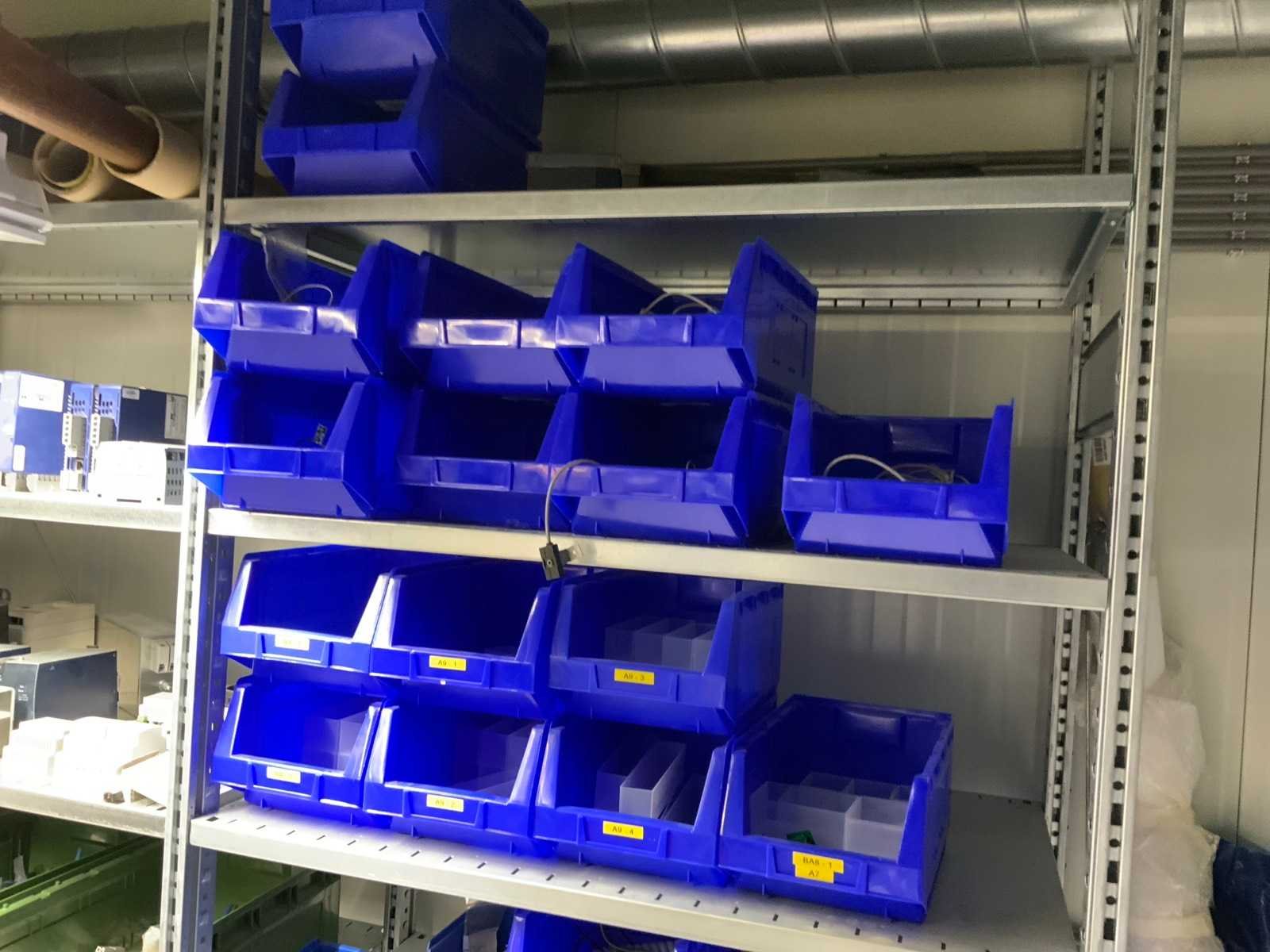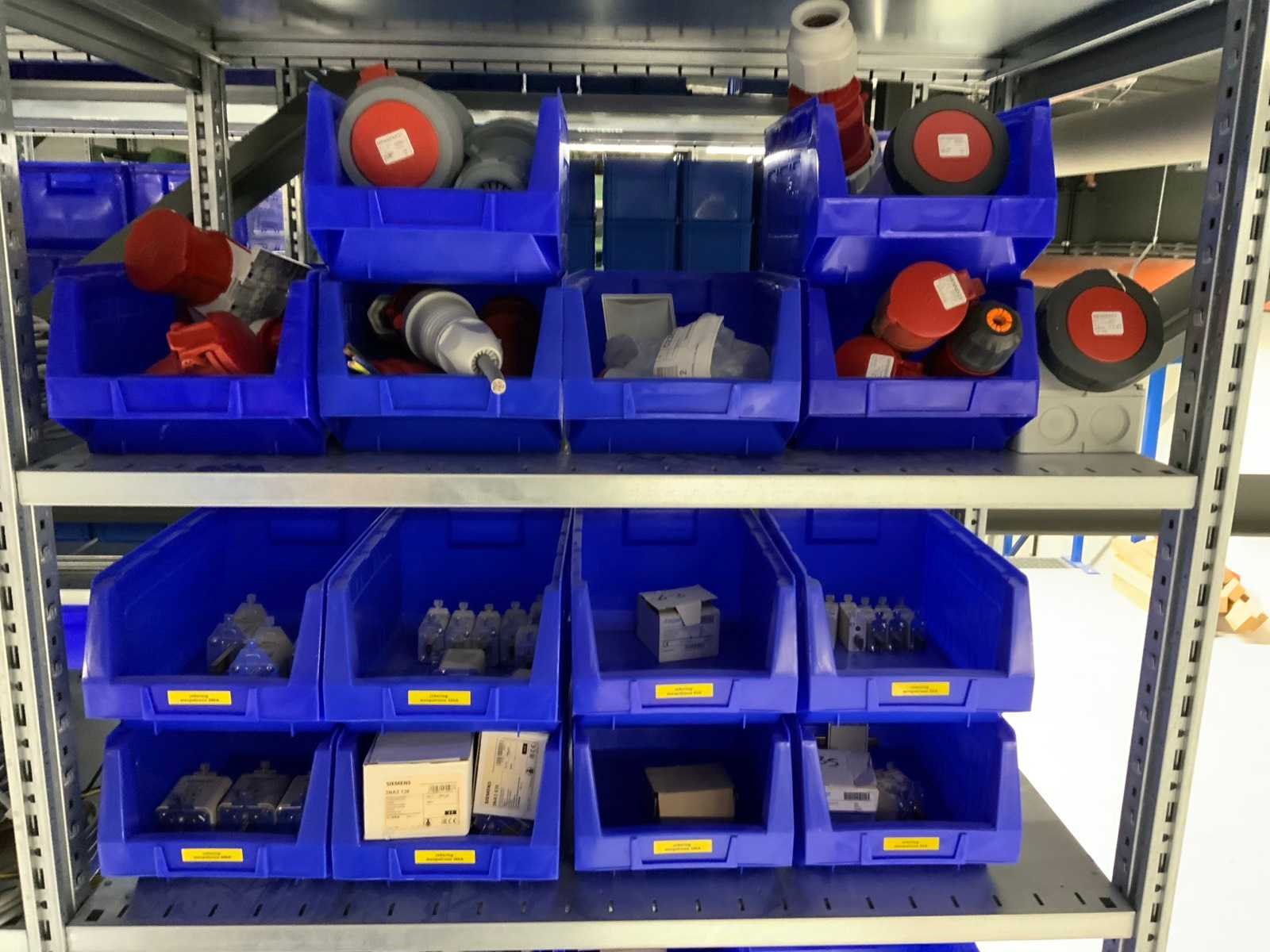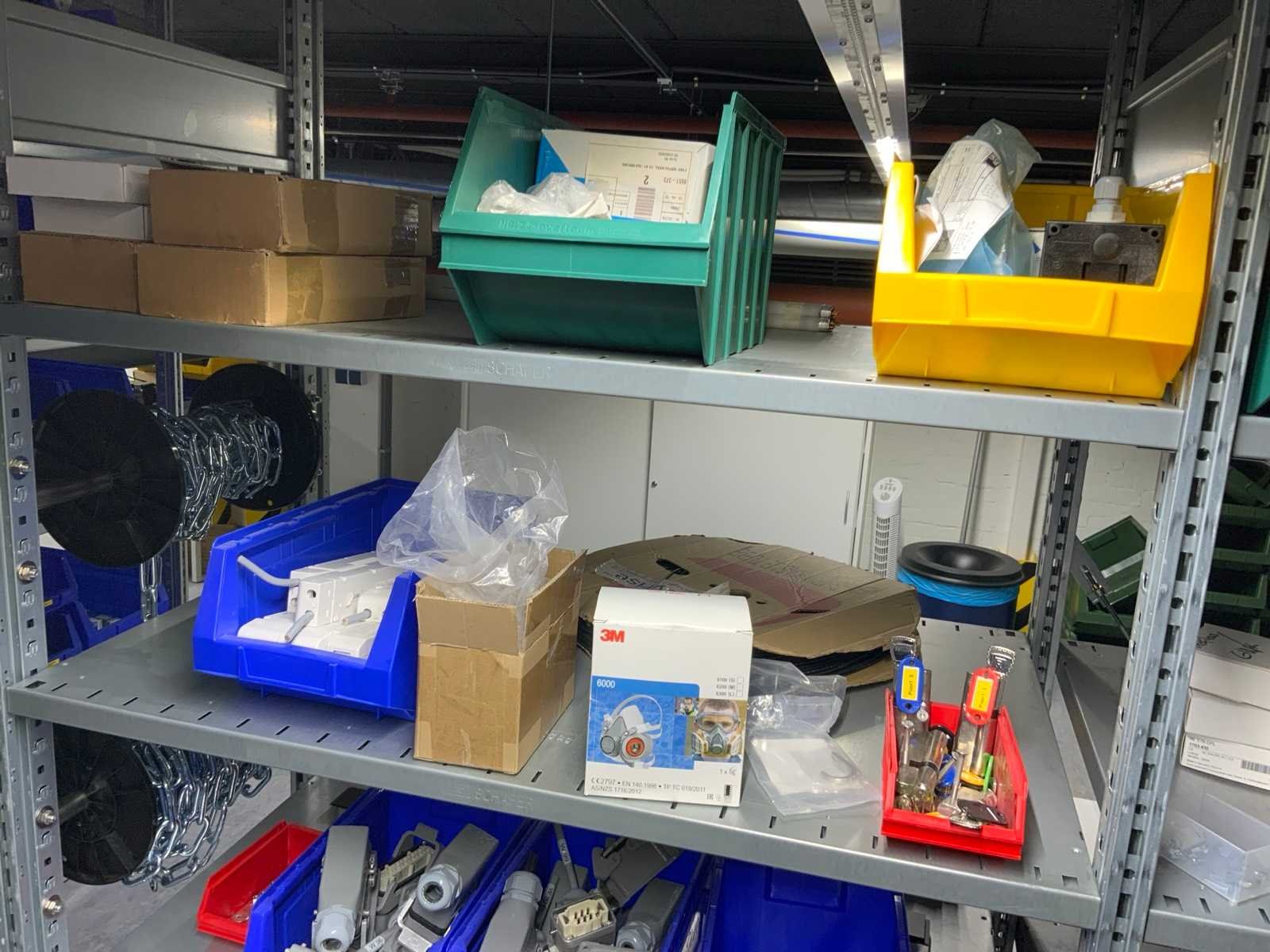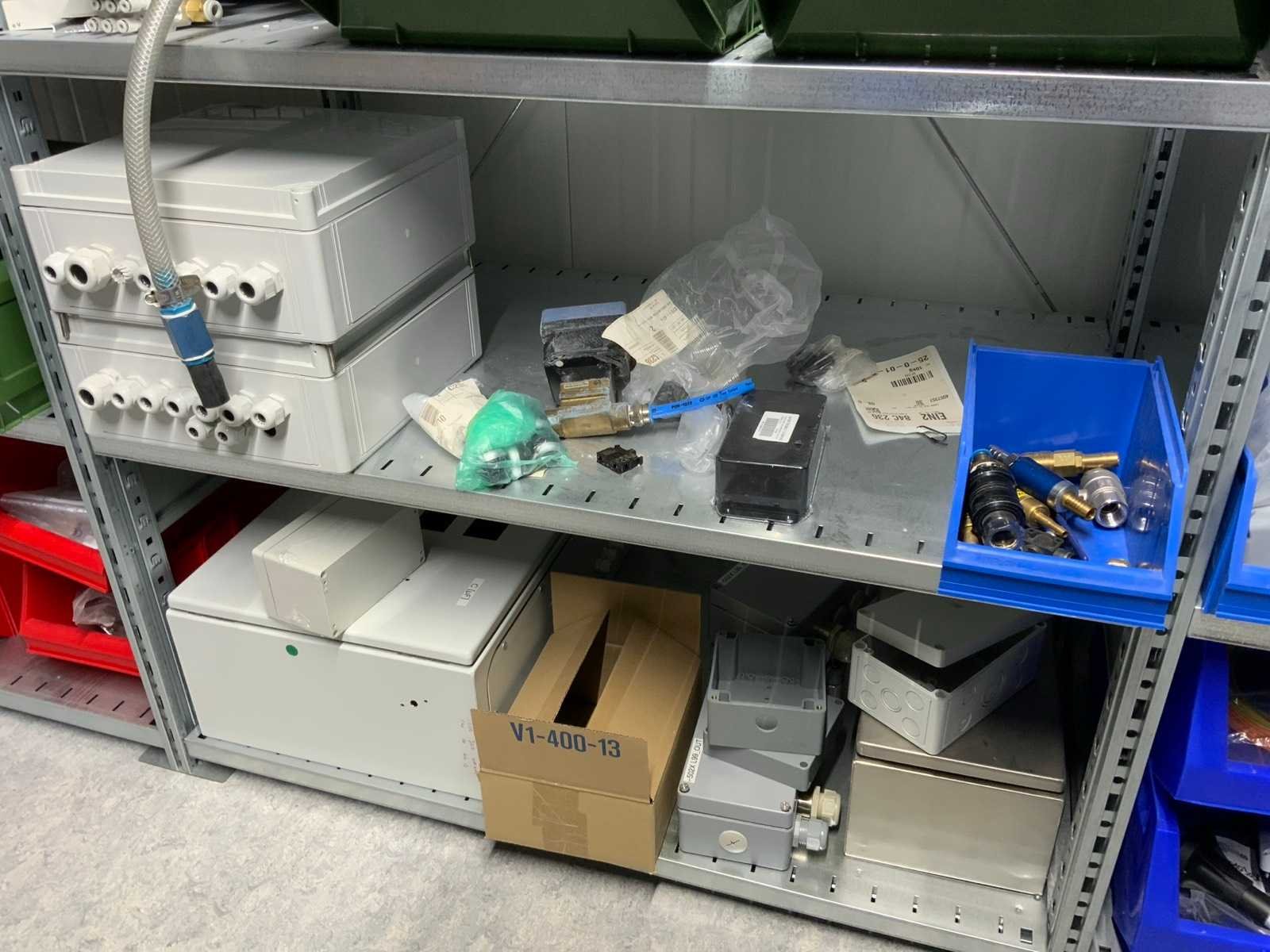 Inhoud (380v) installatiematerialen, machine-onderdelen, etc. van 9 legbordstellingen