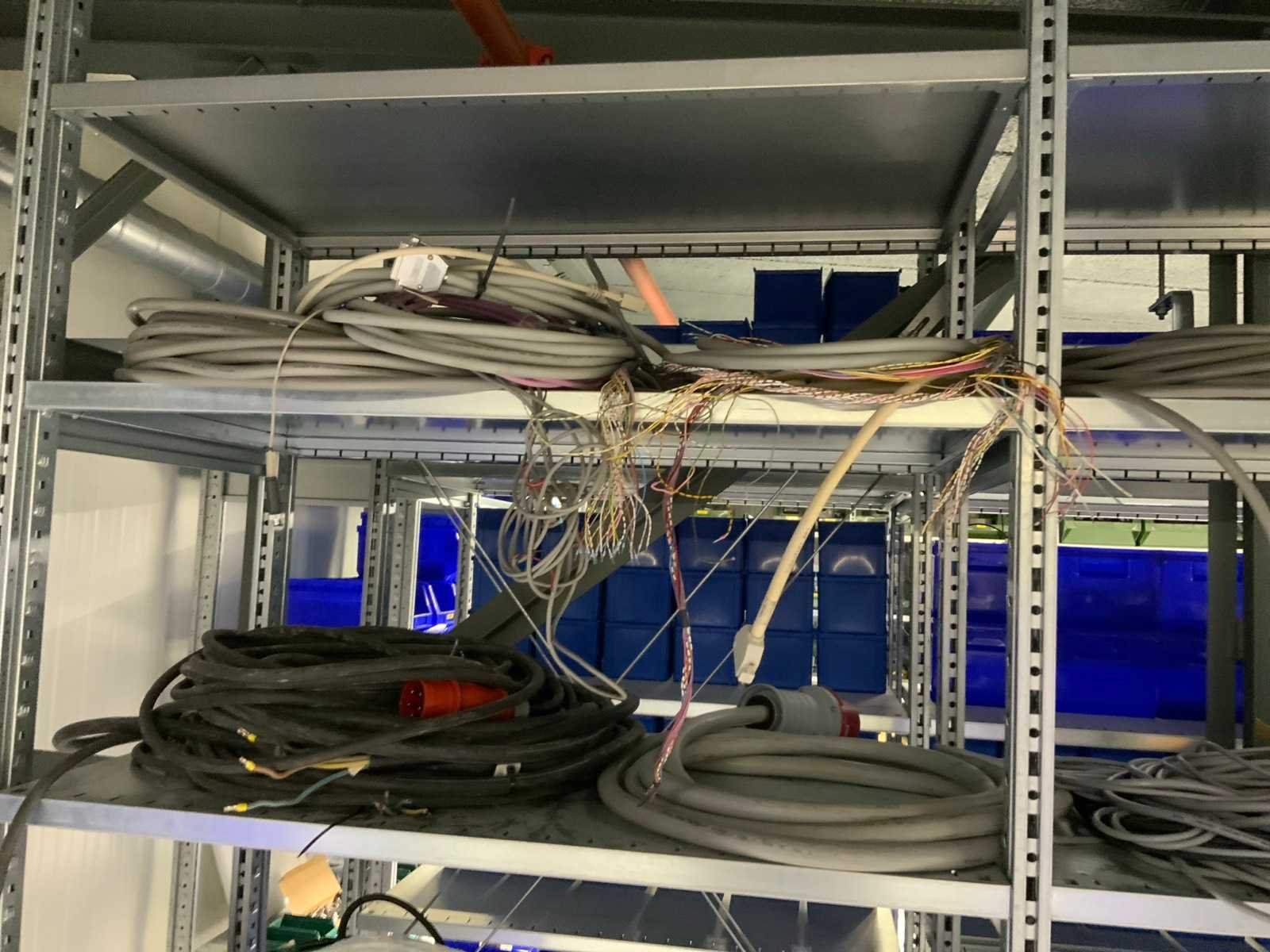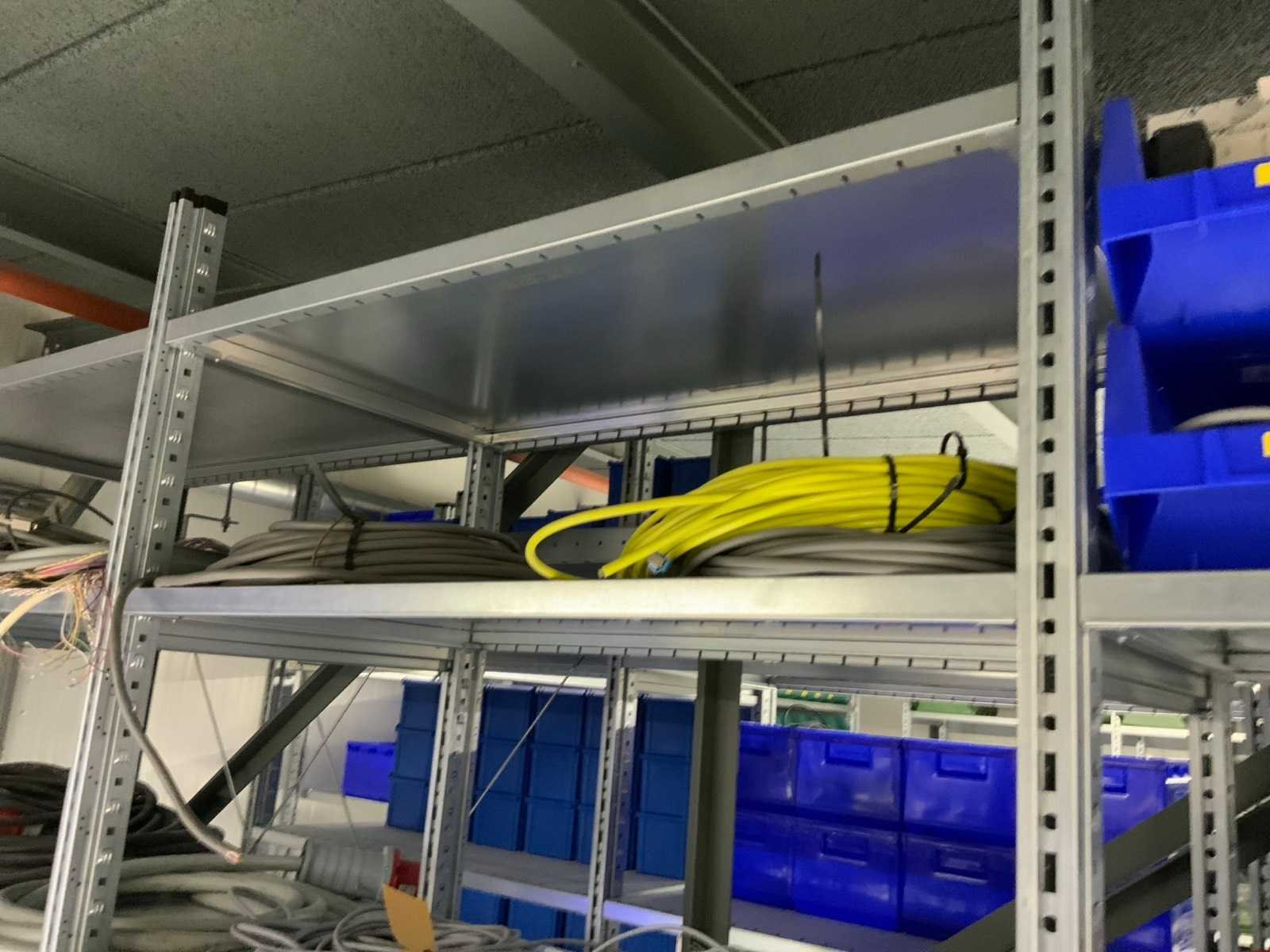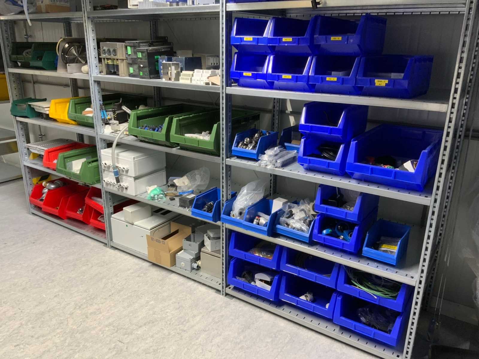 Inhoud (380v) installatiematerialen, machine-onderdelen, etc. van 9 legbordstellingen