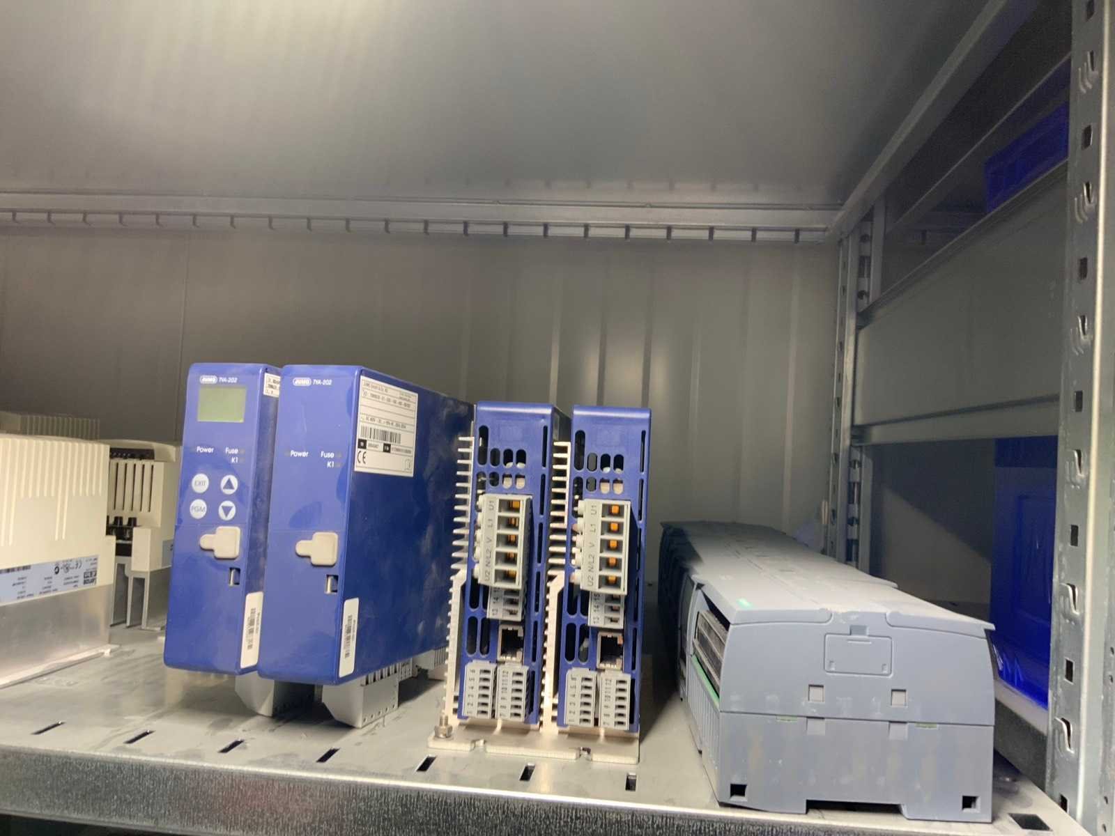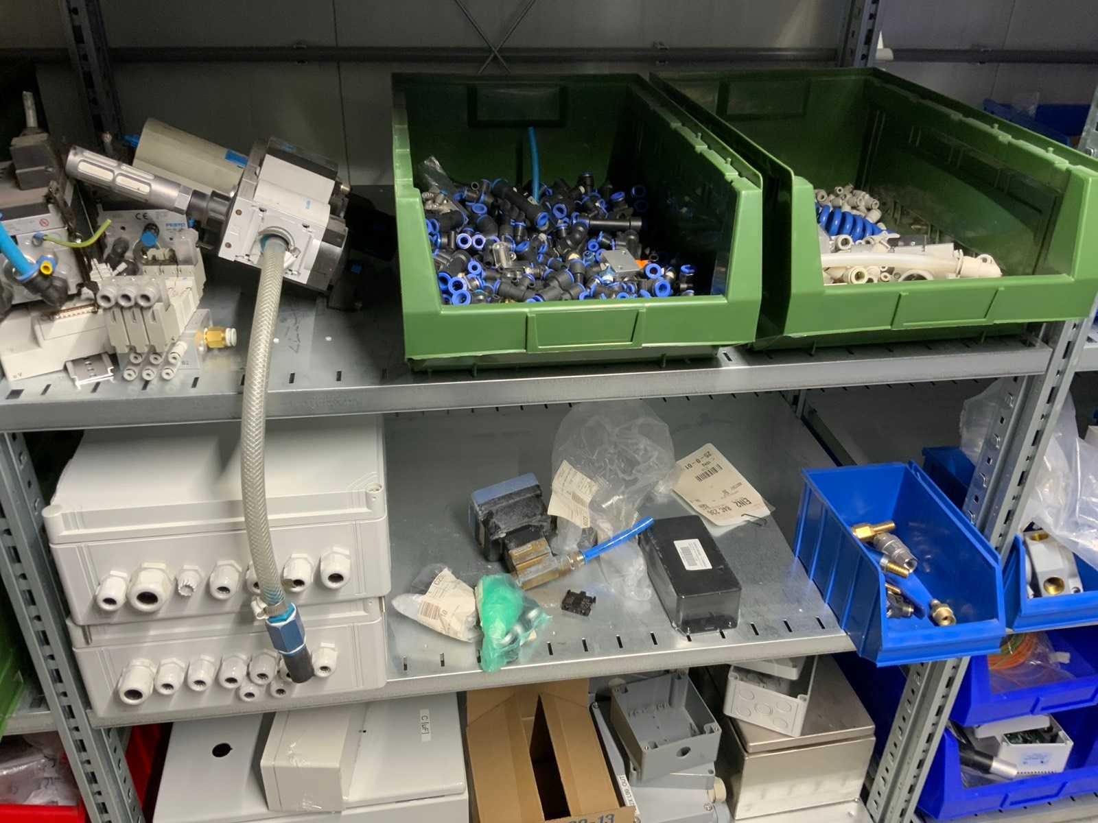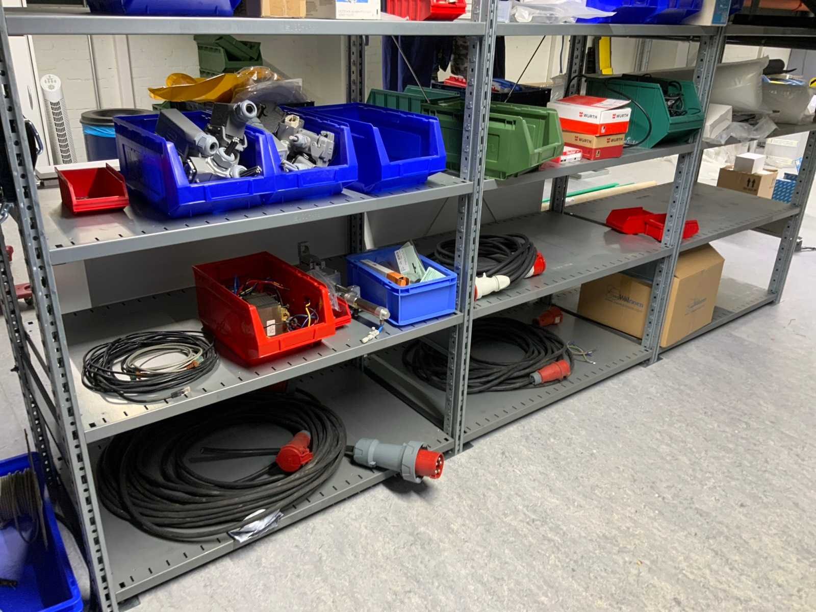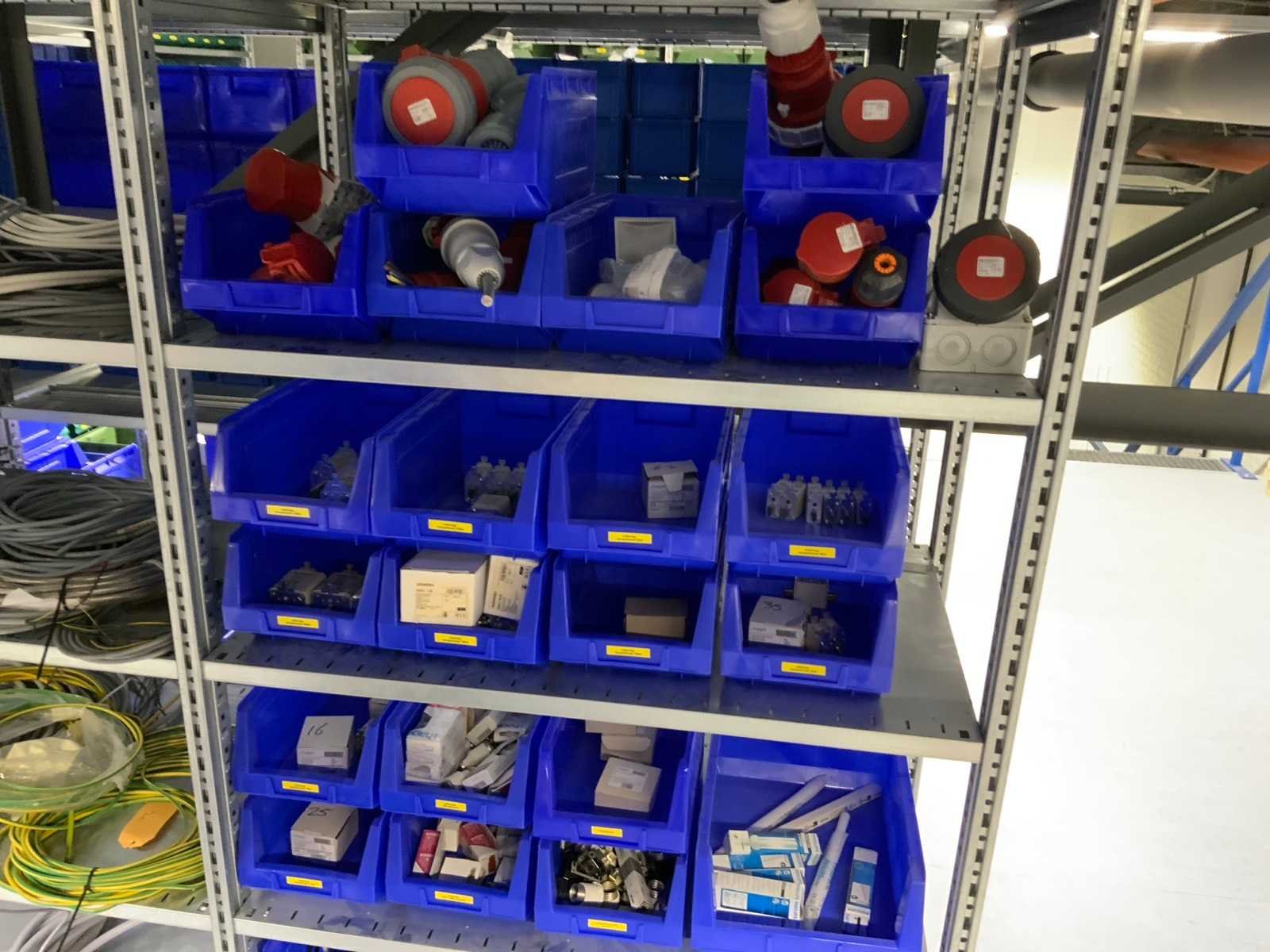 Inhoud (380v) installatiematerialen, machine-onderdelen, etc. van 9 legbordstellingen