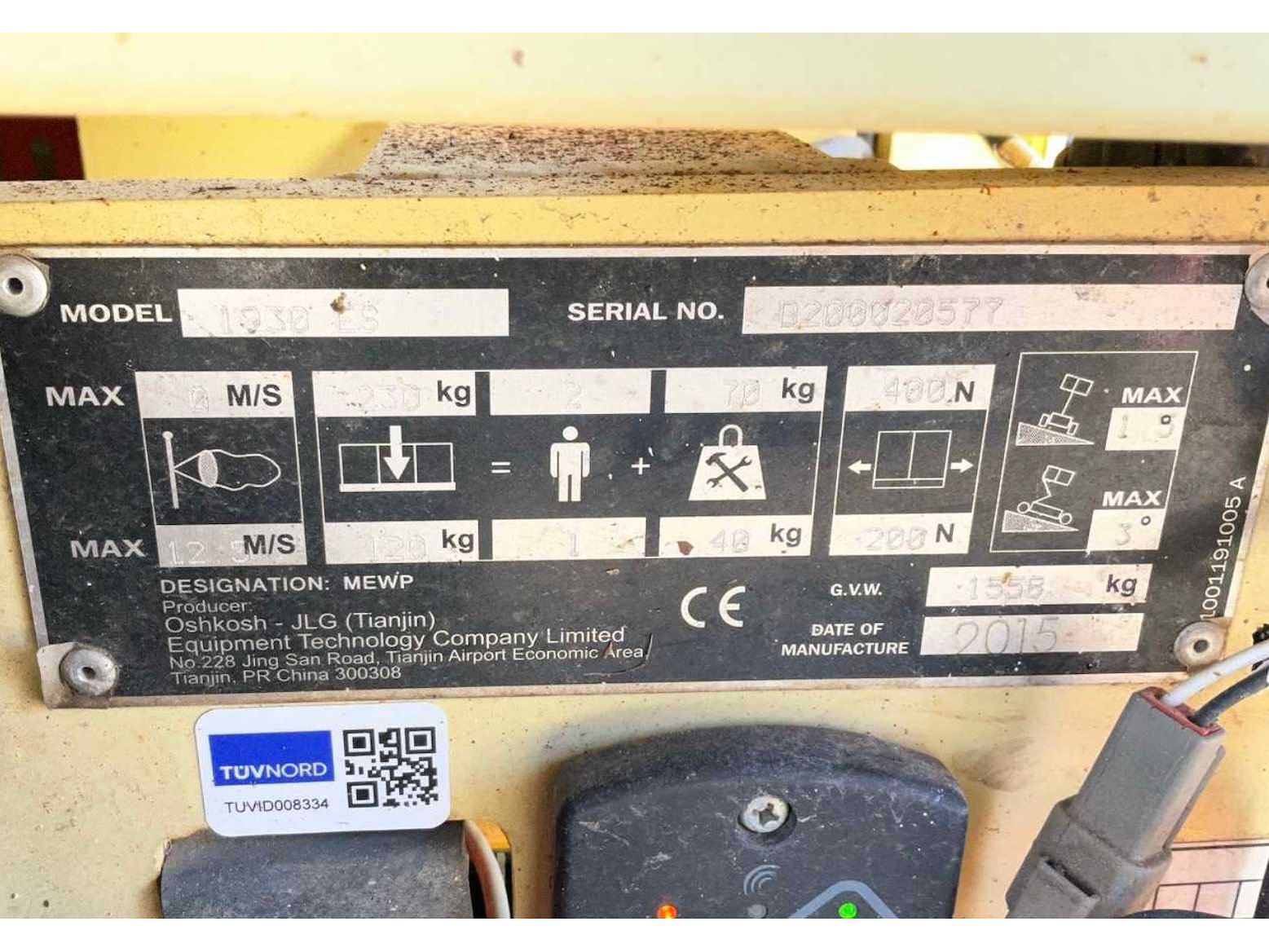 Gebruik: binnen en buiten; platform vloerhoogte 5700 mm; uitschuifbaar platform afmeting circa 2750x750 mm; interne acculader 230 Volt; kooibediening; transporthoogte circa 1750 mm; working condition Nee Merk: JLG Type: 1930ES Bouwjaar: 2015 Serienummer: B200020577 Elektrisch: true Schaarhoogwerker: true Werkhoogte: 7700mm Plateau afm. l: 1850mm Plateau afm. b: 750mm Platform capaciteit: 230kg Afgelezen urenstand: 491 Eigen gewicht: 1565kg Totale afmeting L: 1900mm Totale afmeting Breedte: 800mm Totale afmeting Hoogte: 2050mm
