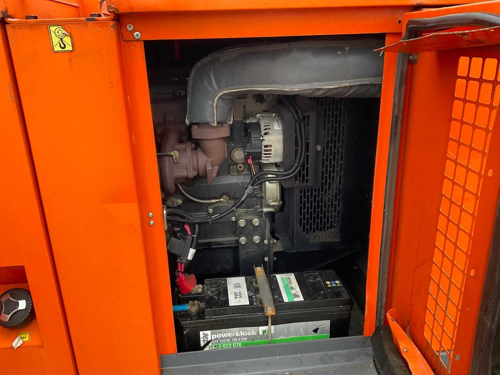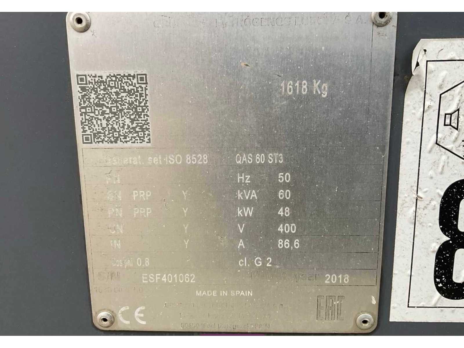Geluidgedempt; aansluiting: 1x 230 Volt - 16 Ampère; 1x 400 Volt - 16 Ampère; 1x 400 Volt - 32 Ampère; 1x 400 Volt - 63 Ampère; inhoud brandstoftank 298 liter; aansluiting externe brandstoftank; verbruik bij maximale belasting 14 liter / uur; heftruck vorksleuven; working condition; Nee Merk: Atlas Copco Type: QAS 60 ST3 Bouwjaar: 2018 Serienummer: ESF401062 Capaciteit.: 60kVA Motor merk: Perkins dieselmotor Motorcapaciteit: 48kW Generator merk: Leroy-Somer Generator type: TAL 042H Generator capaciteit: 90A Afgelezen urenstand: 5534 Machinegewicht: 1620kg Totale afmeting L: 2300mm Totale afmeting Breedte: 1050mm Totale afmeting Hoogte: 1600mm