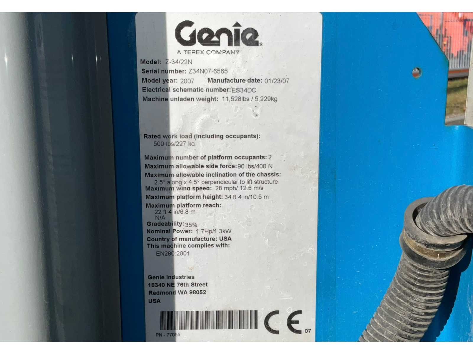 Platform vloerhoogte 10500 mm; ingebouwde acculader 230 Volt; kooibediening; non marking banden; working condition; Nee Merk: Genie Type: Z-34/22N Bouwjaar: 2007 Serienummer: Z34N07-6565 Elektrisch: true Telescoop hoogwerker: true Knikarm hoogwerker: true Werkhoogte: 12500mm Horizontale rijkwijdte: 6750mm Plateau afm. l: 1400mm Plateau afm. b: 750mm Platform capaciteit: 225kg Afgelezen urenstand: 1872 Eigen gewicht: 5250kg Totale afmeting L: 5750mm Totale afmeting Breedte: 1500mm Totale afmeting Hoogte: 1950mm