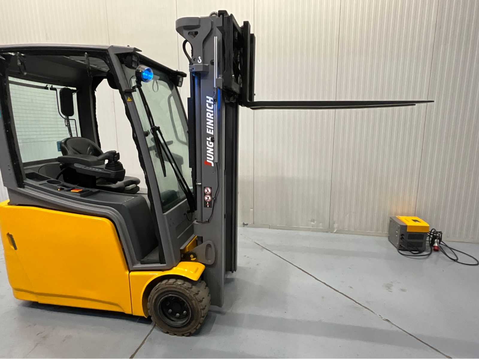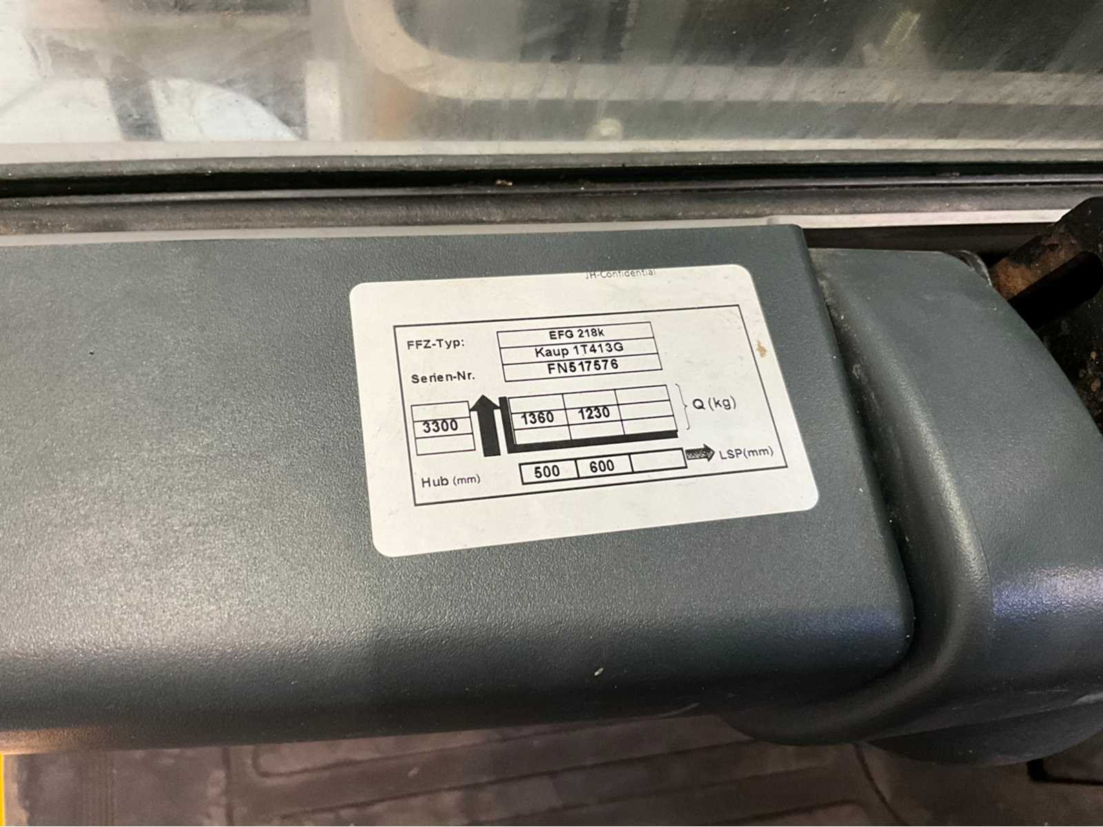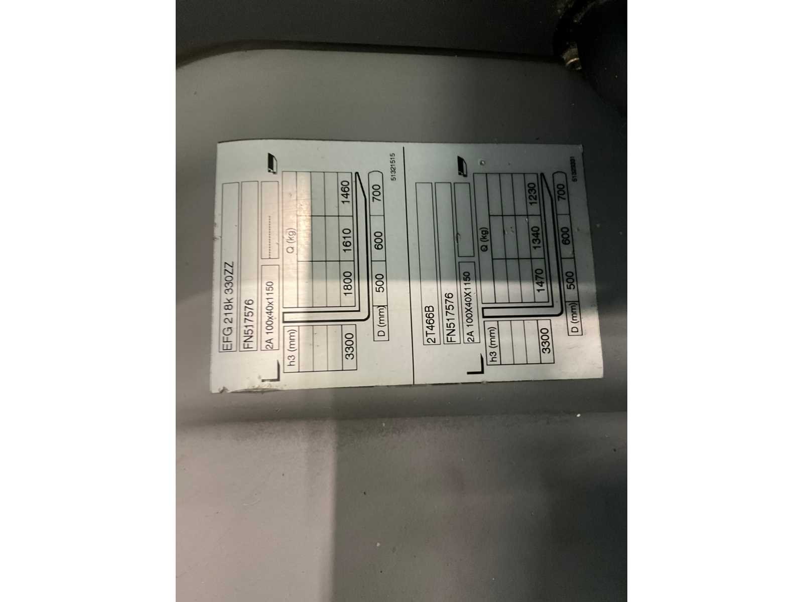 Stuuruitslagmeter - ruitenwissers voor en achter - 4e functie - bluespot voor - redspot achter Nee Merk: Jungheinrich Type: EFG218K Bouwjaar: 2016 Serienummer: FN517576 Brandstof: Elektrisch Soort band: Non marking banden Aantal wielen: 3 Afgelezen urenstand: 4017 Accu lader: true Free-lift: true Side-shift: true Duplex mast: true Eigen gewicht: 3504kg Hefvermogen: 1800kg Lepellengte: 1200mm Max. hefhoogte: 3300mm Hefhoogte: 3300mm Minimale doorrijhoogte: 2150mm Totale afmeting L: 3200mm Totale afmeting Breedte: 1120mm