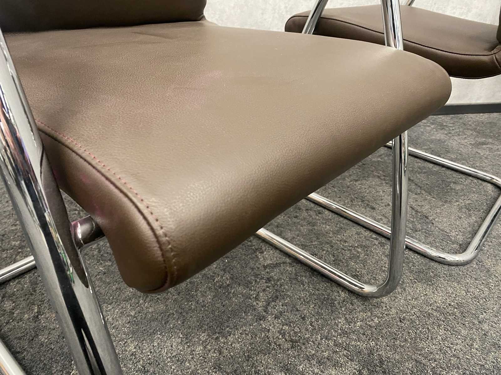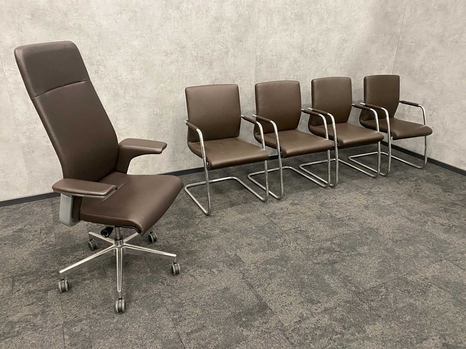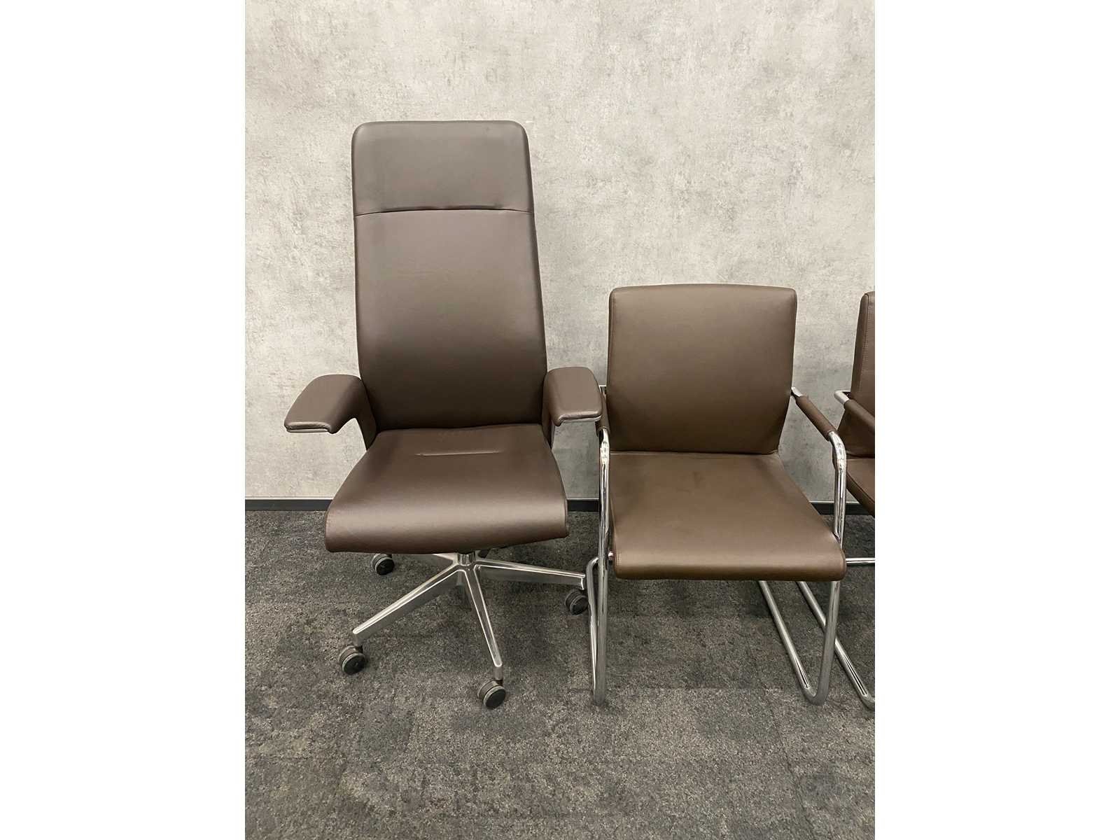 Kavel bestaande uit 4x Martin Stoll conferentiestoel v.v. bruin leder. -- 1x ASIS Match Executive bureaustoel v.v. armleggers, zitdiepte en zithoogte instelbaar, actief zitten. Nee Merk: ASIS Match Executive/ Martin Stoll Kleur: bruin, chroom