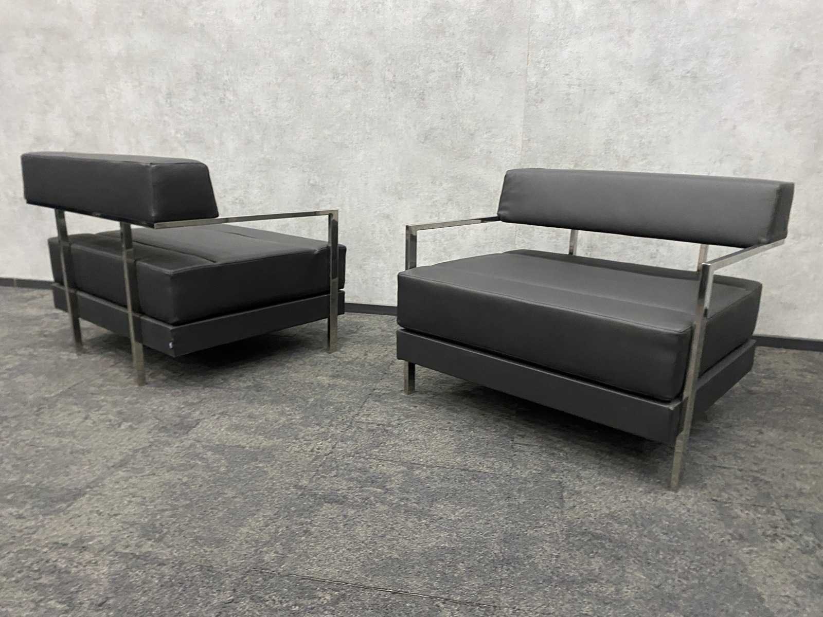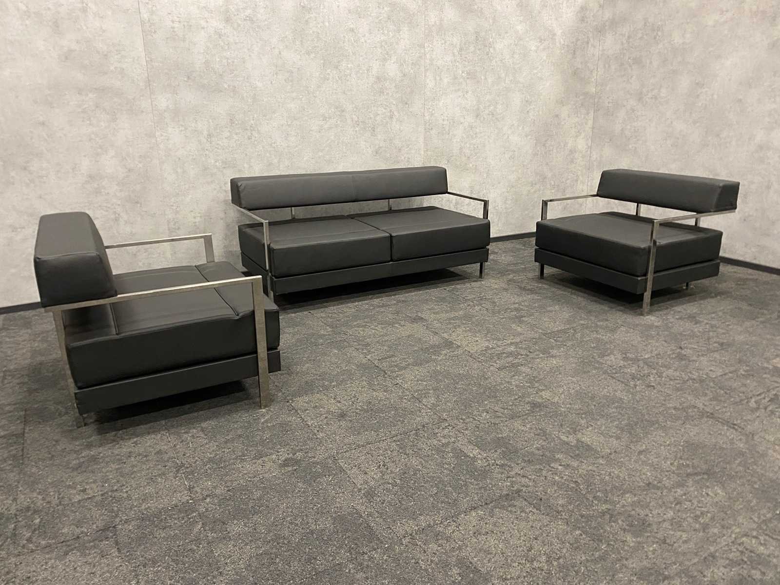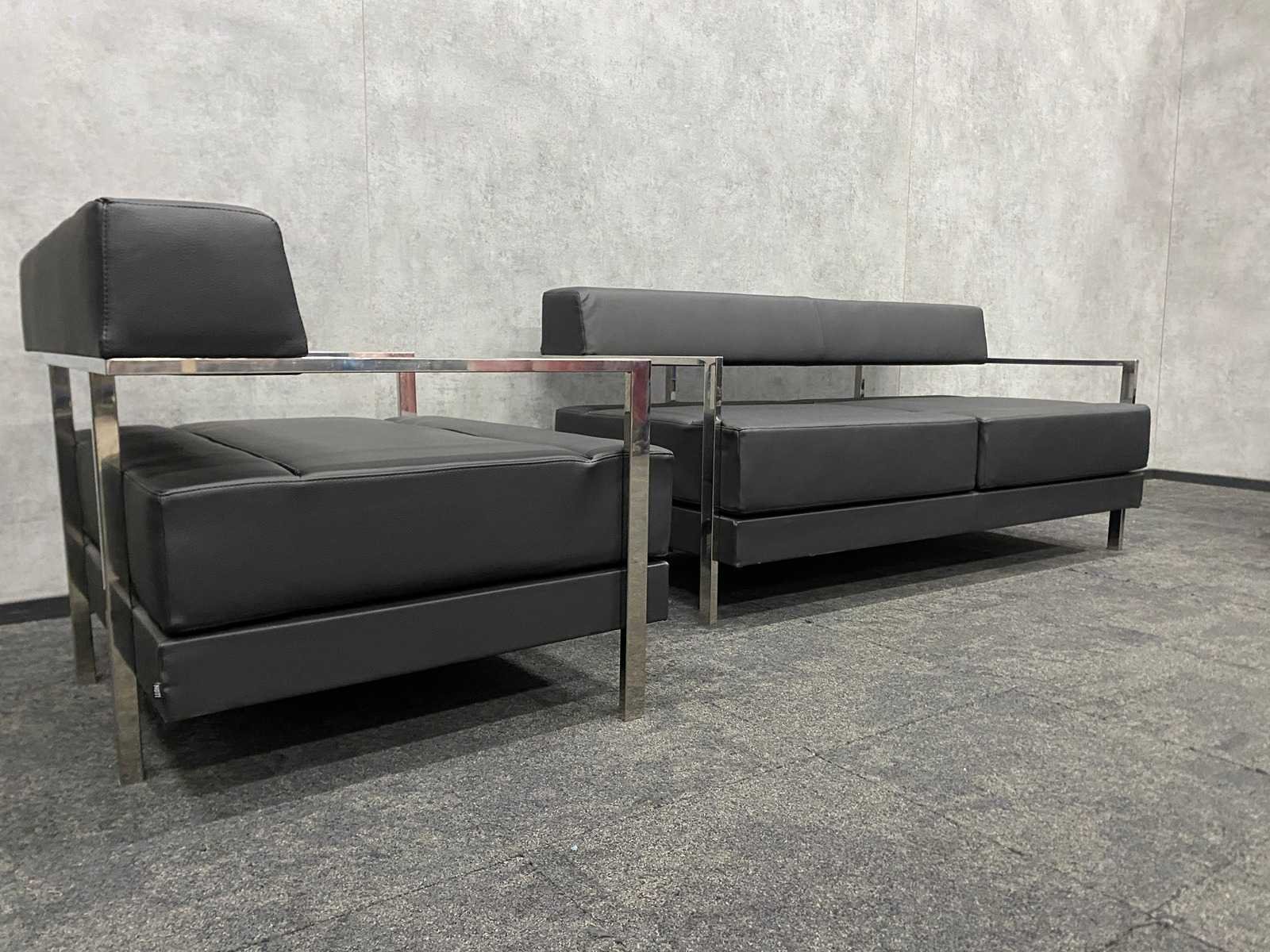 Afm. fauteuils ca. hxbxd 76x94x84 cm. zithoogte ca. 44 cm. ----- Afm. 2.5 zits sofa ca. hxbxd 76x164x84 cm. zithoogte ca. 44 cm. Nee Merk: Noti Ixo Kleur: chroom, zwart Materiaal: metaal, leder