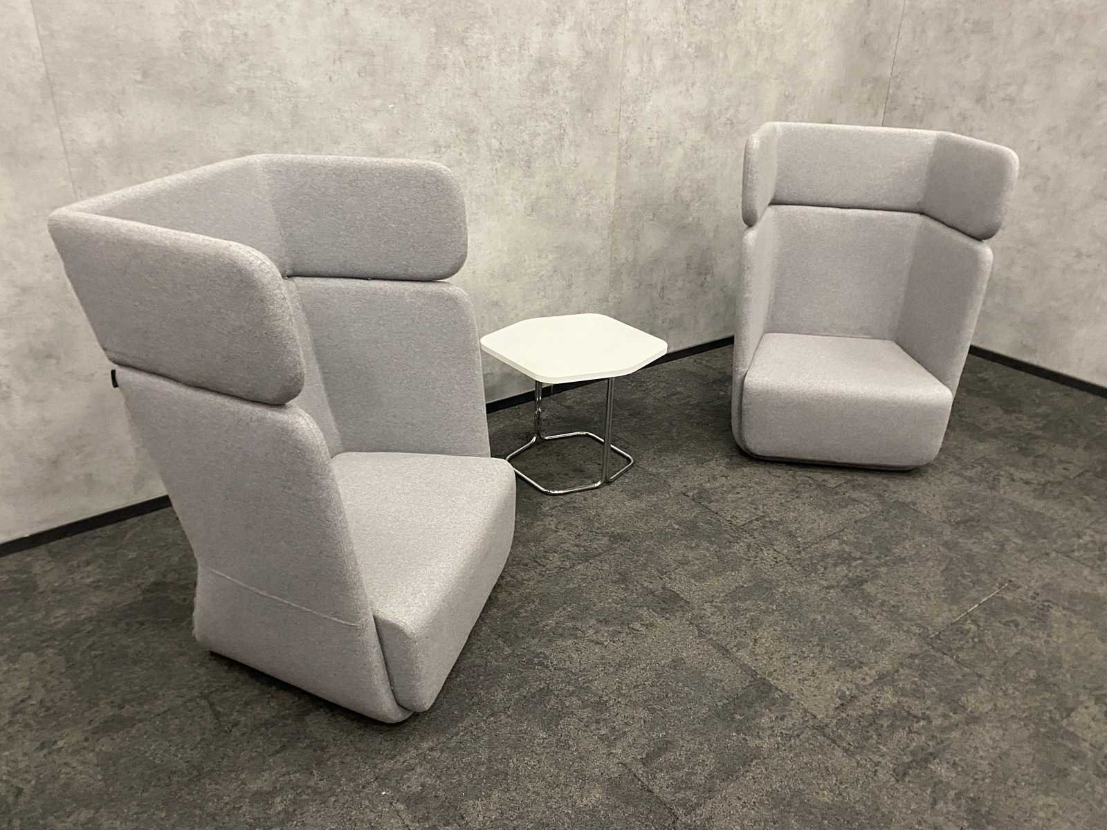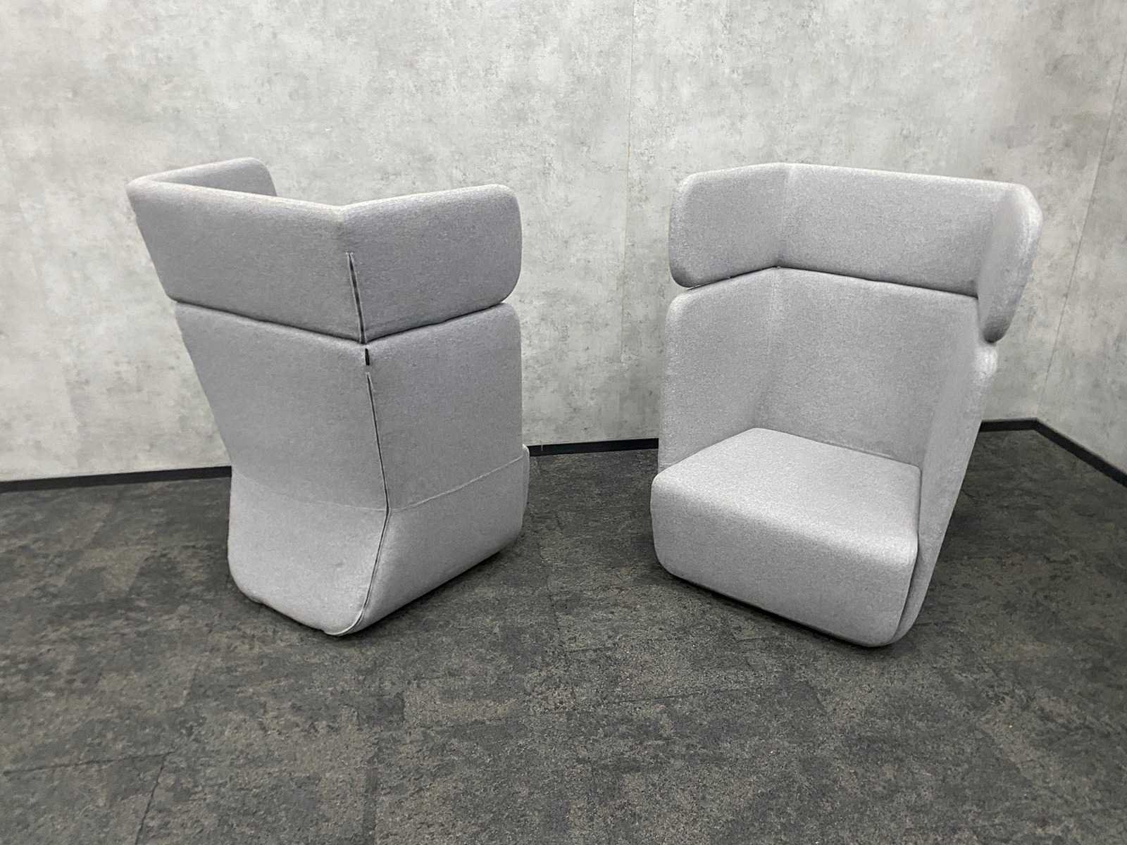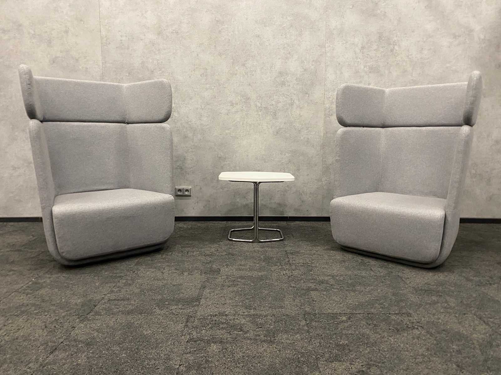 Afm. fauteuils ca. hxbxd 125x95x80 cm. zithoogte ca. 41 cm. ---- met salontafel Nee Merk: Softline Basket Kleur: grijs, wit, chroom
