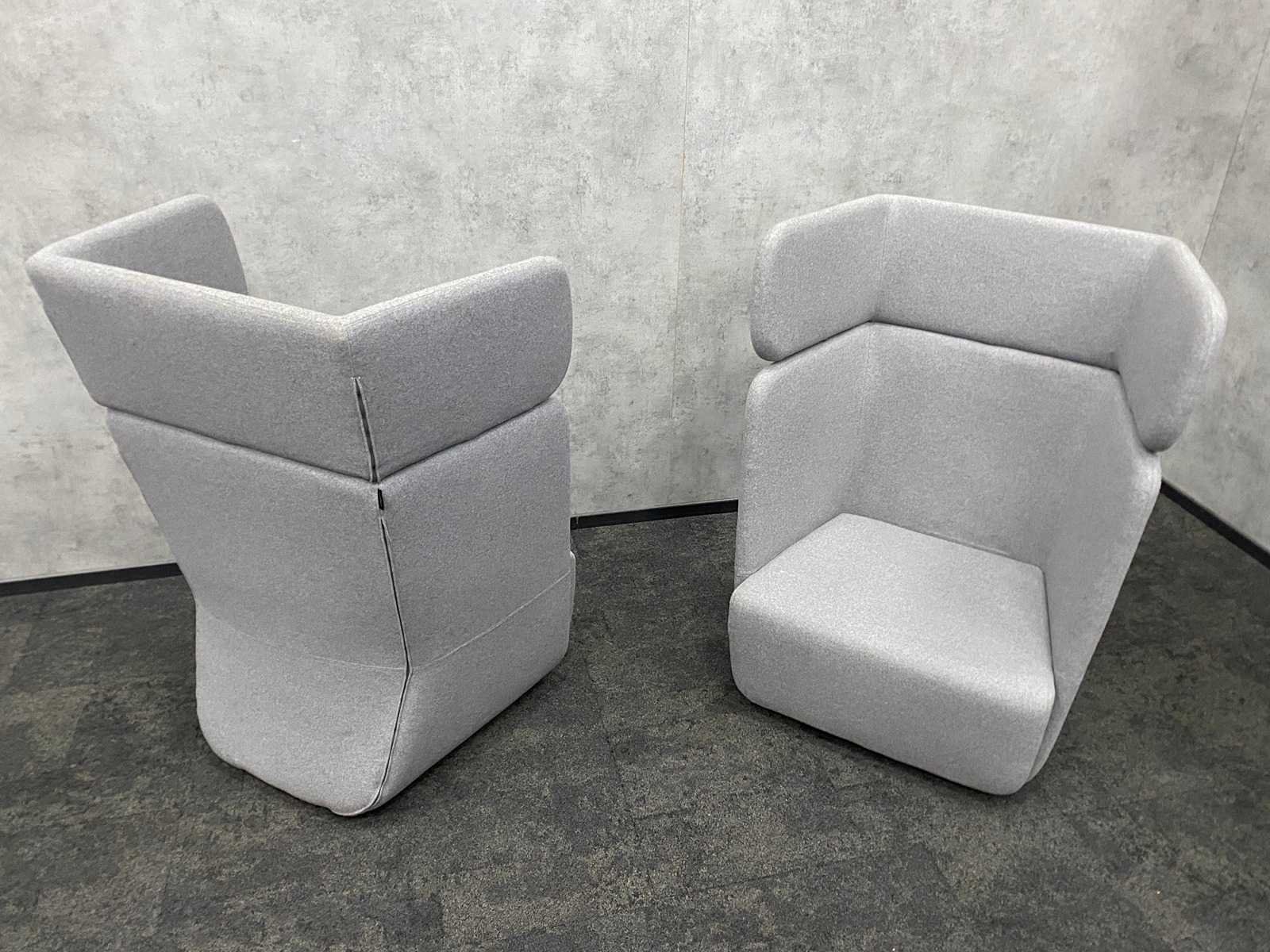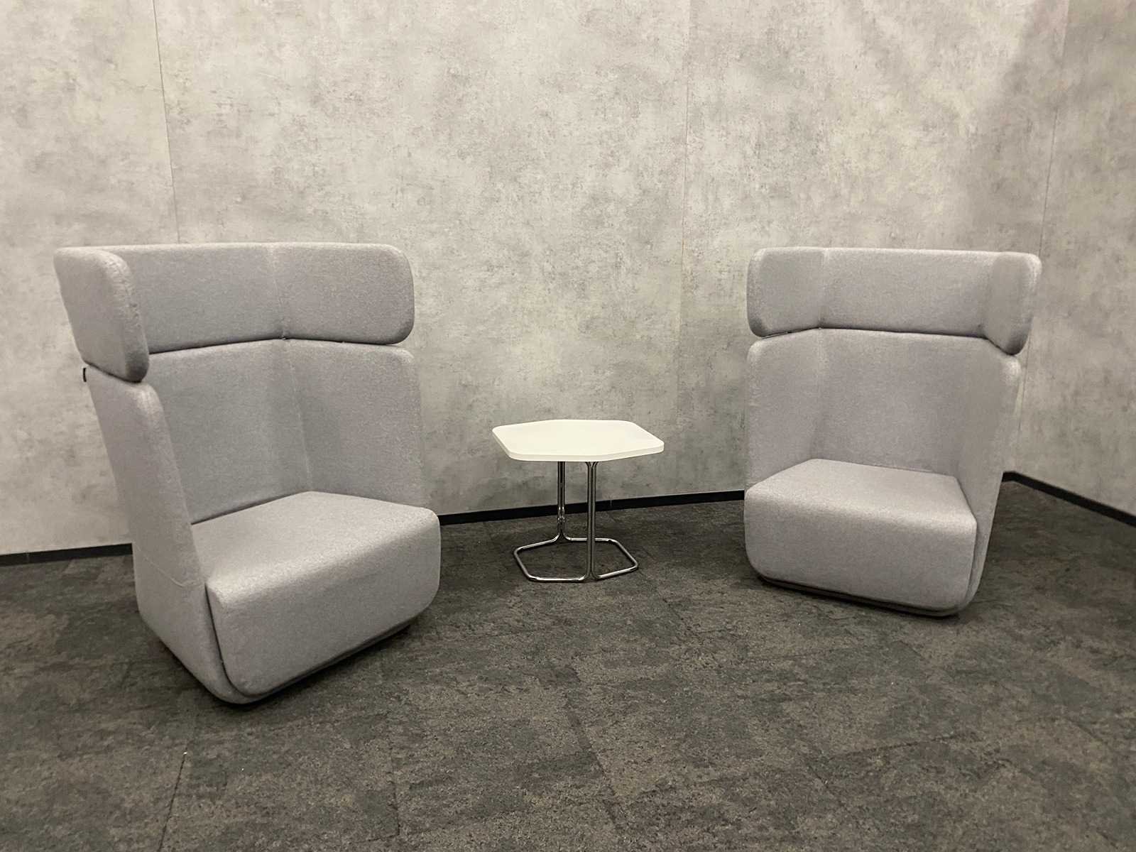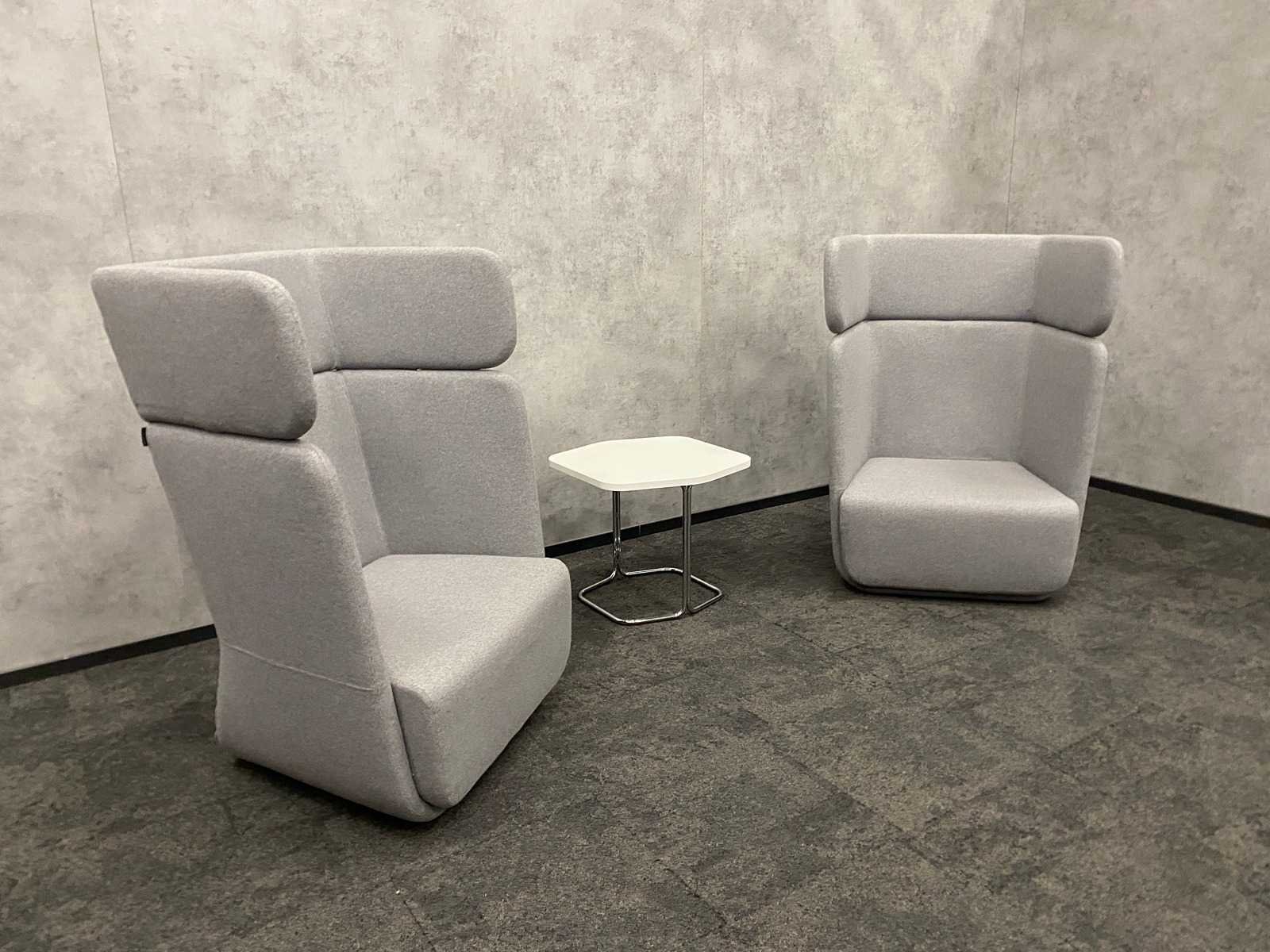 Afm. fauteuils ca. hxbxd 125x95x80 cm. zithoogte ca. 41 cm. ---- met salontafel Nee Merk: Softline Basket Kleur: grijs, wit, chroom