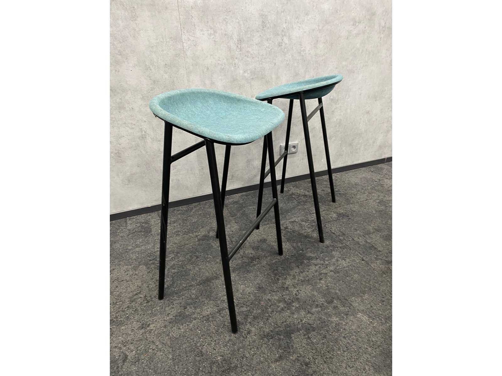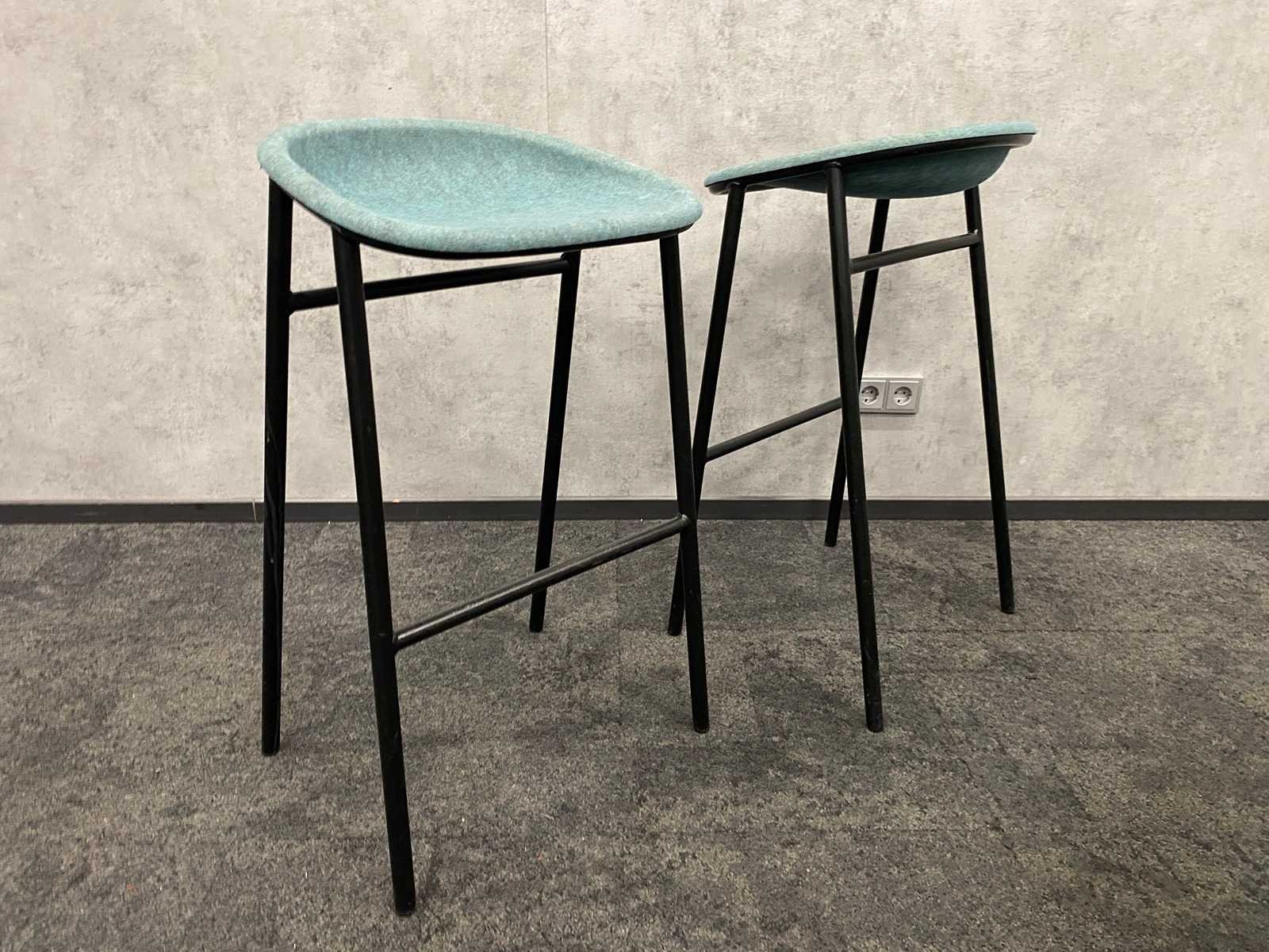 1x Montis Doble design tafel v.v. kabeldoorvoer en 4x De Vorm design barkruk Nee Merk: De Vorm/ Montis Kleur: turquoise, hout, zwart Lengte: 190cm Breedte: 75cm Hoogte: 110cm Zithoogte: 77cm