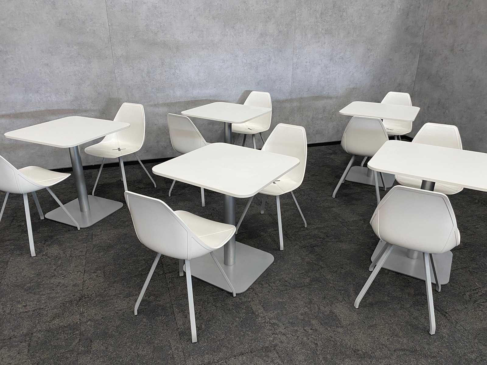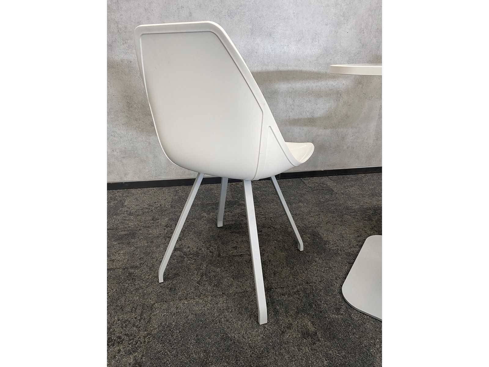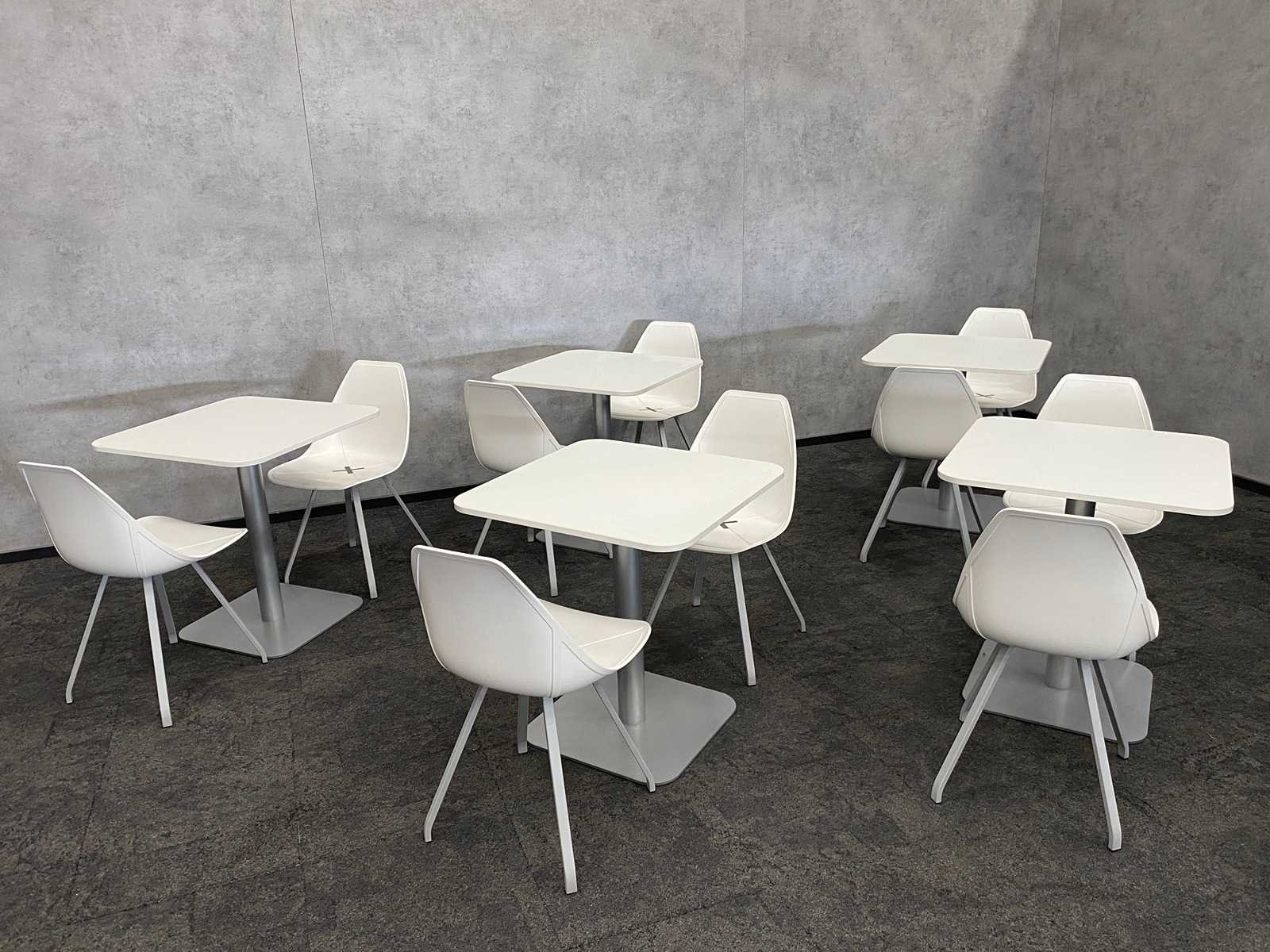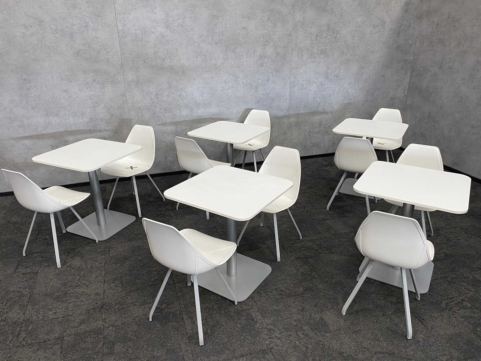Kavel bestaande uit 10x Alma Design kunststof kuip kantinestoel zithoogte ca. 46 cm. en 5x Gispen kantine tafel. Afm. ca. hxbxd 75x70x70 cm. Nee Merk: Gispen/ Alma design Kleur: wit, zilvergrijs