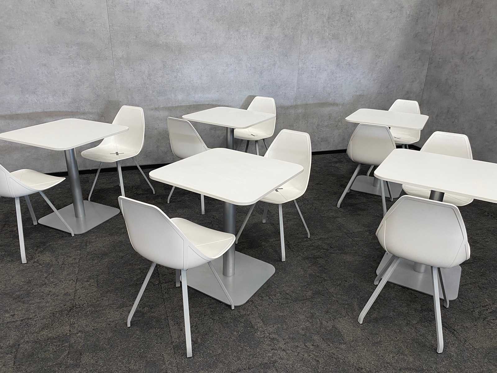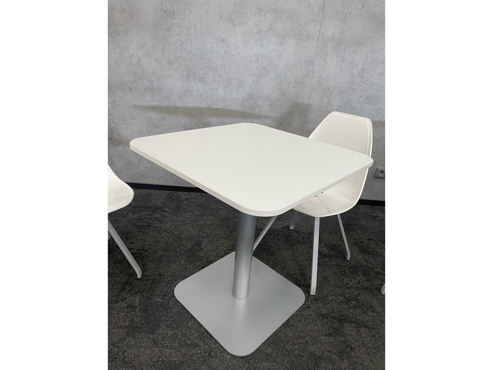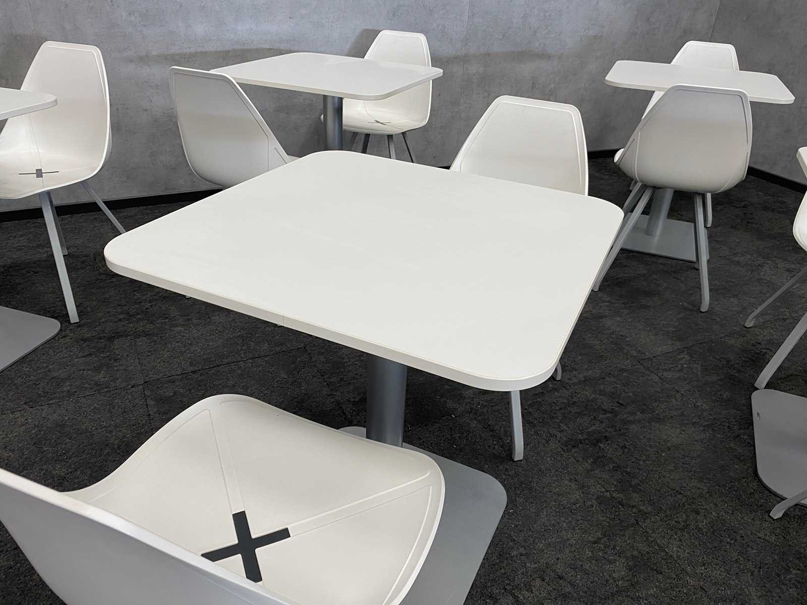 Kavel bestaande uit 10x Alma Design kunststof kuip kantinestoel zithoogte ca. 46 cm. en 5x Gispen kantine tafel. Afm. ca. hxbxd 75x70x70 cm. Nee Merk: Gispen/ Alma design Kleur: wit, zilvergrijs