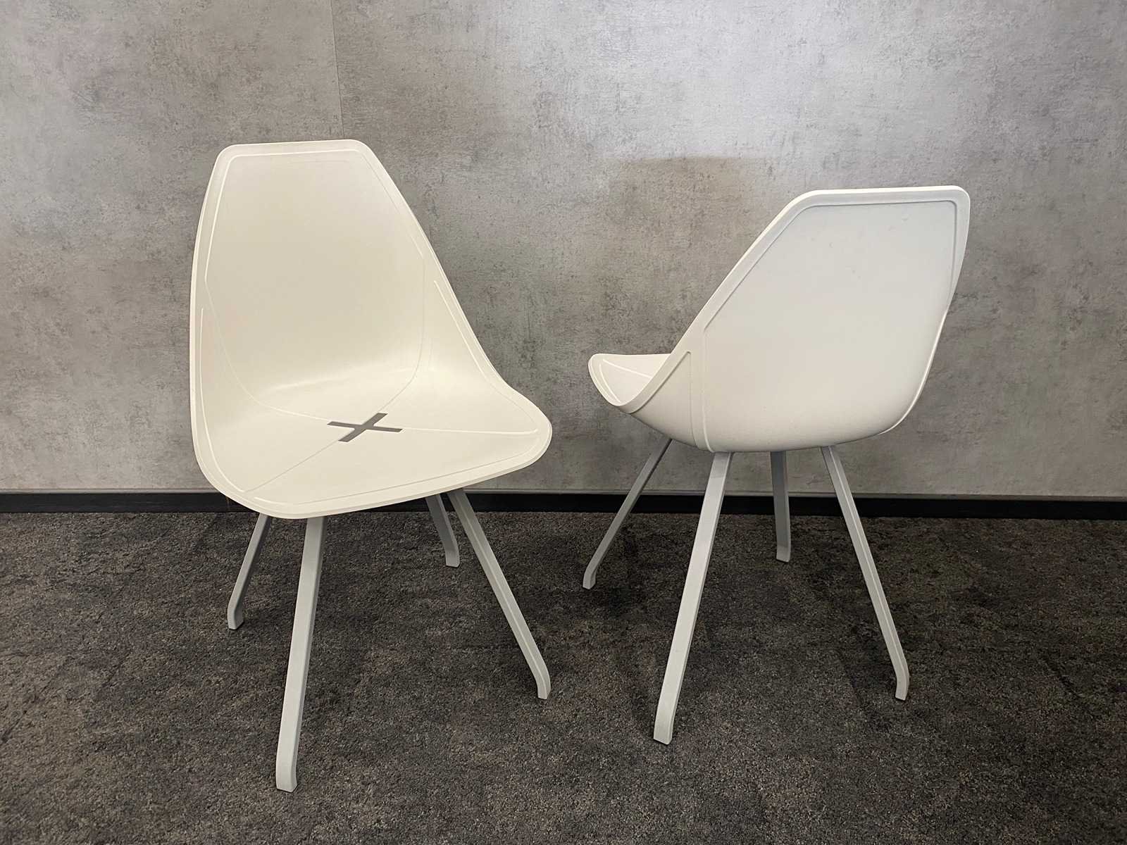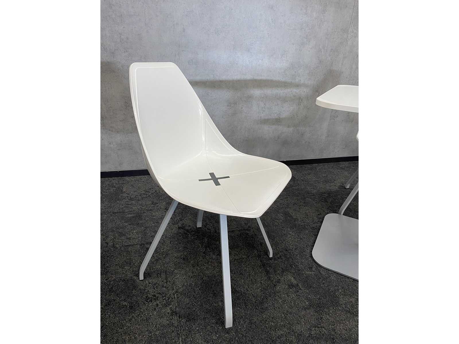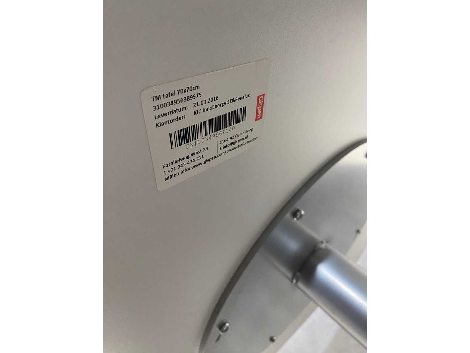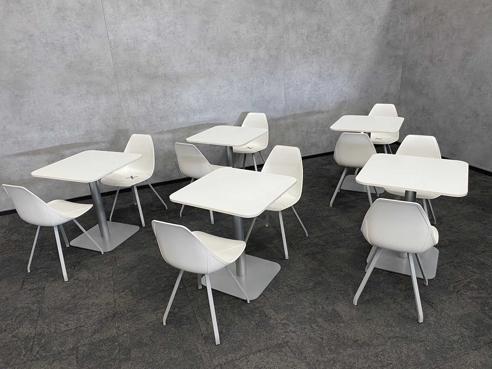 Kavel bestaande uit 10x Alma Design kunststof kuip kantinestoel zithoogte ca. 46 cm. en 5x Gispen kantine tafel. Afm. ca. hxbxd 75x70x70 cm. Nee Merk: Gispen/ Alma design Kleur: wit, zilvergrijs