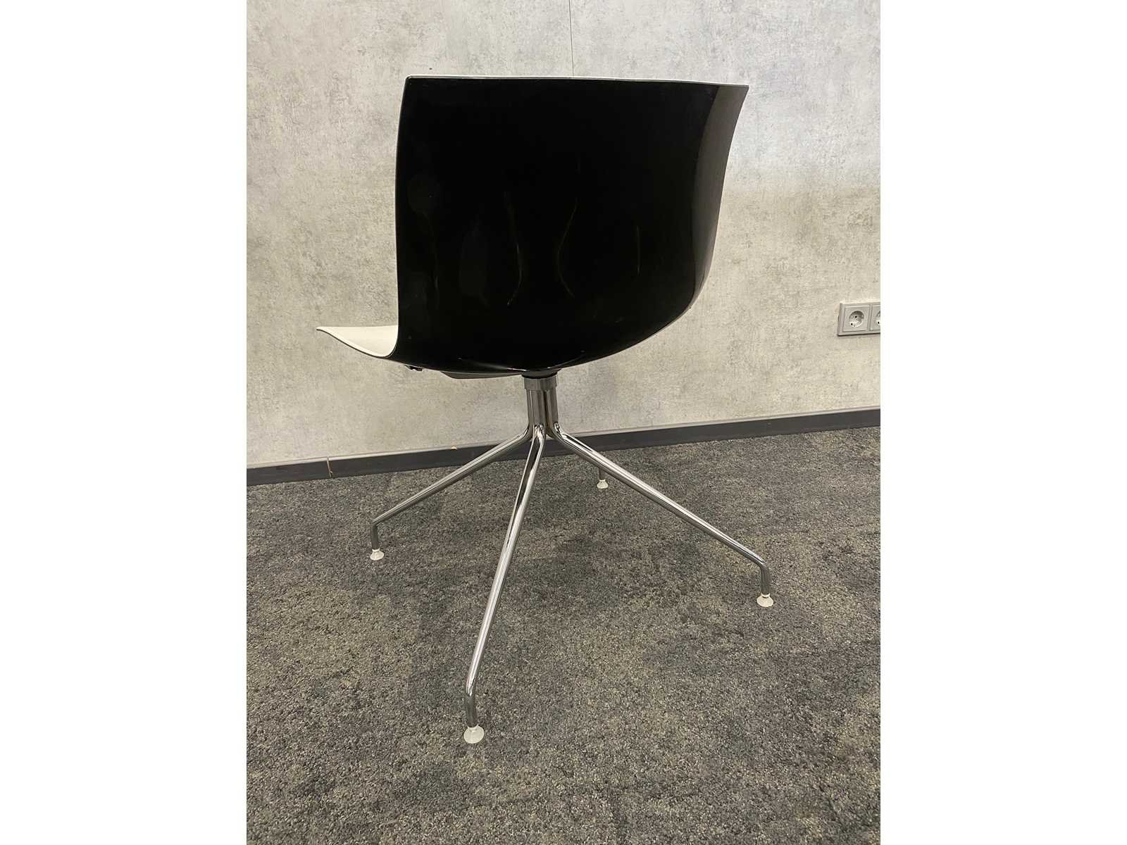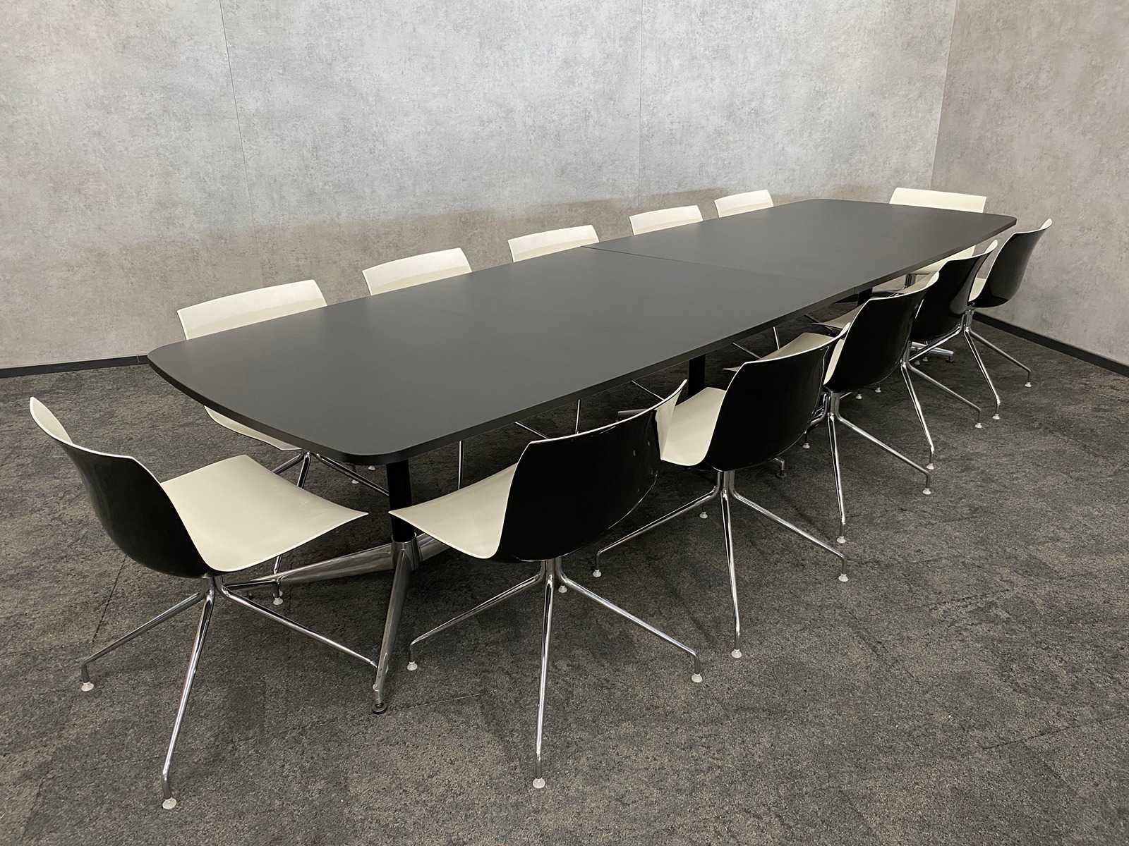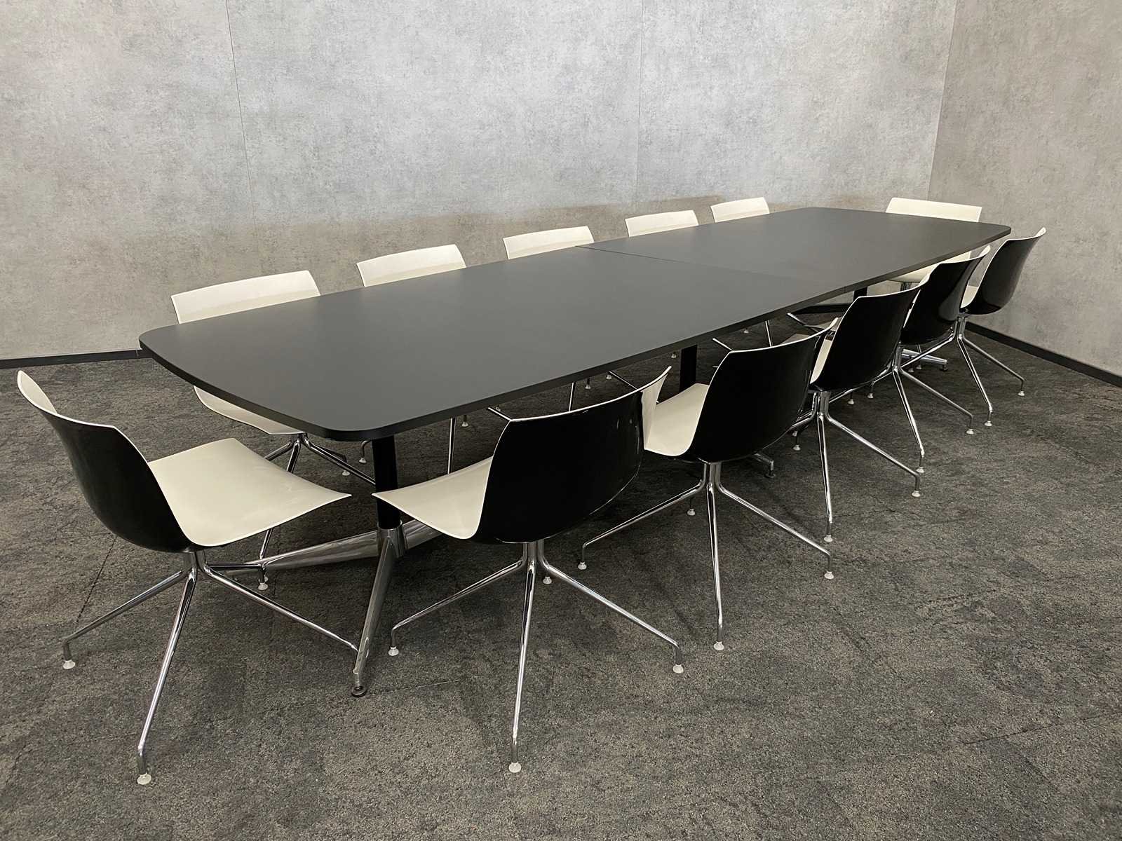 Kavel bestaande uit 12x Arper Catifa design stoel v.v. draaibaar frame -- 1x nieuwe vergadertafel v.v. nieuw chroom/zwart stalen frame en 2-delig zwart melamine tafelblad. Tafel is reeds gedemonteerd/ nieuw in doos (LET OP tafelbladen zijn los en onverpakt) Nee Merk: Arper Catifa Kleur: zwart, chroom, wit Lengte: 370cm Breedte: 120cm Hoogte: 74cm