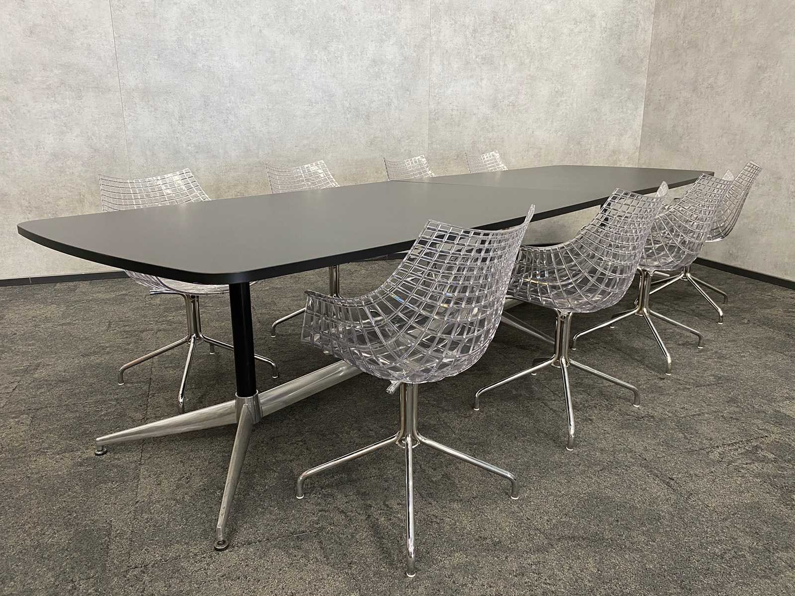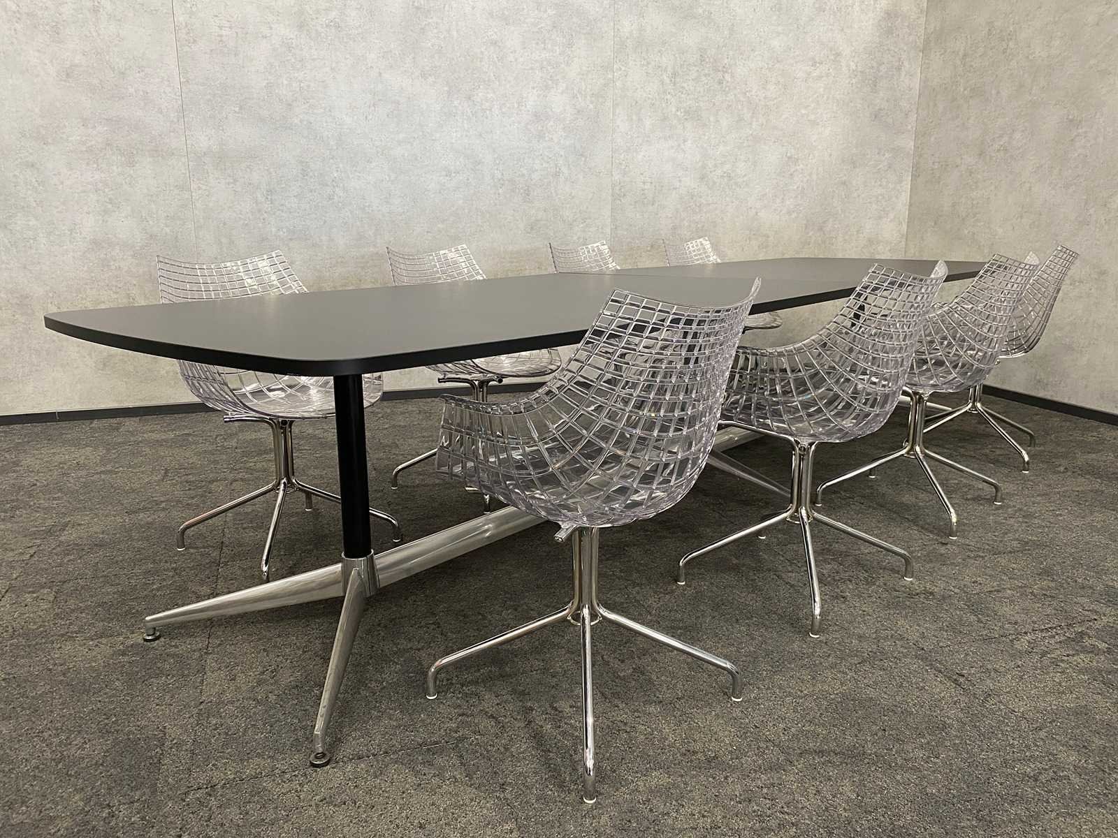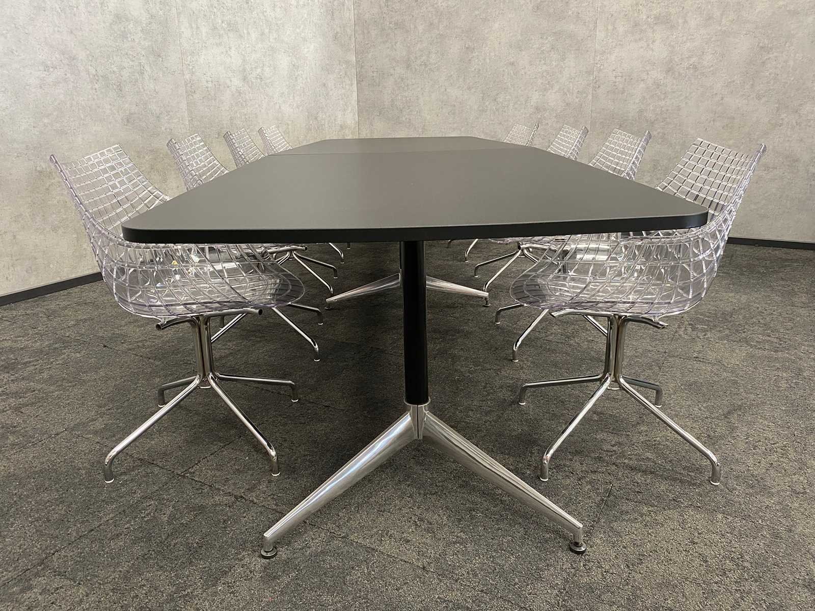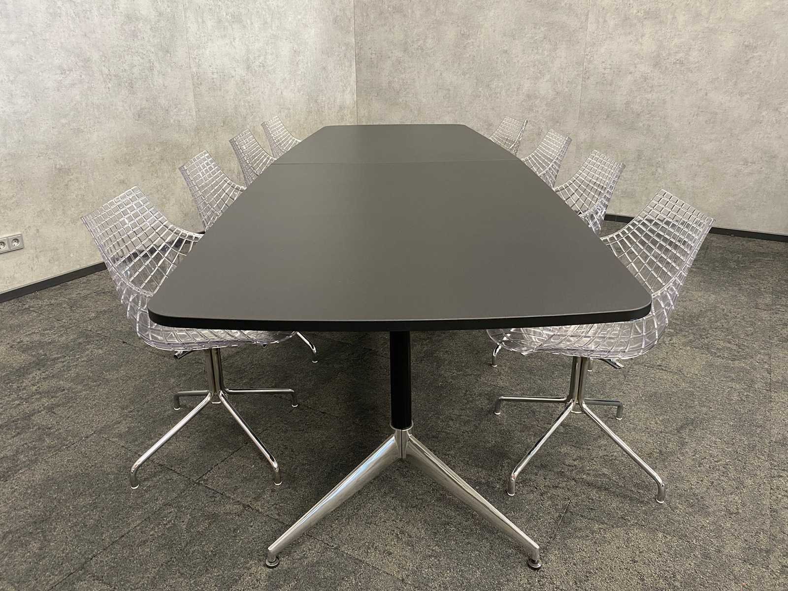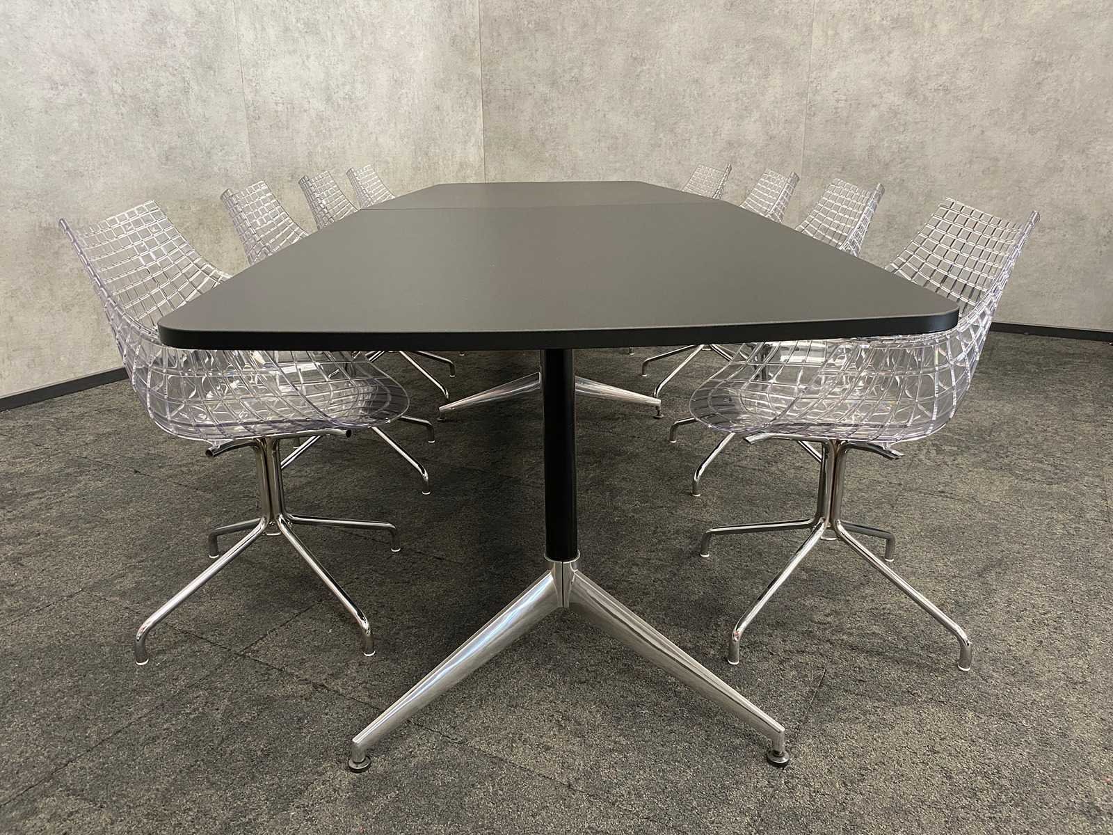 Kavel bestaande uit 8x Driade Meridiana design stoel --- 1x nieuwe vergadertafel v.v. nieuw chroom/zwart stalen frame en 2-delig zwart melamine tafelblad. Tafel is reeds gedemonteerd/ nieuw in doos (LET OP tafelbladen zijn los en onverpakt) Nee Merk: Driade Meridiana Kleur: zwart, chroom, transparant Lengte: 370cm Breedte: 120cm Hoogte: 74cm